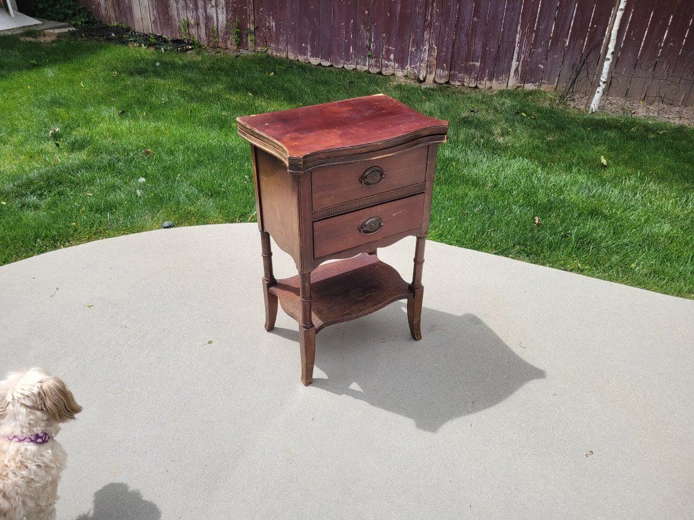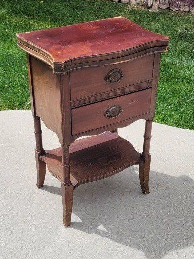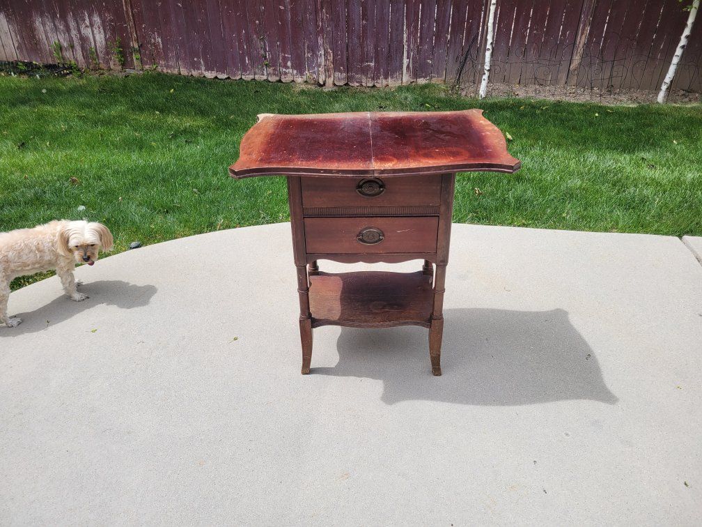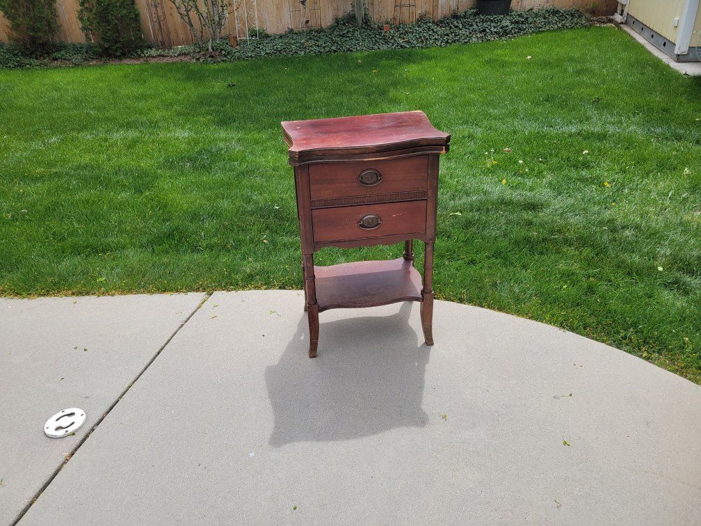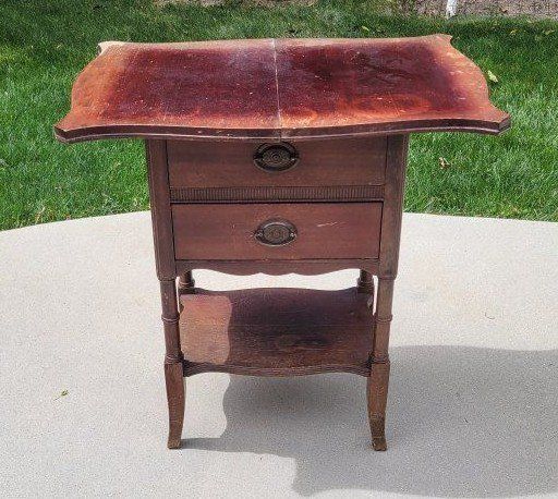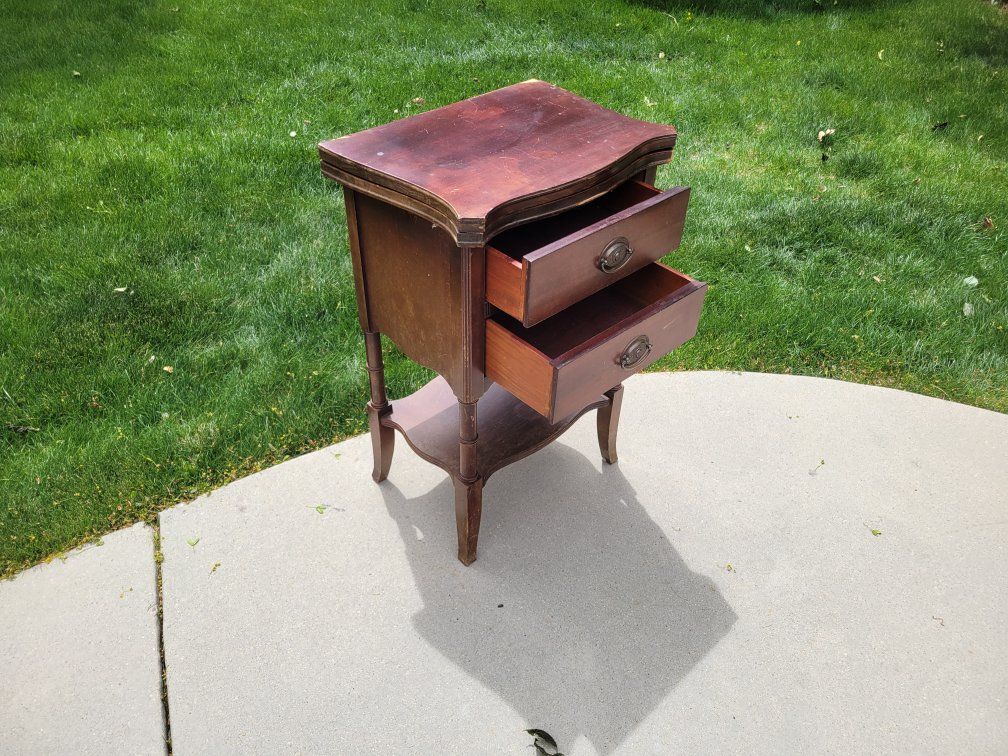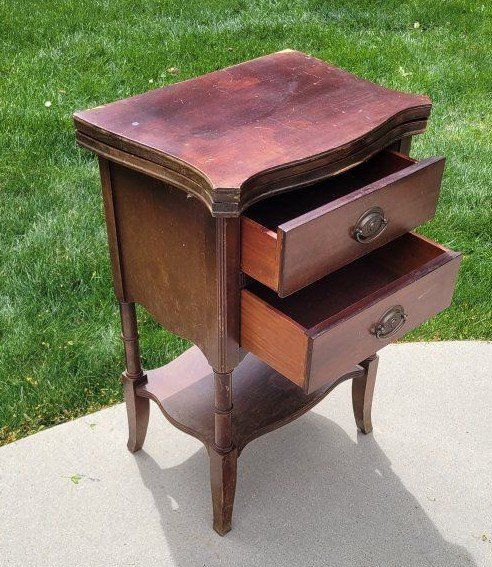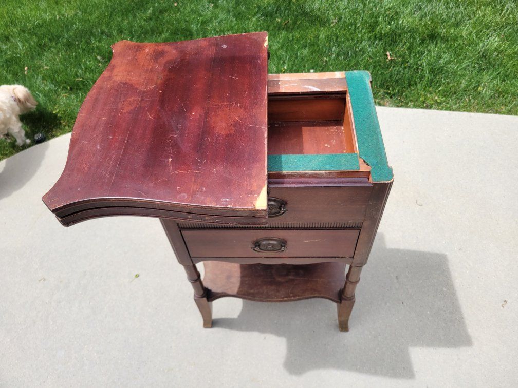 Solid Wood Brass decorative pulls 2 drawers Fold out top. Some cosmetic imperfections from age.