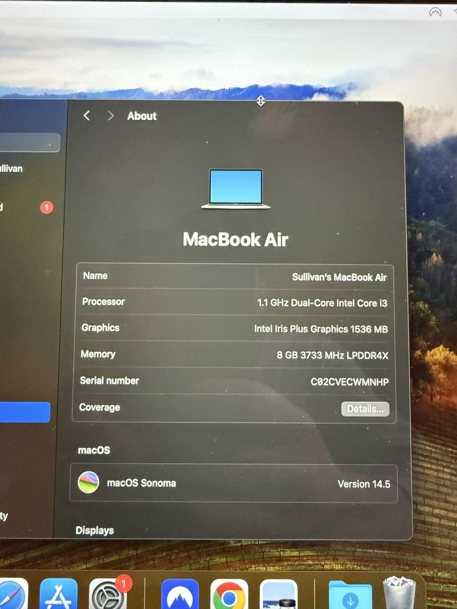 Specs: • 13.3” Retina Display • 1.1 GHz Dual-Core Intel Core i3 • 8GB RAM • 256GB SSD • macOS Sonoma (latest supported OS)