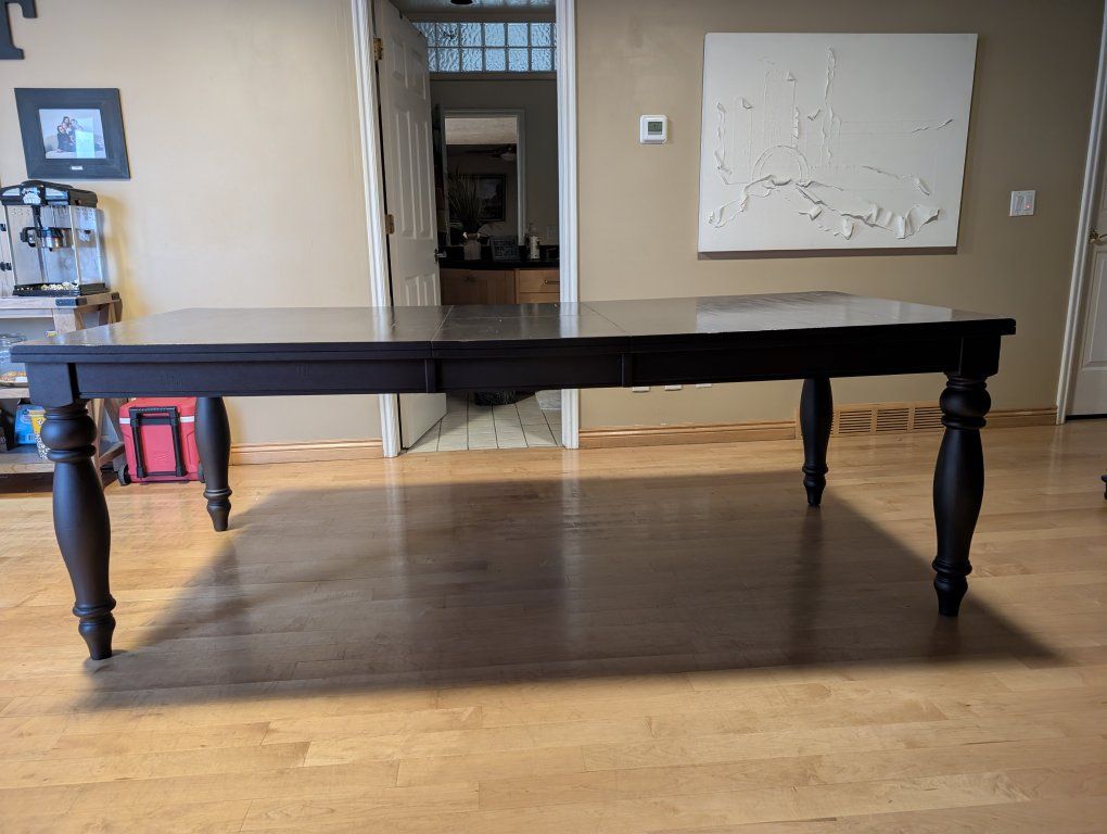 PayPalSolid wood. it's been painted. 7.5 feet long with leaf. 6 ft without, 3.5 feet wide