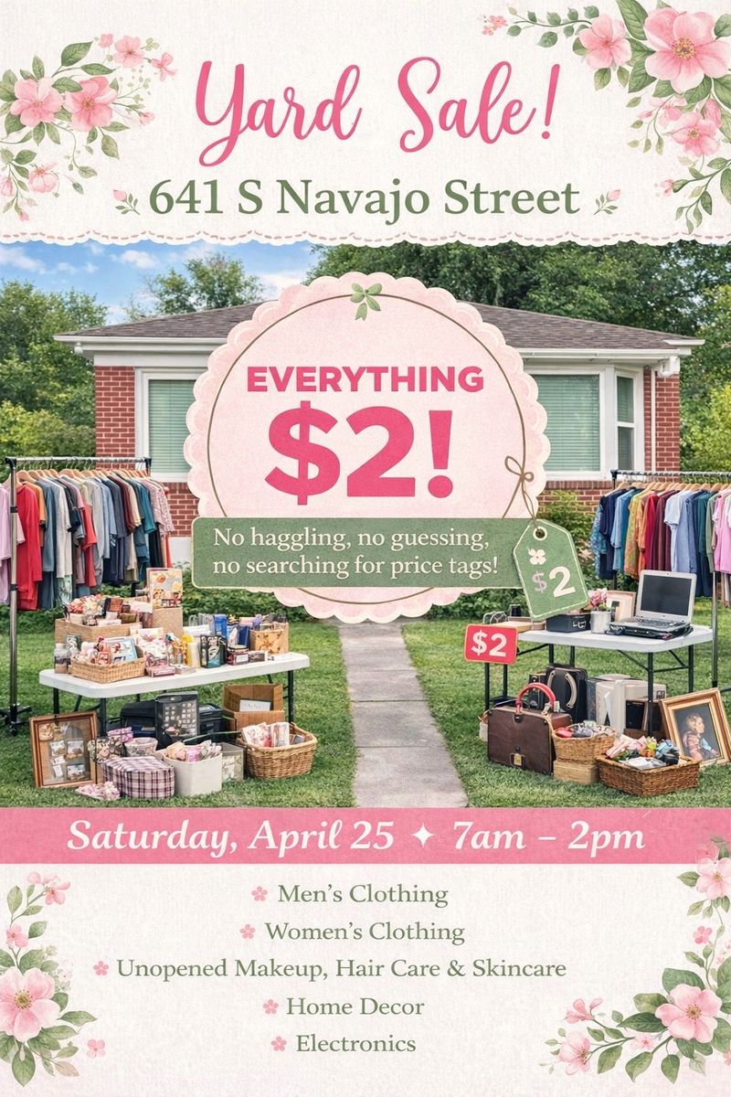 VenmoSaturday, April 25, from 7 AM to 2 PM. Everything will be $2. No haggling, no guessing, no searching for price tags. We’ll be selling men’s and women’s clothing; unopened makeup, hair, care, and skin care items; home decor; and electronics. All from a clean, smoke- free, child-free home. 641 S. Navajo Street.