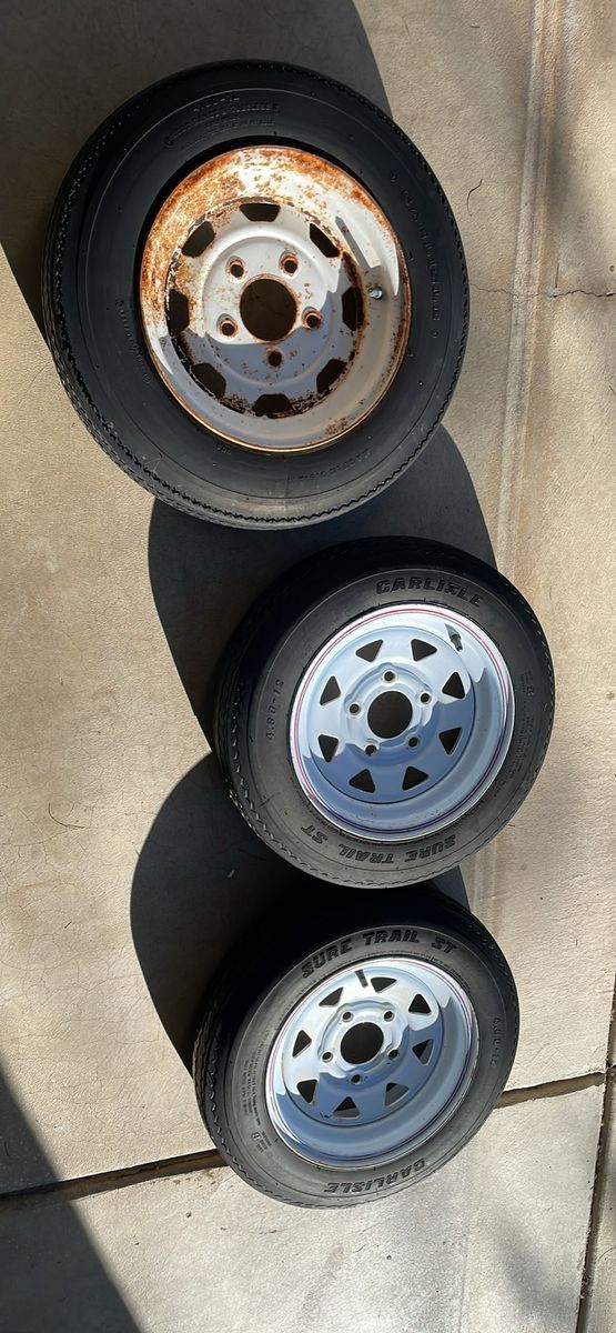 Pulled these off my boat trailer to put a bigger size on. The rim that looks the worst was the spare. They still have plenty of tread on them.