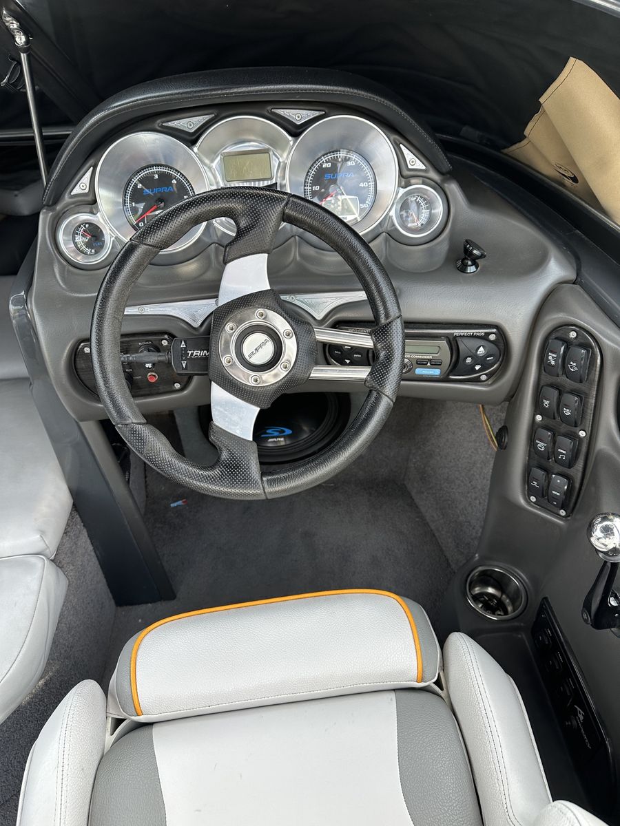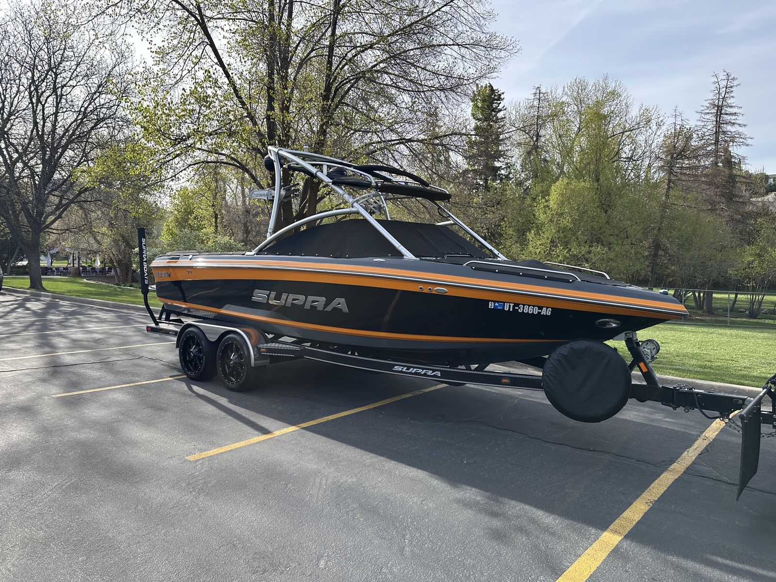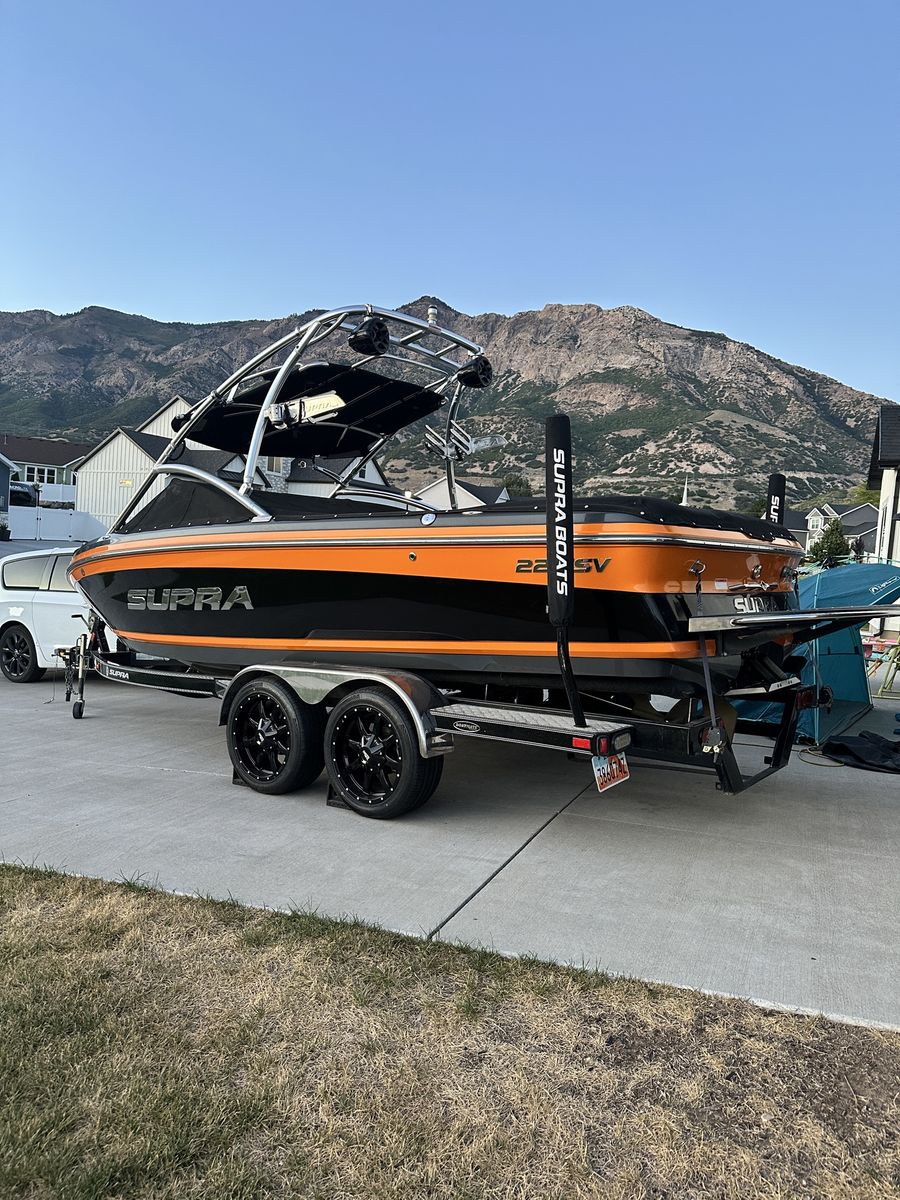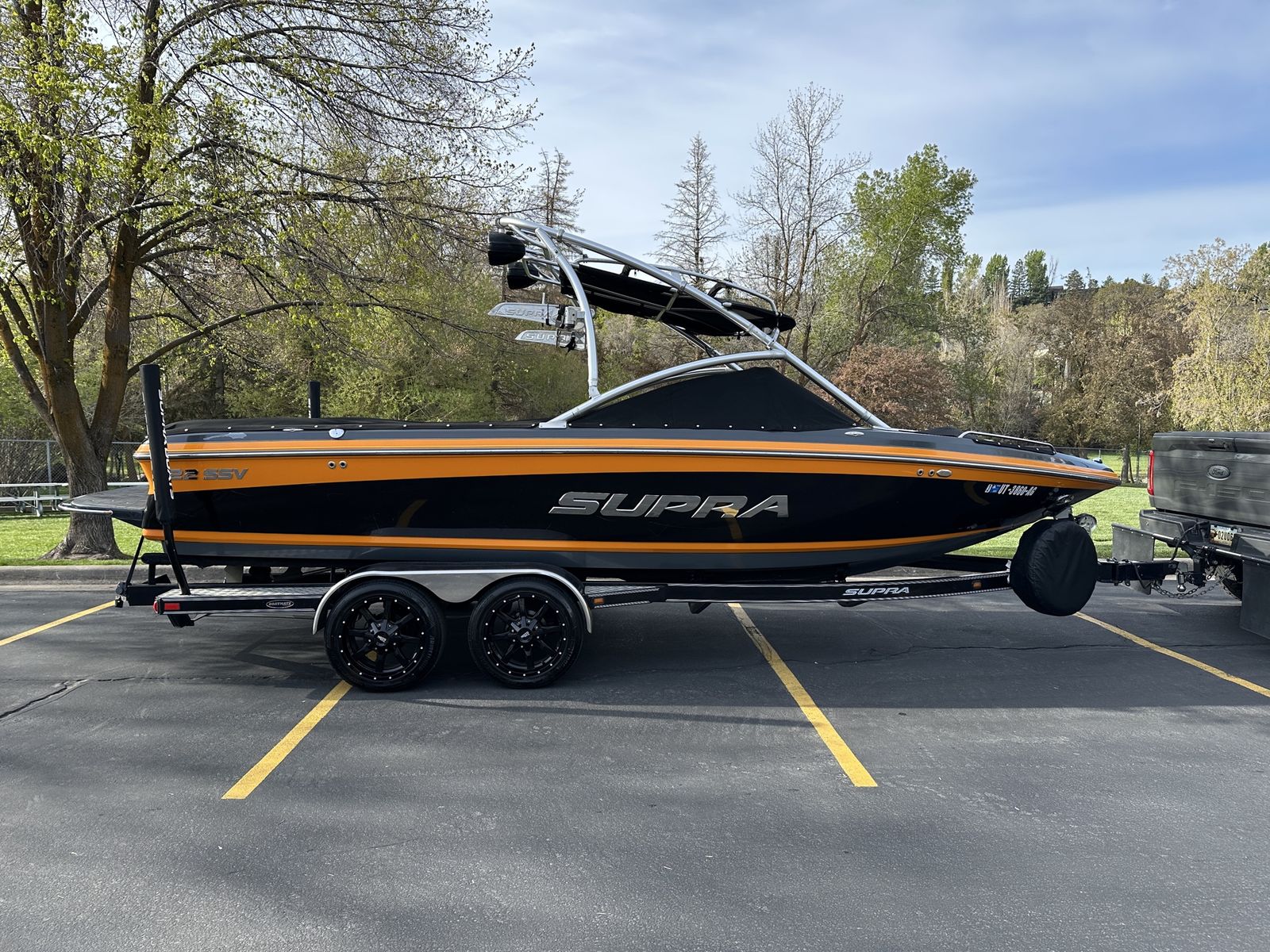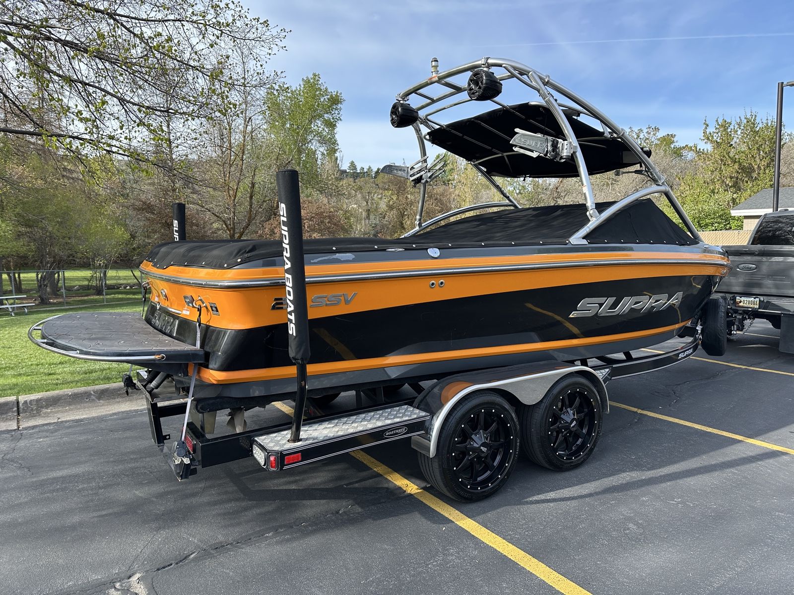 2008 Supra Launch 22SSV, 22’ wake and surf boat in great condition and ready for the water. This has been an awesome family boat that throws a great wake for both wakeboarding and surfing. It has 730 hours and runs strong with no issues. Trailer has 18” wheels and brand new tires. Bearings were recently serviced. Equipped with Perfect Pass cruise control, rear and center ballast, heater, bimini top, swivel board racks plus additional top rack storage, and plenty of seating and storage throughout.