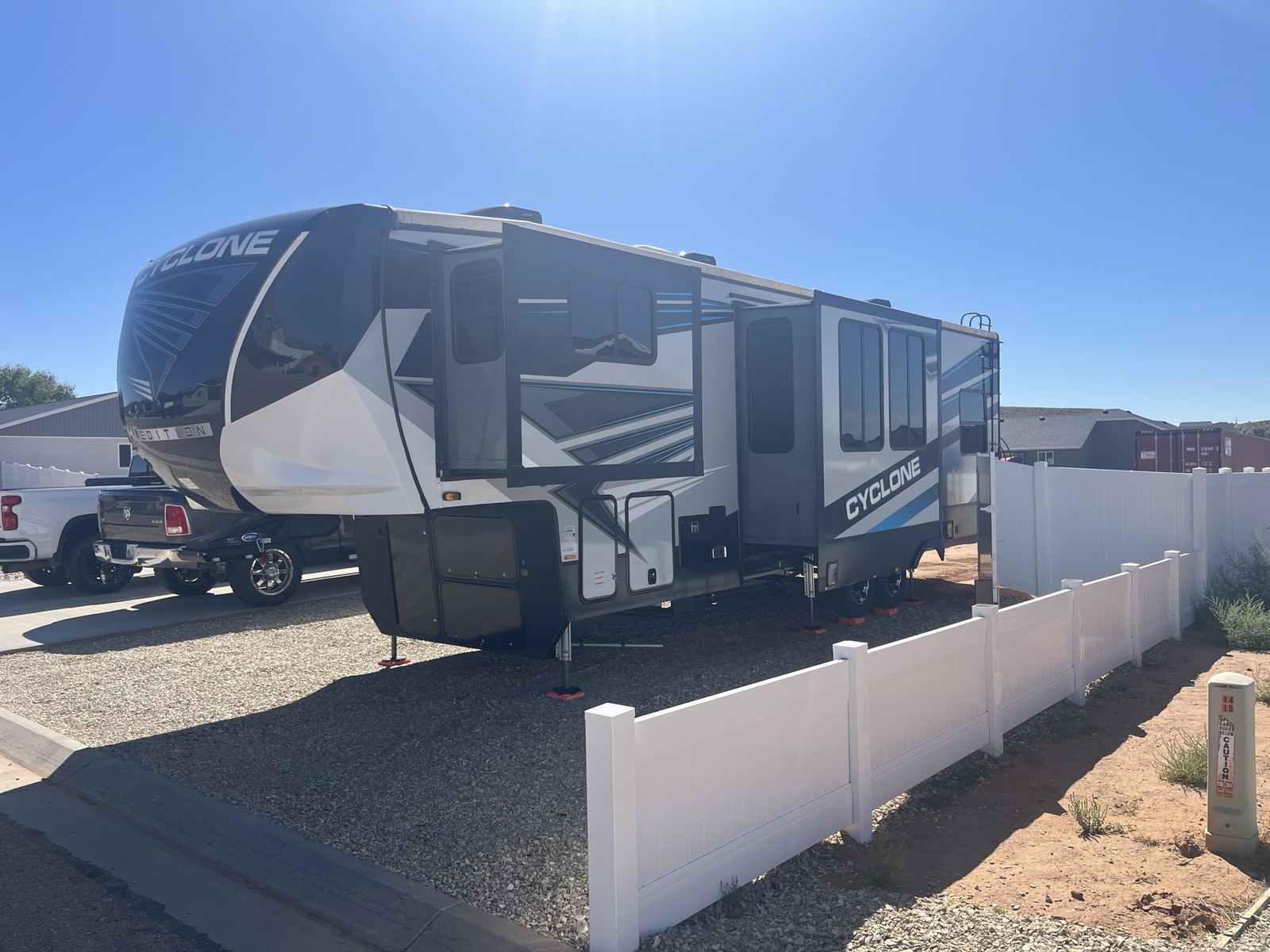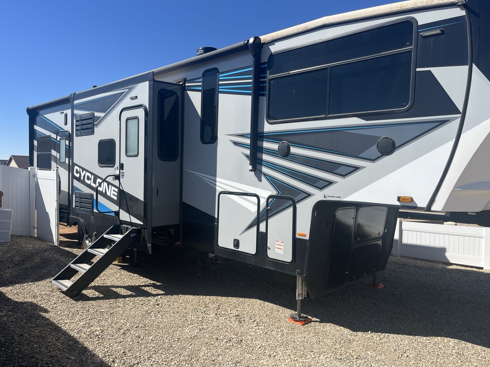 2022 cyclone 3414, super nice trailer, 13.5 garage, patio kit, 3 season sliding door, 3 awnings, 3 ac units, gen set, 30 gallon aux fuel tank, tons of storage and tons more to list! Contact me for more details.