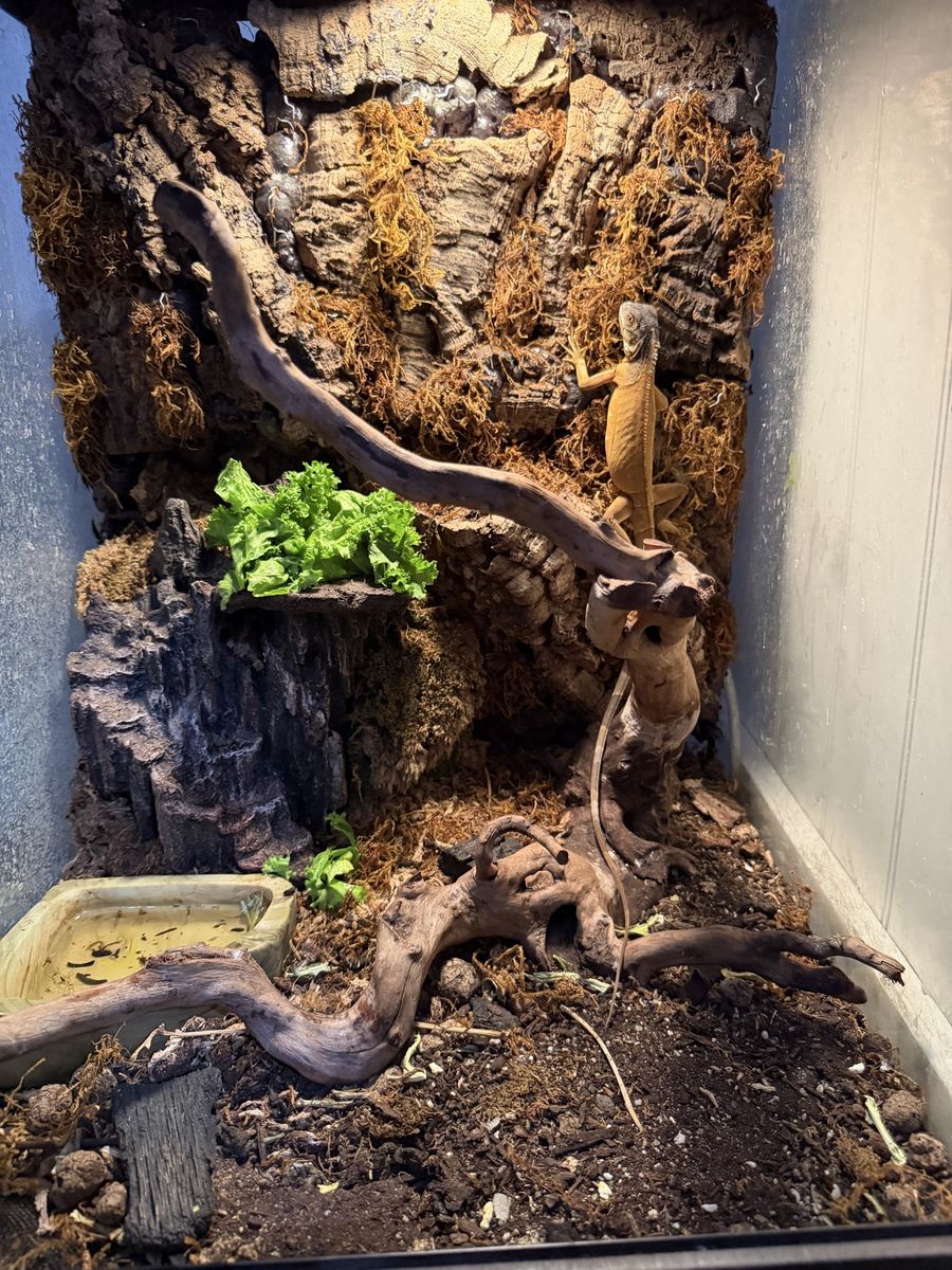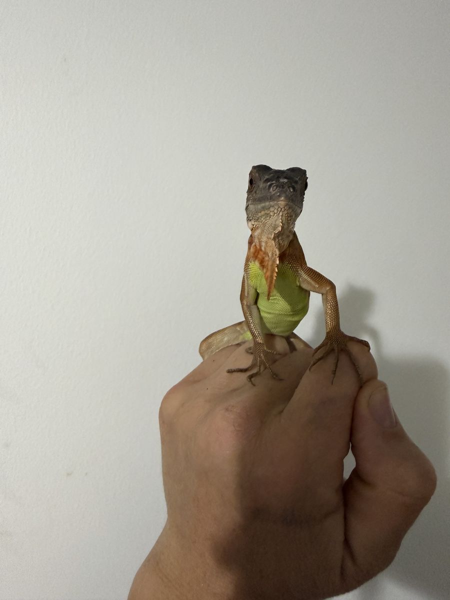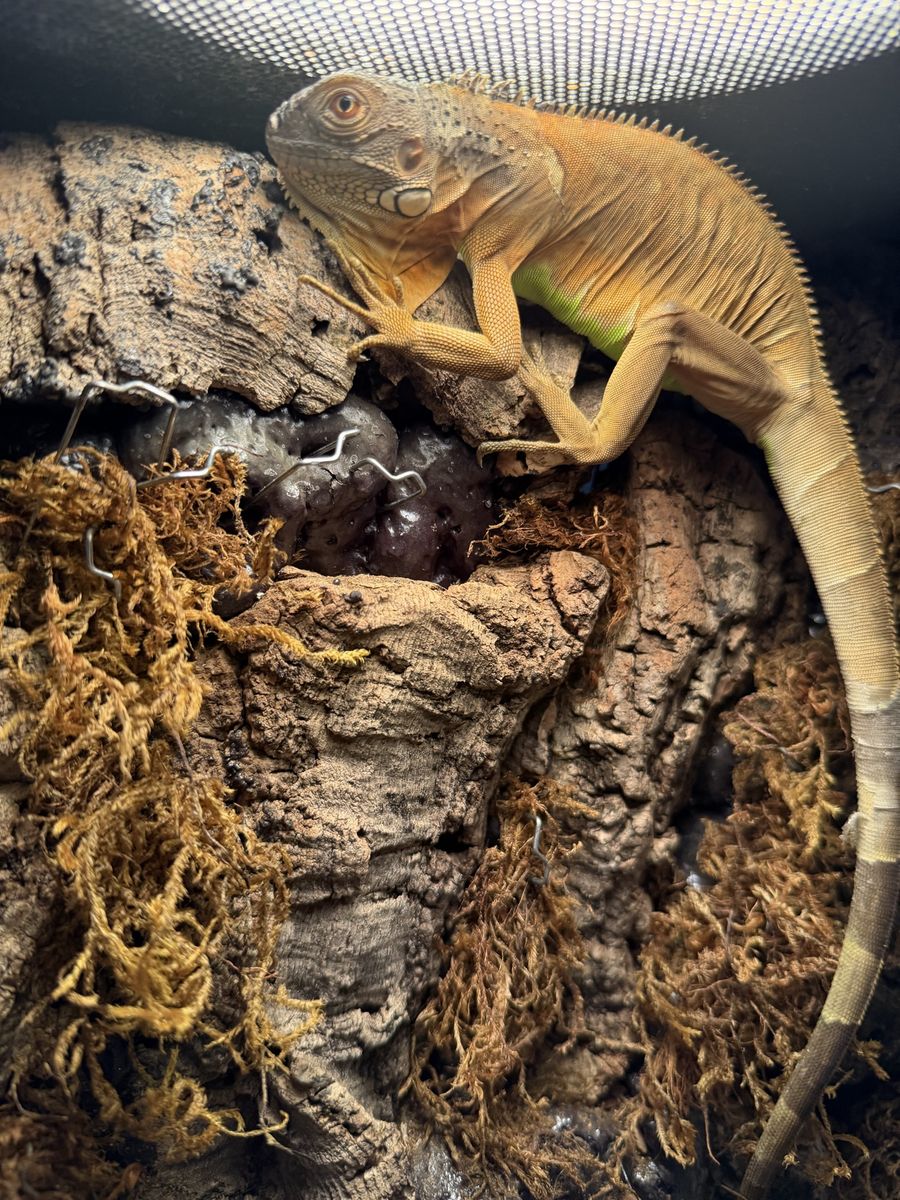 8 Month old healthy red iguana with cage and light. The cage is about 2x2x2.5 feet. Includes water bowl and basking branch. He has a beautiful green belly, and his coloring will get more pronounced as he gets older. He eats greens and is trained to drink from a water bowl. We also give him warm water soaks to help with sheds and hydration.