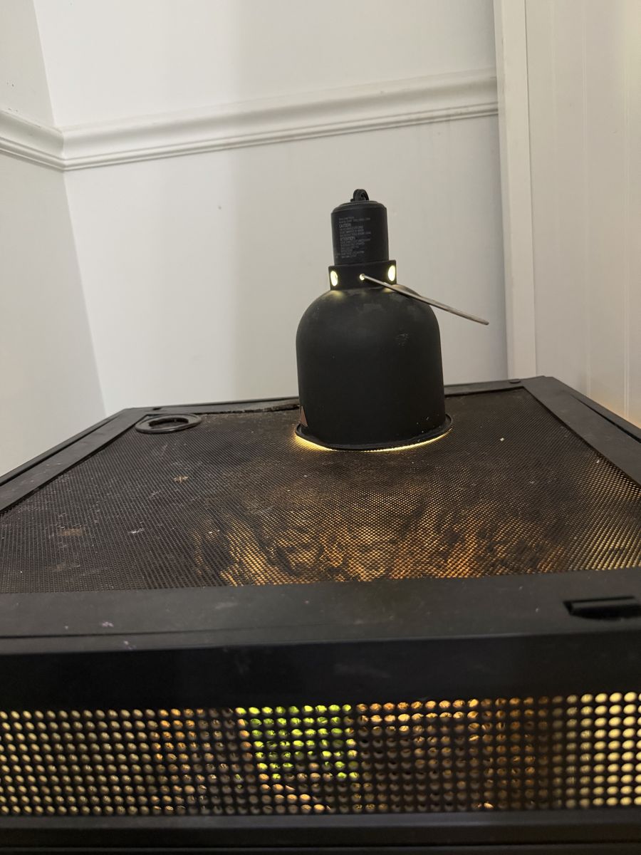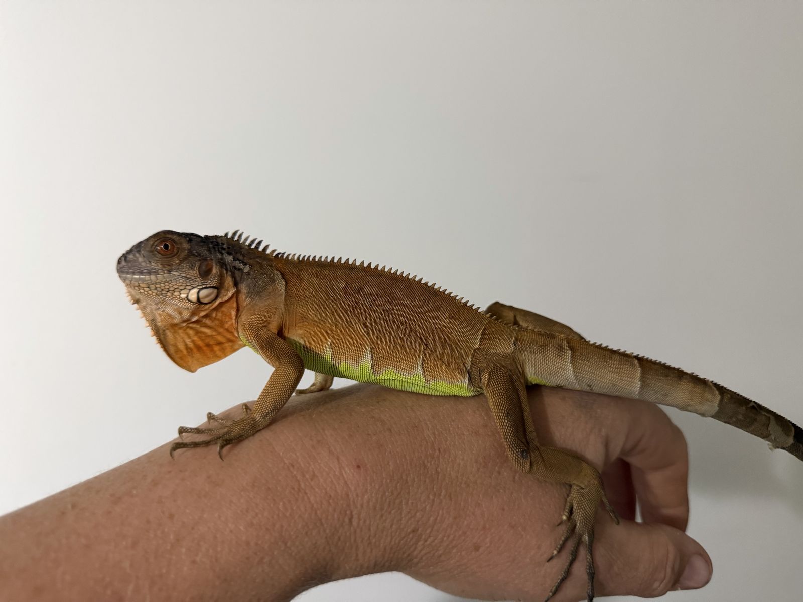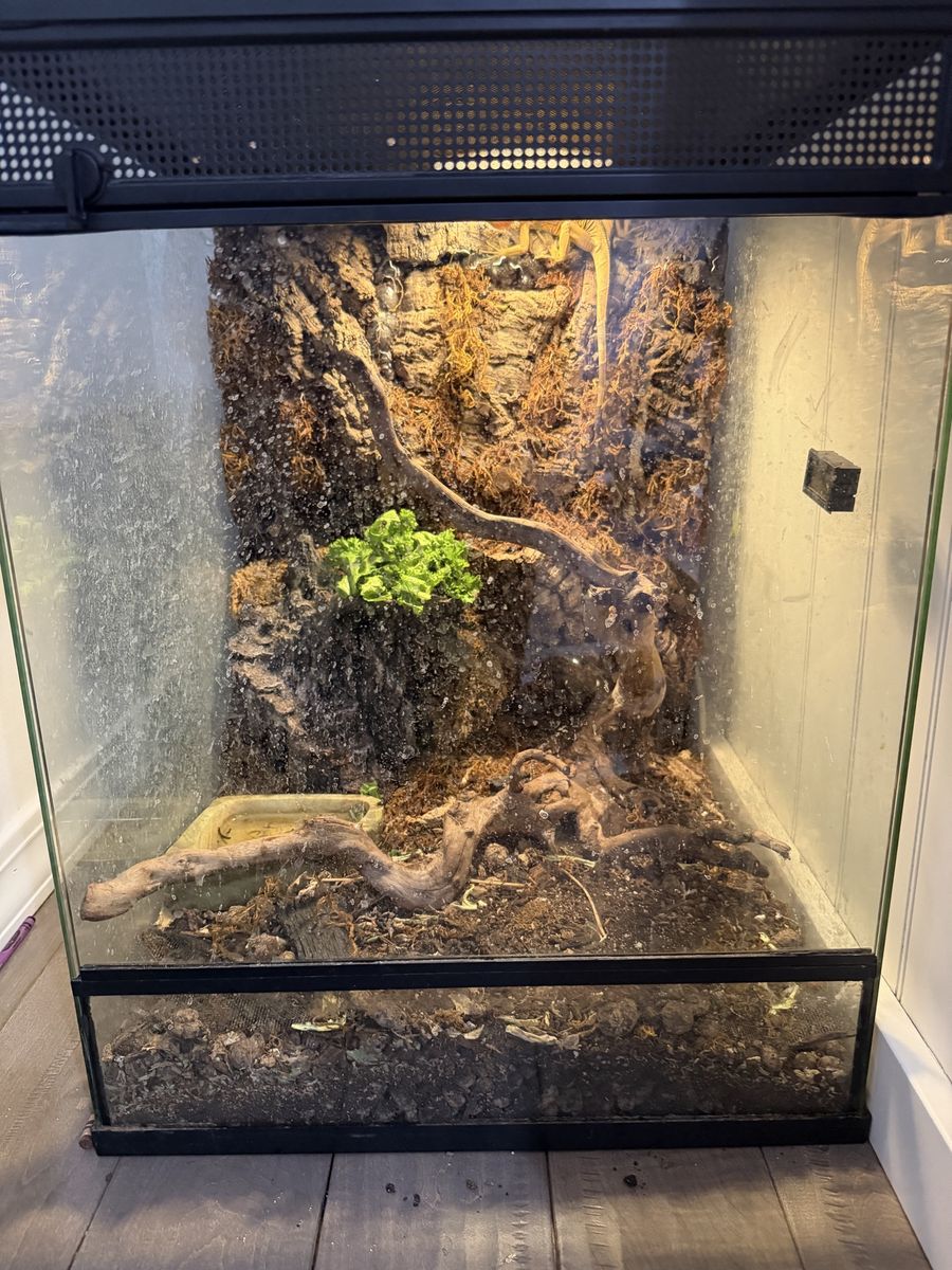 8 Month old healthy red iguana with cage and light. The cage is about 2x2x2.5 feet. Includes water bowl and basking branch. He has a beautiful green belly, and his coloring will get more pronounced as he gets older. He eats greens and is trained to drink from a water bowl. We also give him warm water soaks to help with sheds and hydration.