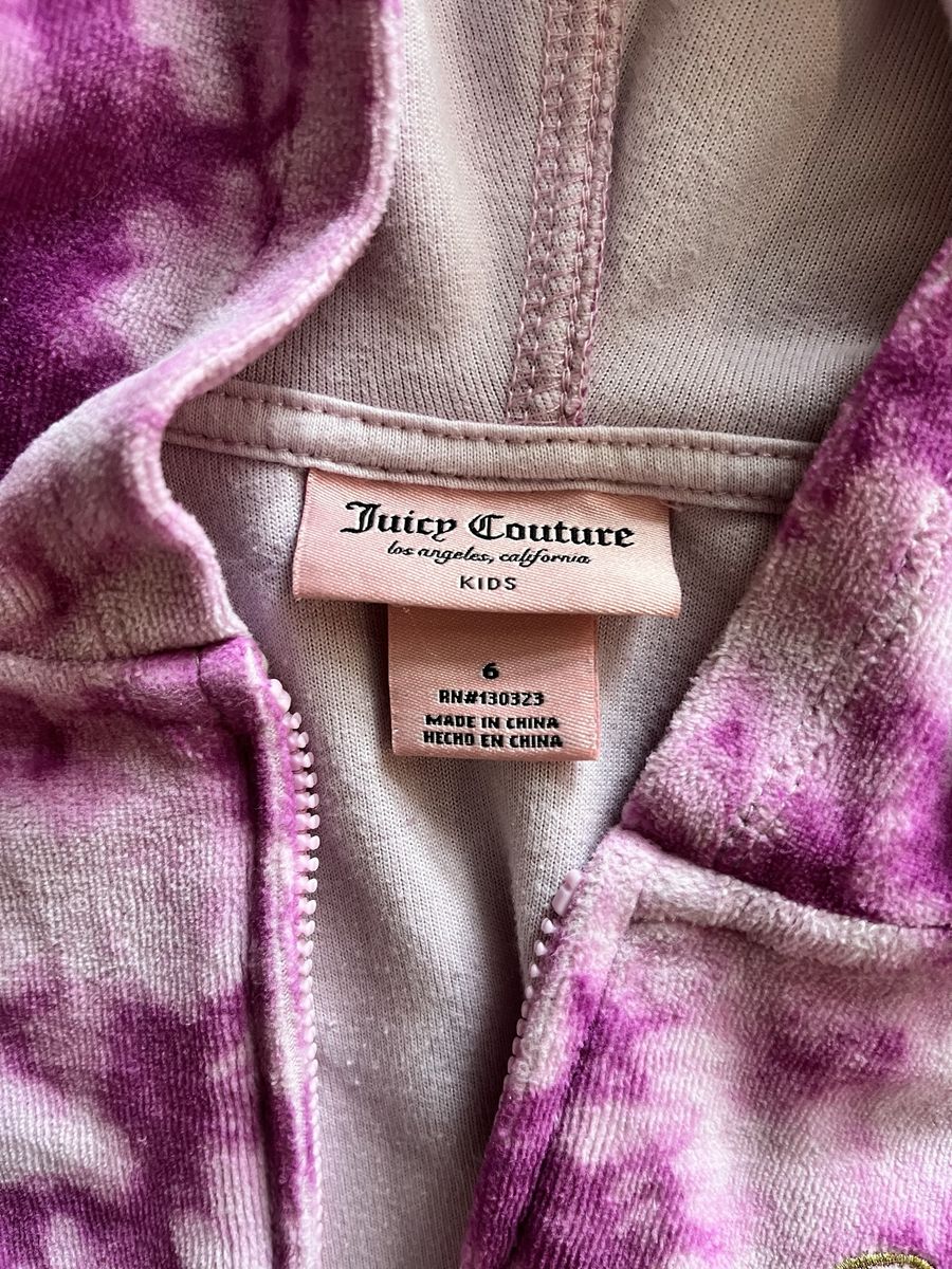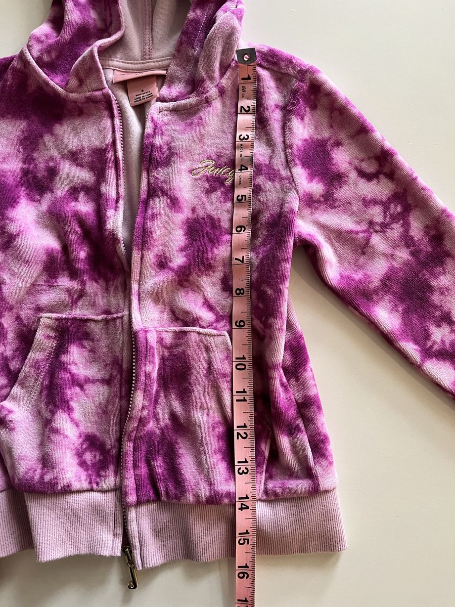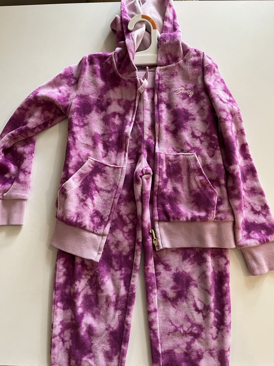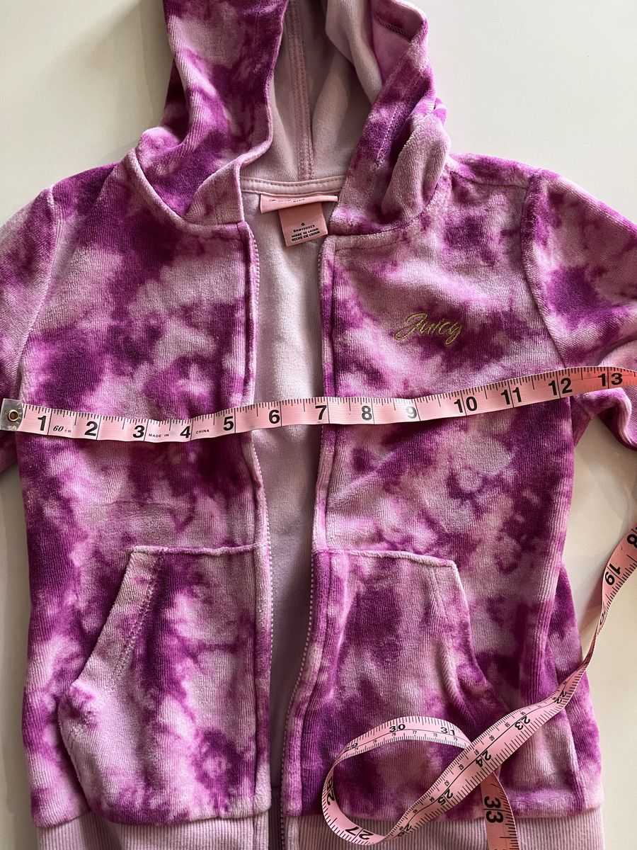 Super cute Juicy Couture hoodie + joggers set in pink/purple tie‑dye. Size 6. Excellent condition — no flaws. Soft, comfy, and perfect for school or play. See photos for measurements