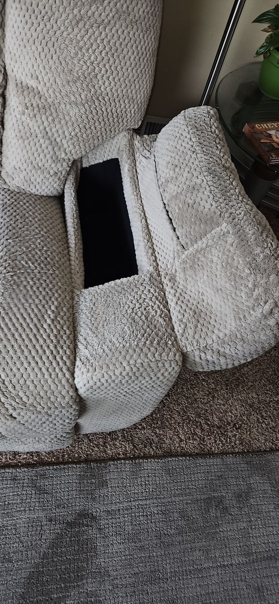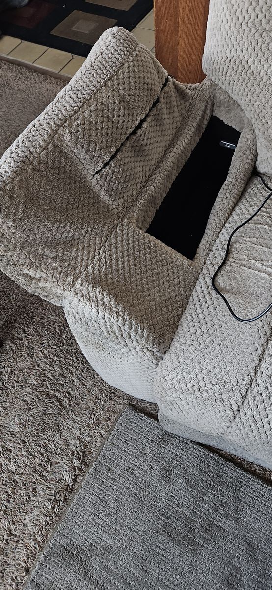 It has storage compartments in the armrests on each side. Built in vibrating massage with remote. It has power to the chair with USB port.