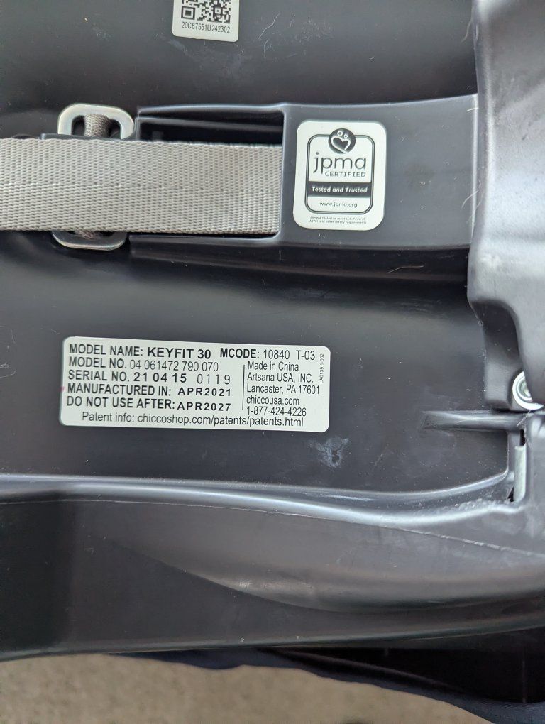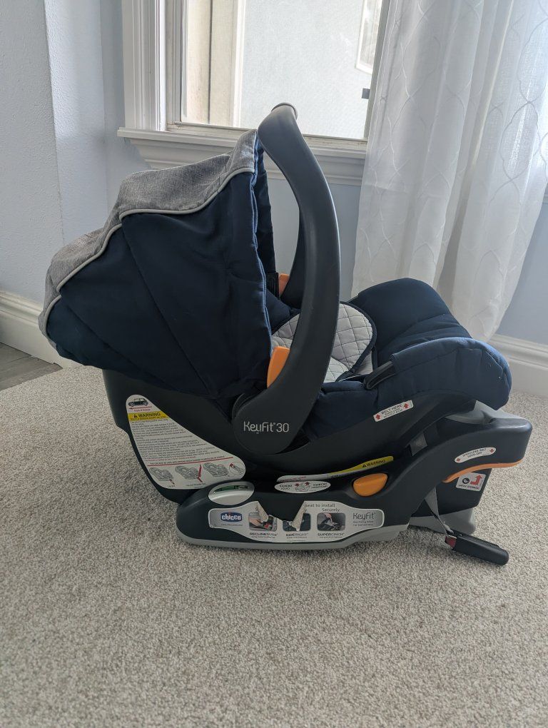 Infant car seat with base. Latch system and seat belt options for securing. Expires 04/27. Excellent used condition, minor wear. Washable infant support pads. $75 OBO