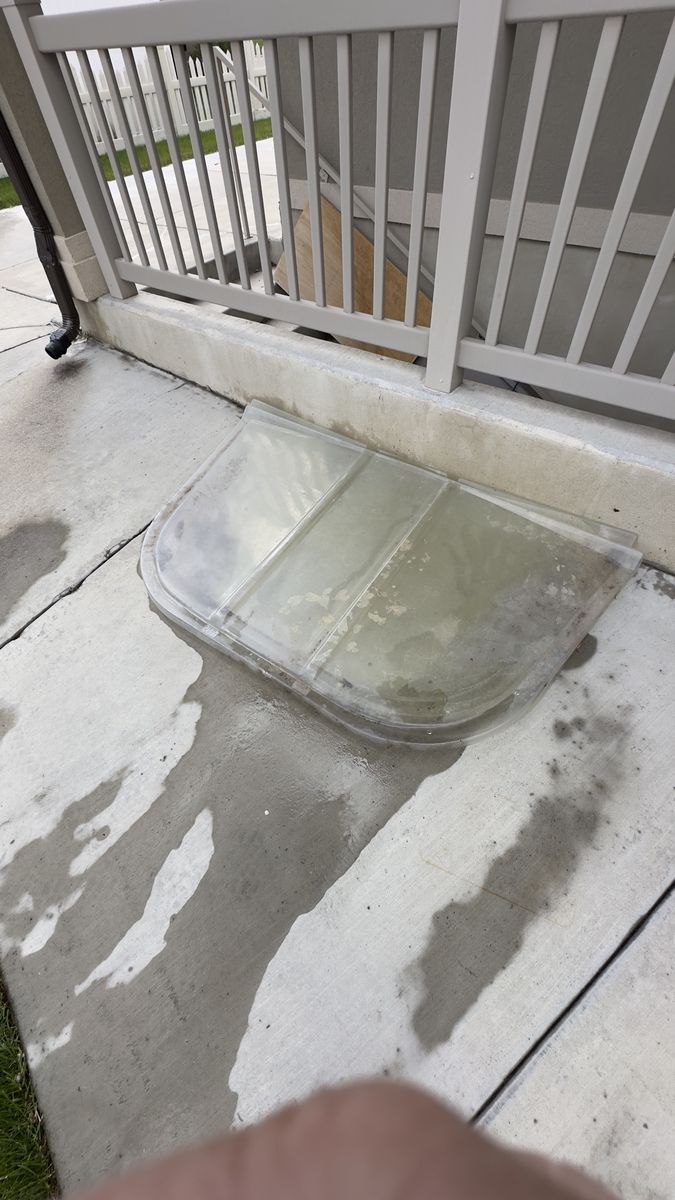 Four ea large plastic window well covers. 3 ea 65 in x 38 in. One ea 54 in x 38 in. Needs cleaning/ buffing or can be used in gardening