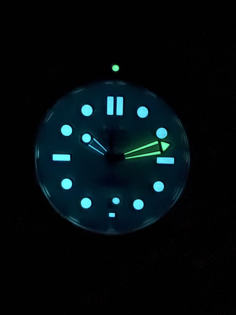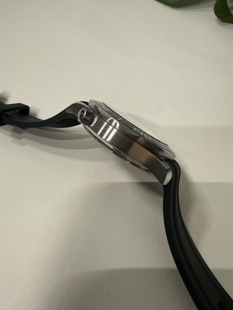 Very good pre-owned condition. The ceramic bezel is mint. The sapphire crystal is clear, though there are a few tiny "flea bite" marks in the outer AR coating visible only at certain angles. Light hairlines on the polished lugs and buckle from normal use. No deep scratches or dings.