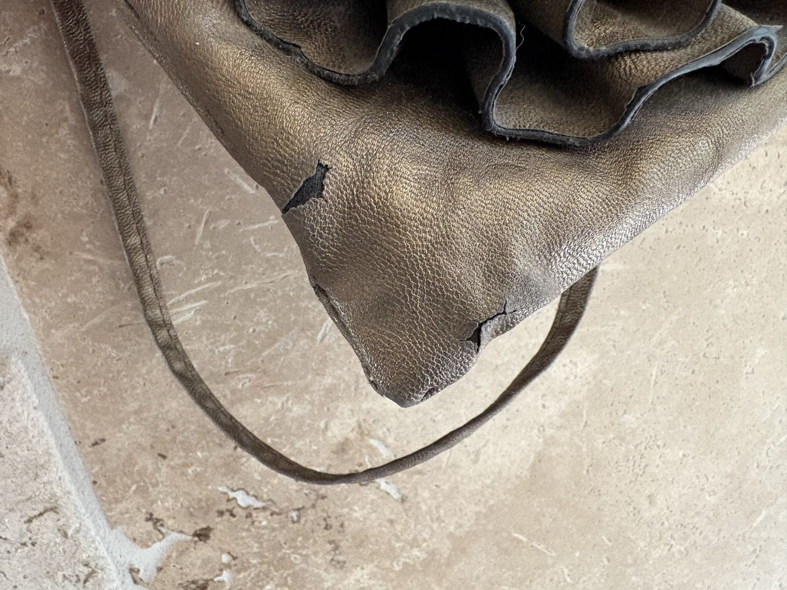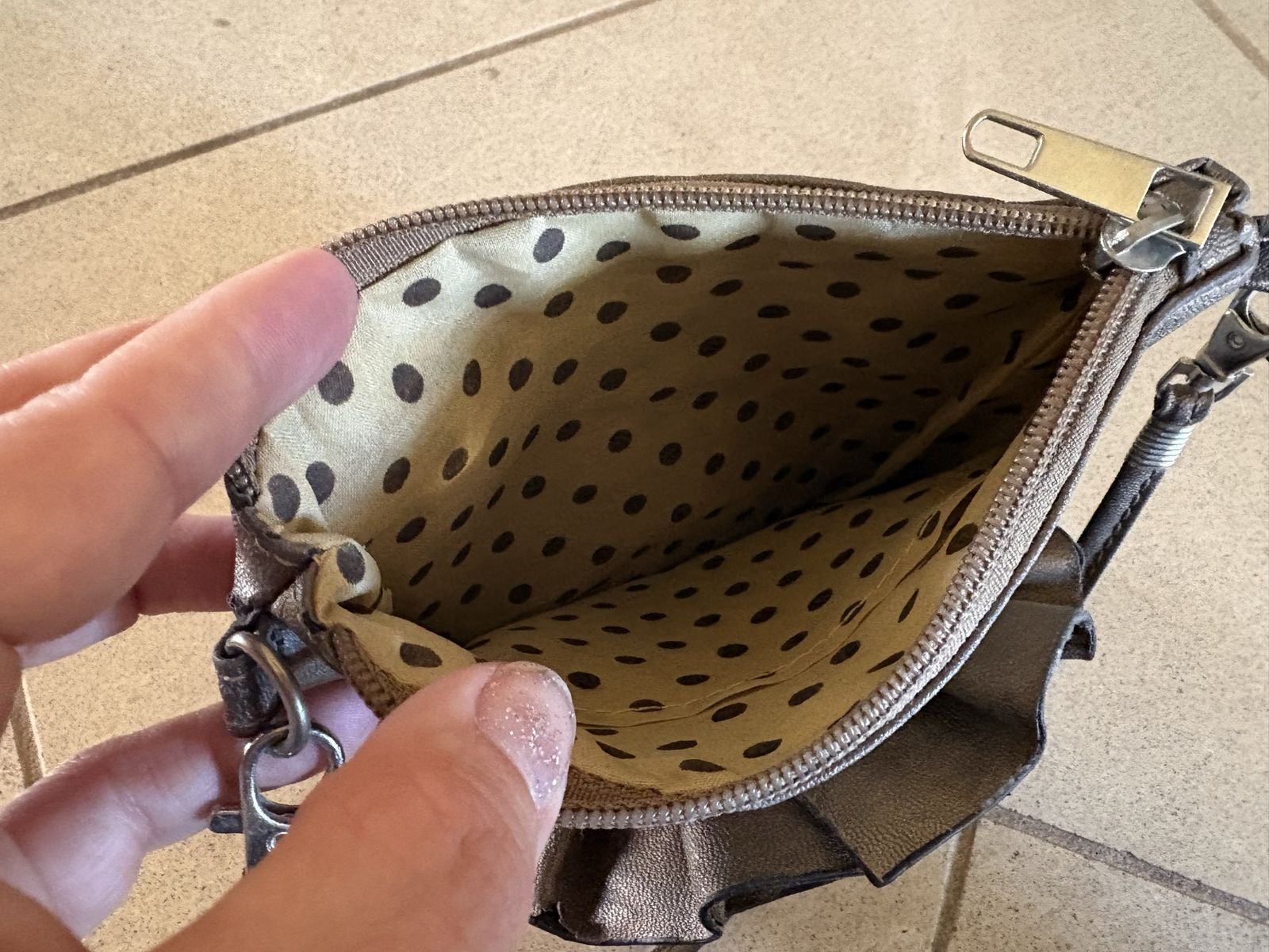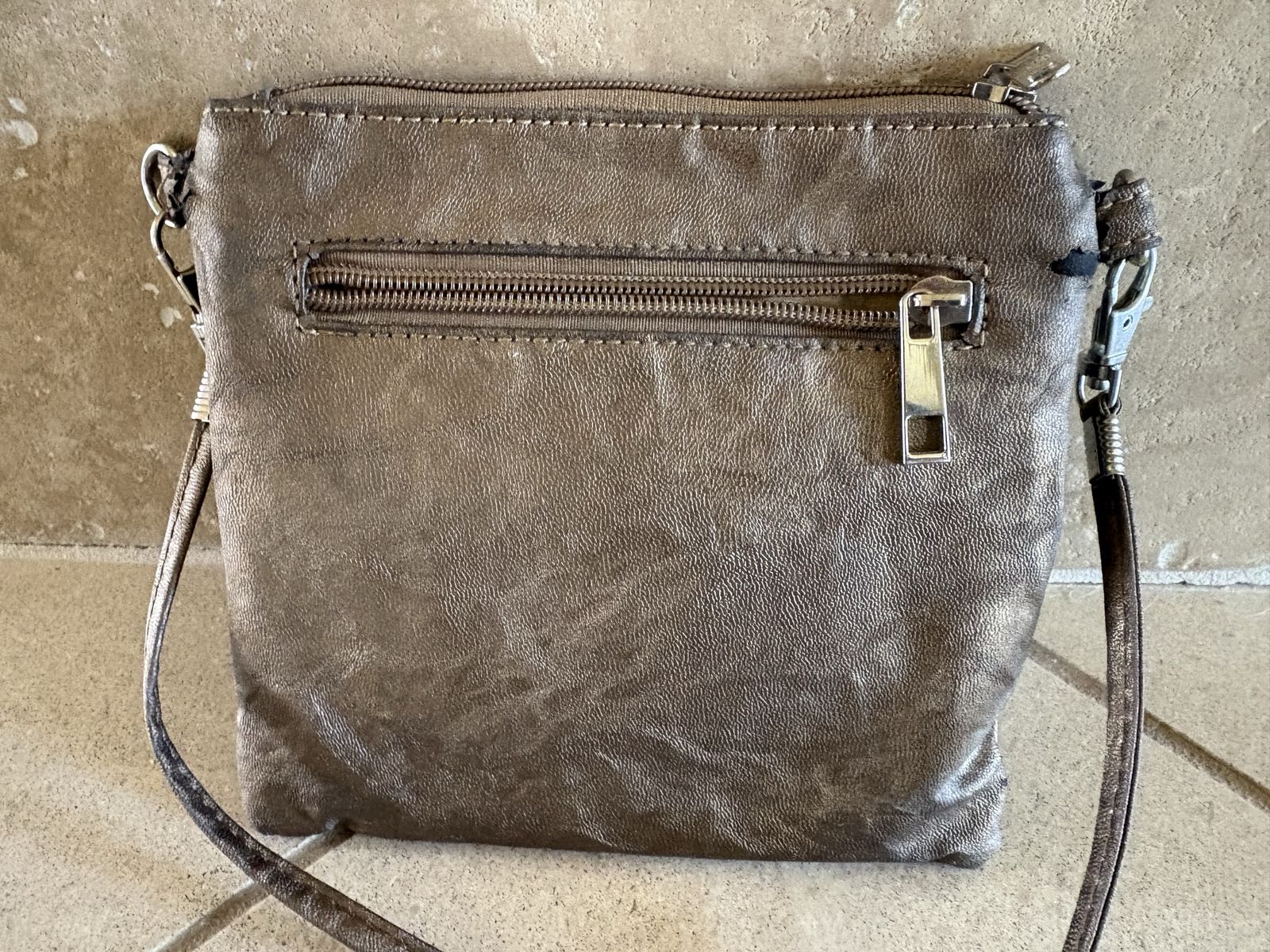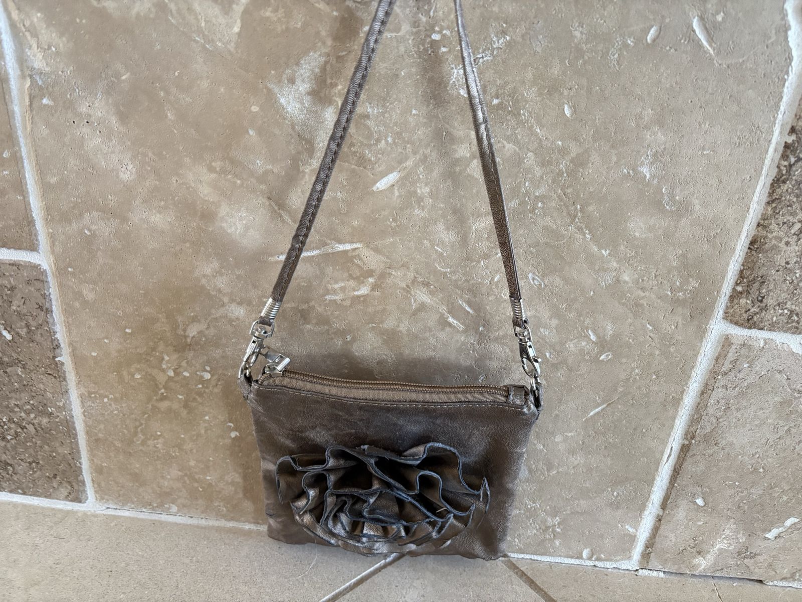 I have a cute metallic colored purse with a large raised flower on one side. It is 6 3/4 inches wide and 6 1/2 inches tall. The strap adds another 8 1/2 inches and is detachable. It has a zipper closure and a small zipper pocket on the outside. The inside is polka dotted and has a small open top pocket. Unfortunately there are a couple of spots near the bottom corners where the faux leather has cracked (see the last picture). I’m asking just $5. See my other ads for jewelry, artwork, home decor and more.
