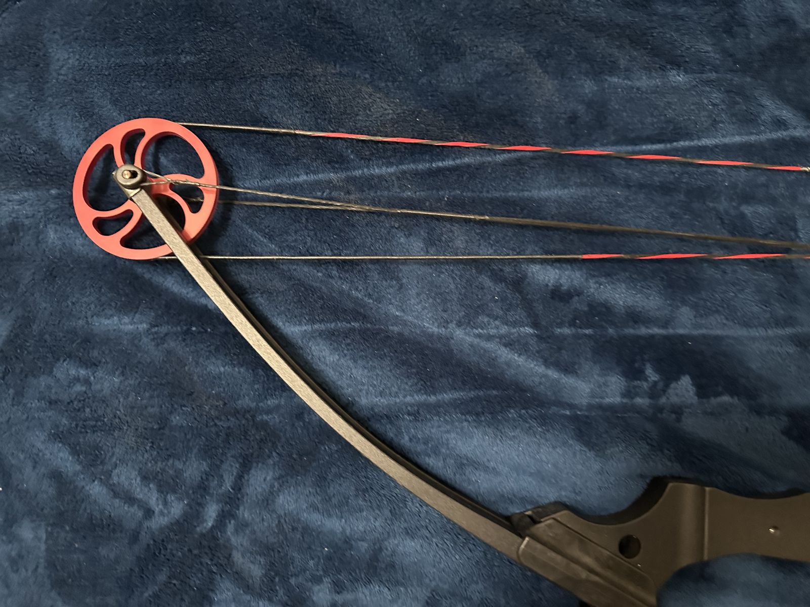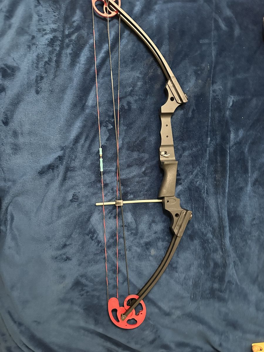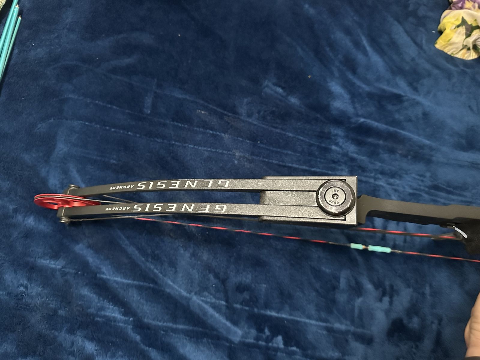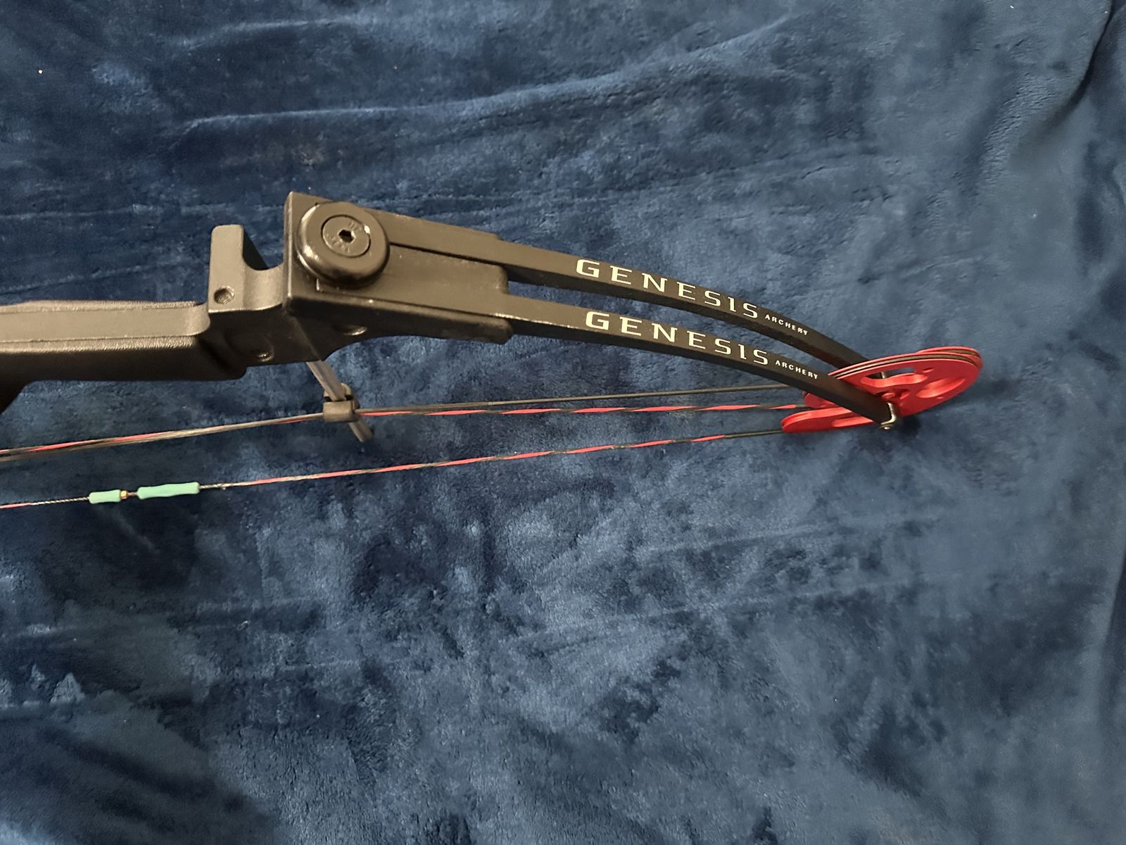 Selling a Genesis Gen-X compound bow in black with red accents, right-handed setup. Great bow for beginners or experienced archers. Lightweight, reliable, and ready for use.