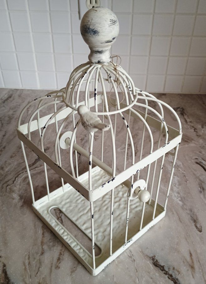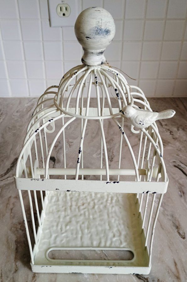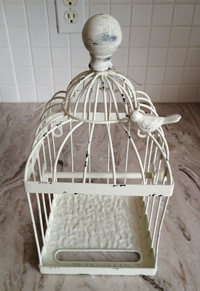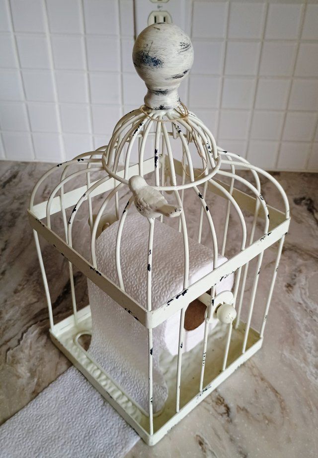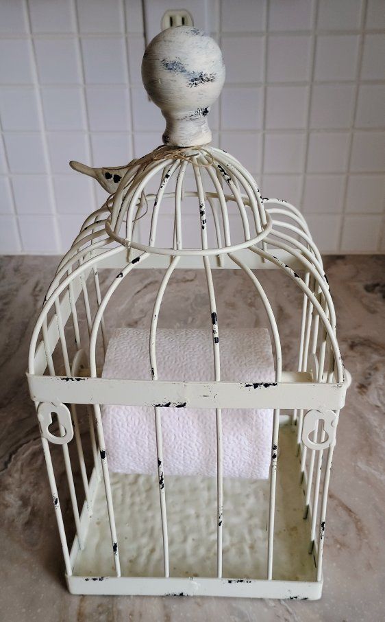 VenmoShabby chic metal, white birdcage toilet paper holder. Hangs on the wall. Measures 12.25" tall and 6" X 6" square. Smoke and pet free home