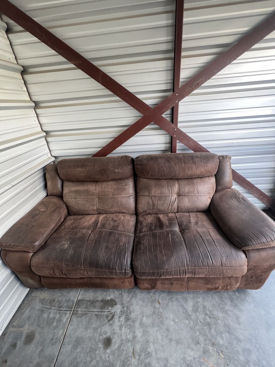 ApplePayAuto-reclining brown faux leather loveseat. Both sides work and each side interlocks together. Has been in storage but is easy to clean, soft, and comfortable. - Pick-up in Layton.