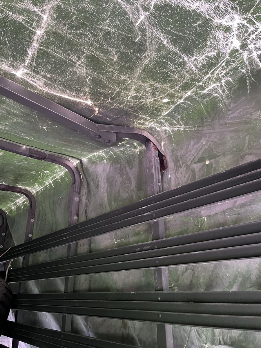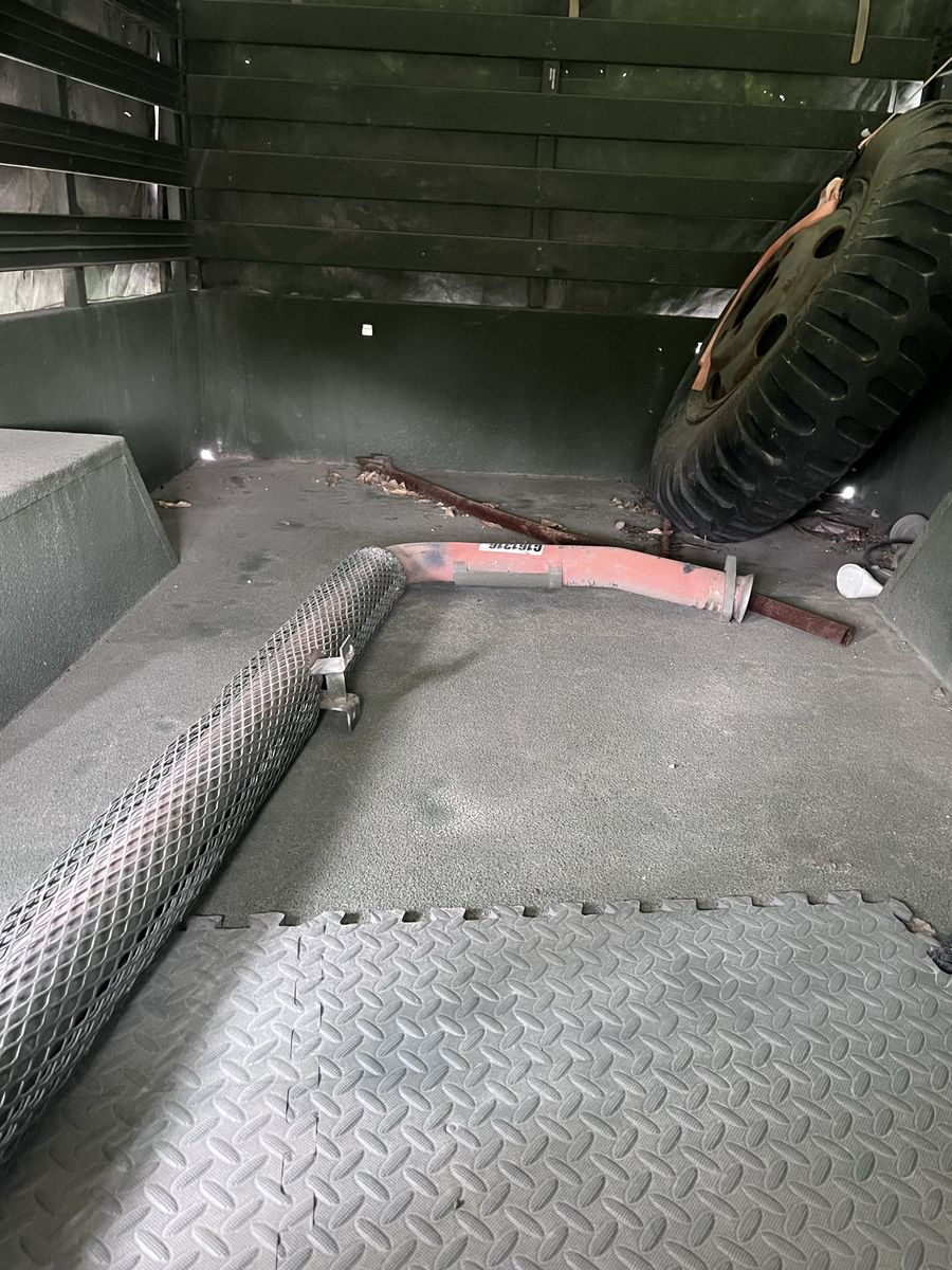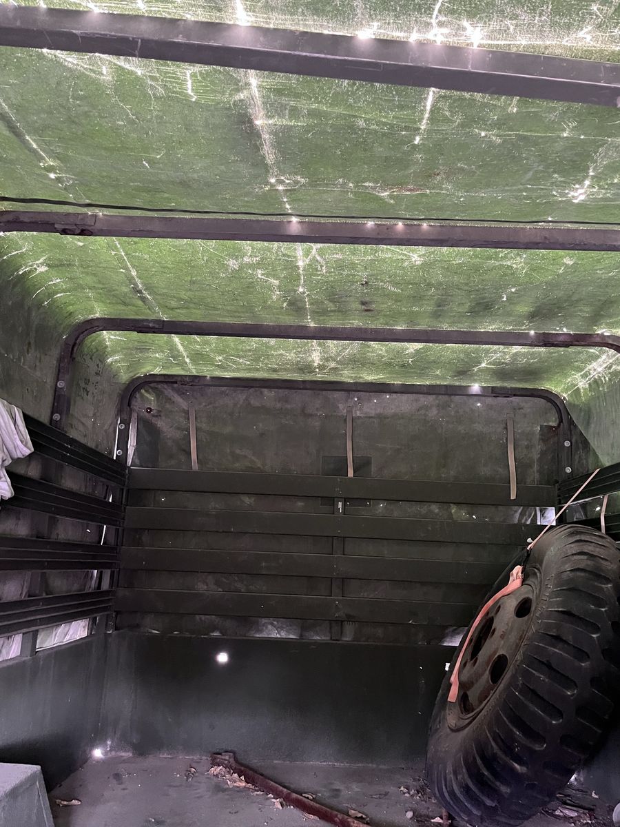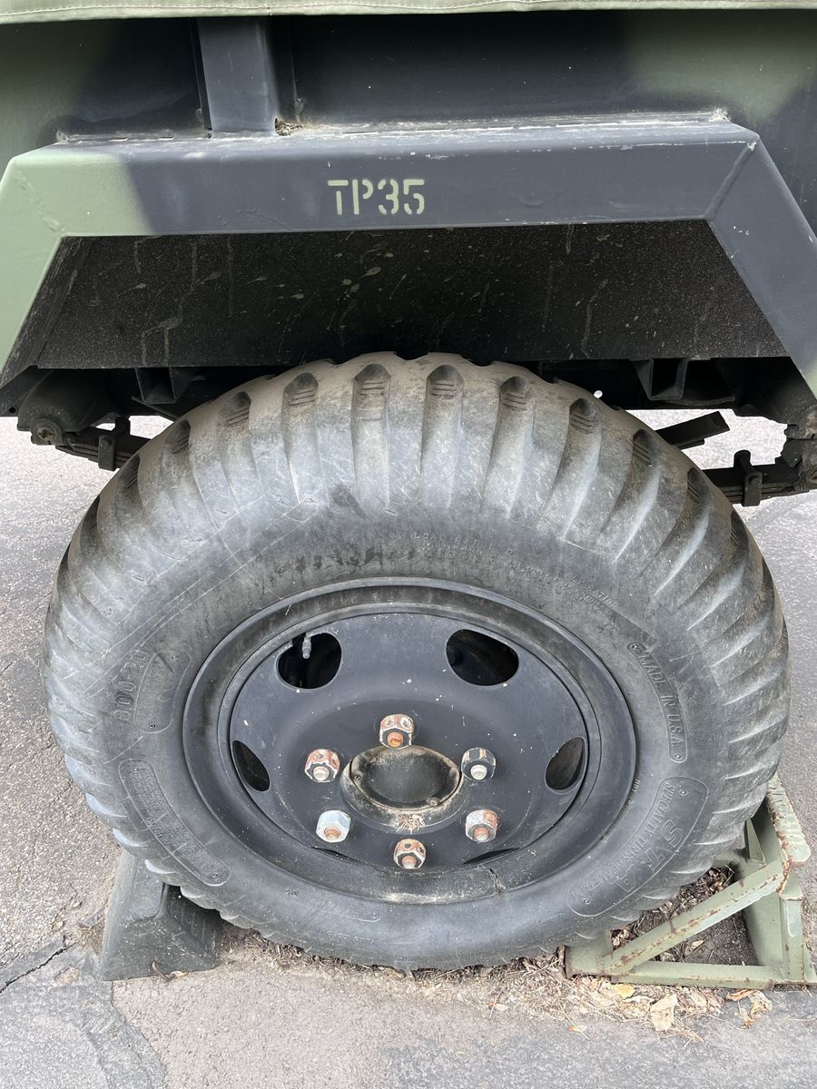 VenmoHeavy-duty military cargo trailer has a classic three-color camouflage paint scheme and a removable green canvas cover. This unit features a pintle hitch connection and a spacious interior bed. It includes a spare tire. The frame is solid metal with functional tail lights and a front jack stand.