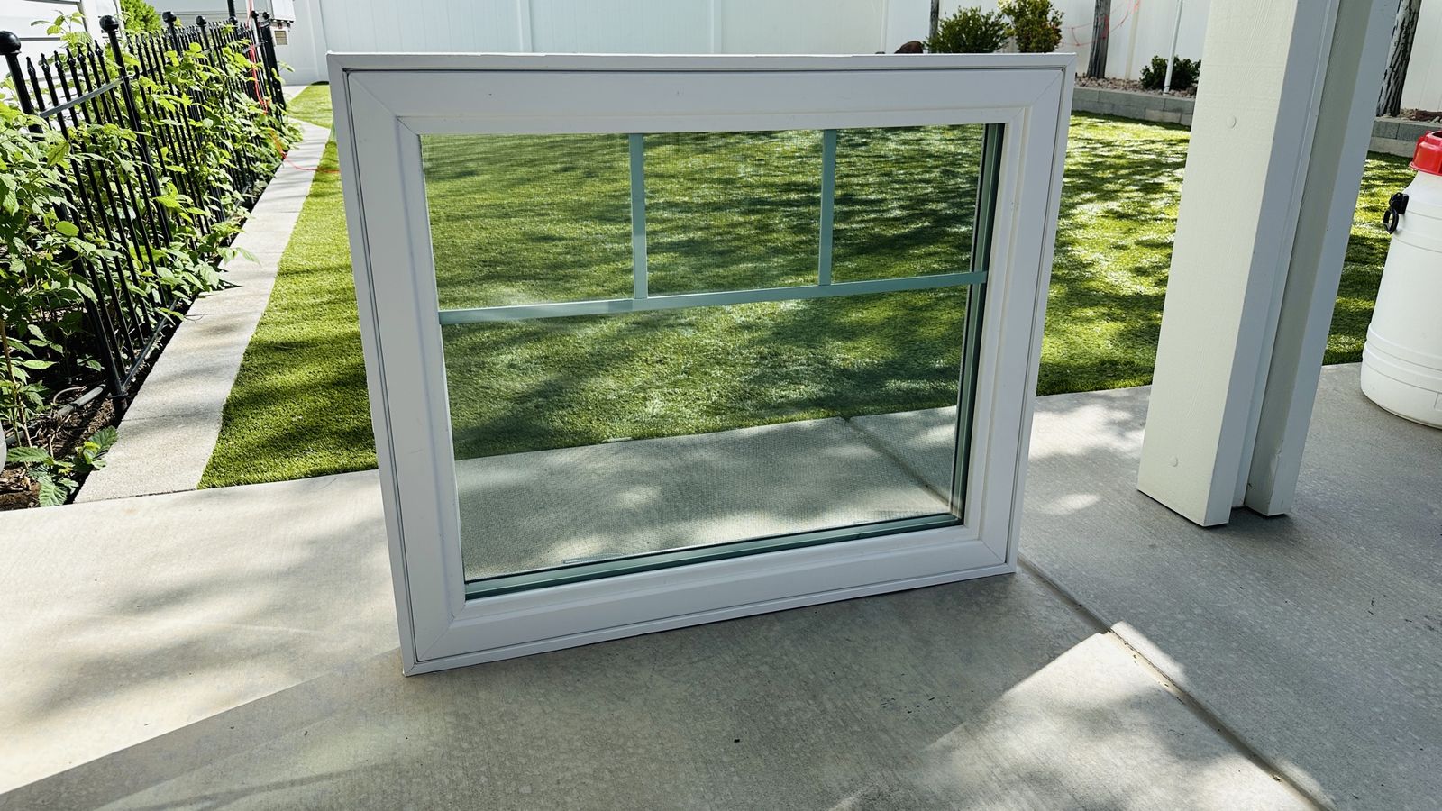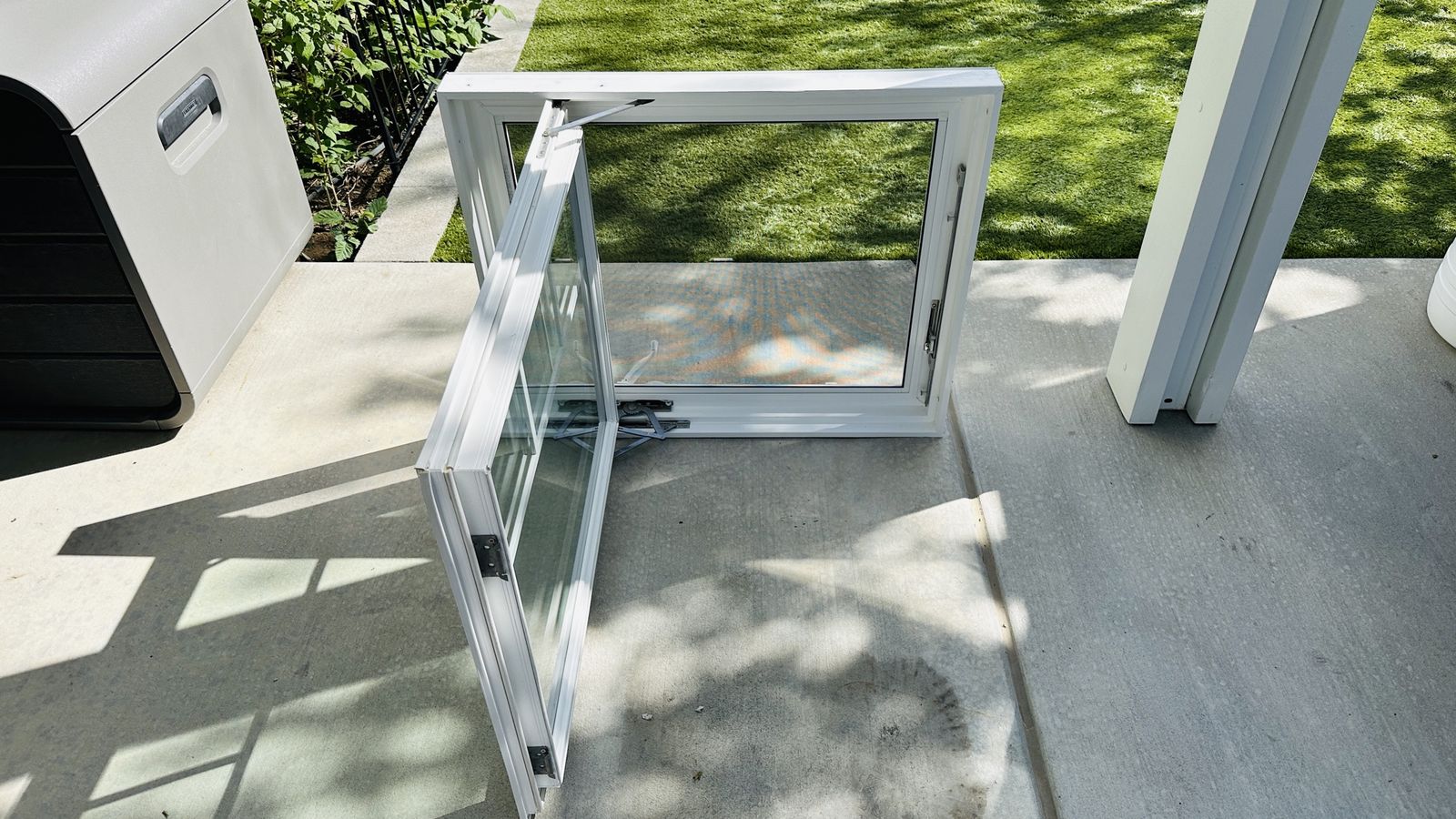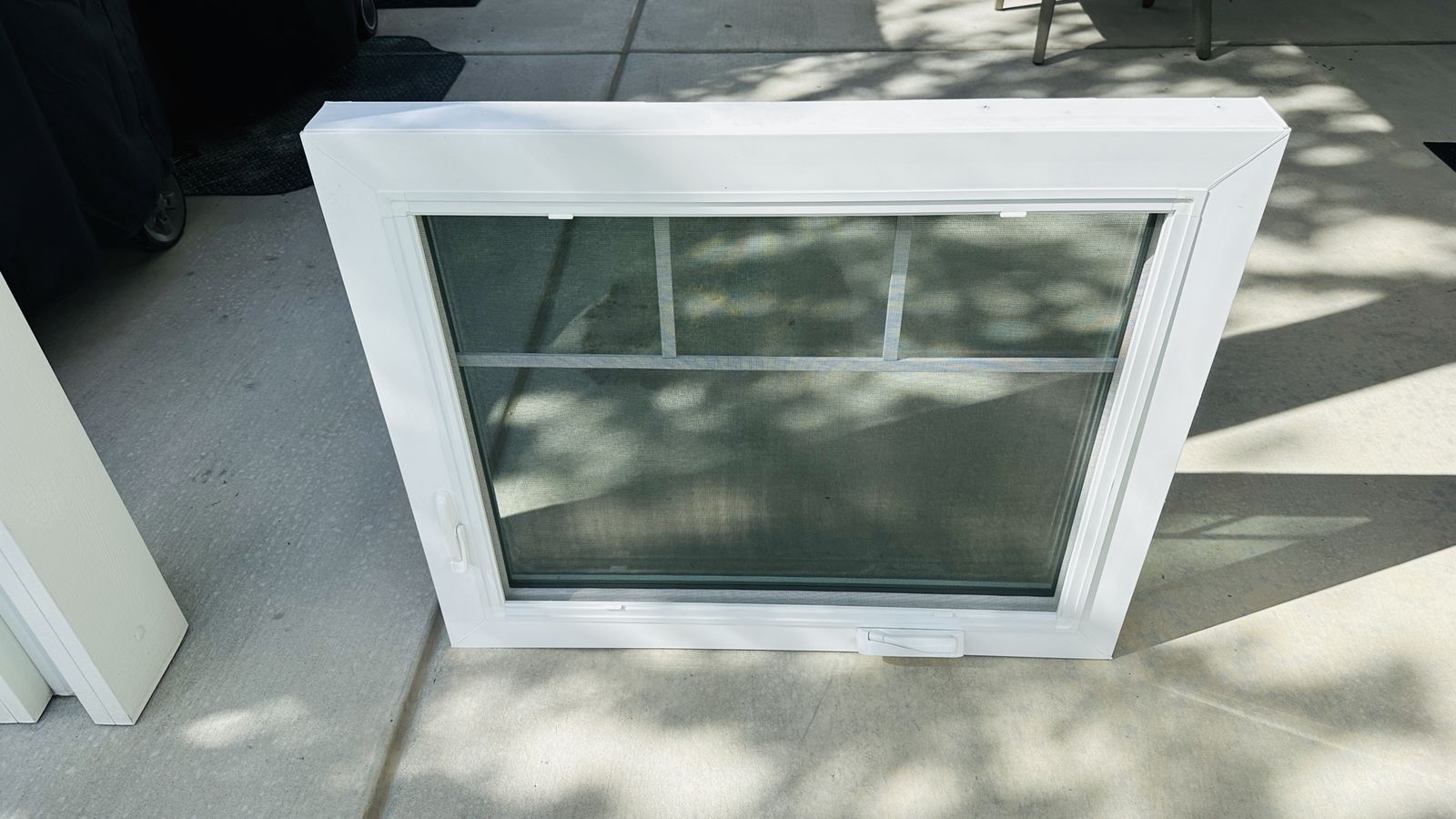 Venmo35-3/8 wide X 29-7/16 tall, white vinyl casement, opens 90° Has screen No fin/Block frame This was a display in our showroom, never been installed outside.
