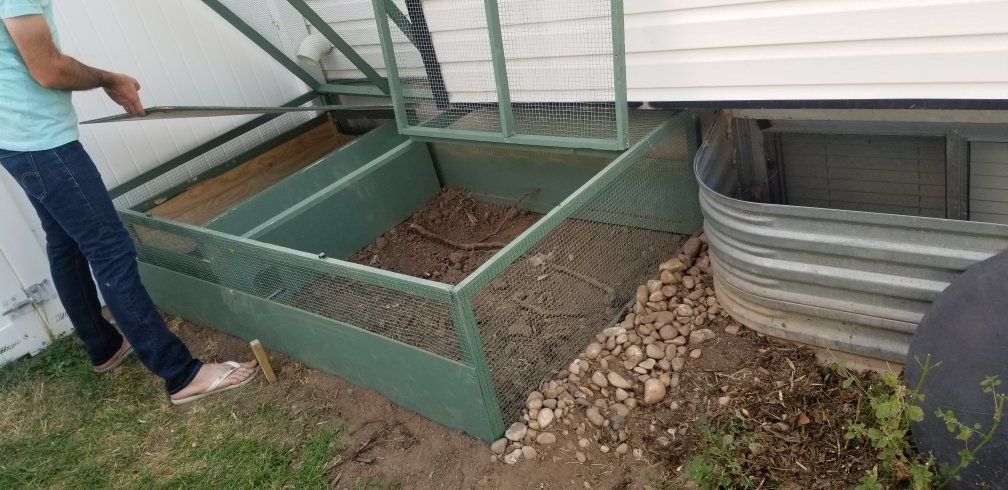 The hutch is about 24sqft and can comfortably accommodate 17-18 birds. It's a few years old and needs some staples in it, but has survived attempted rat, raccoon and dog attacks without issue (add included hardware cloth for skirting and they can't dig under). The "fresh" picture of the coop is from when it was newly made and is to show the openings and shelter.