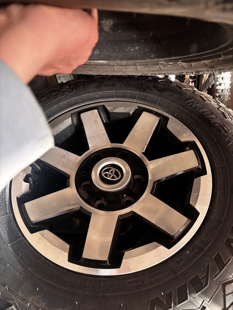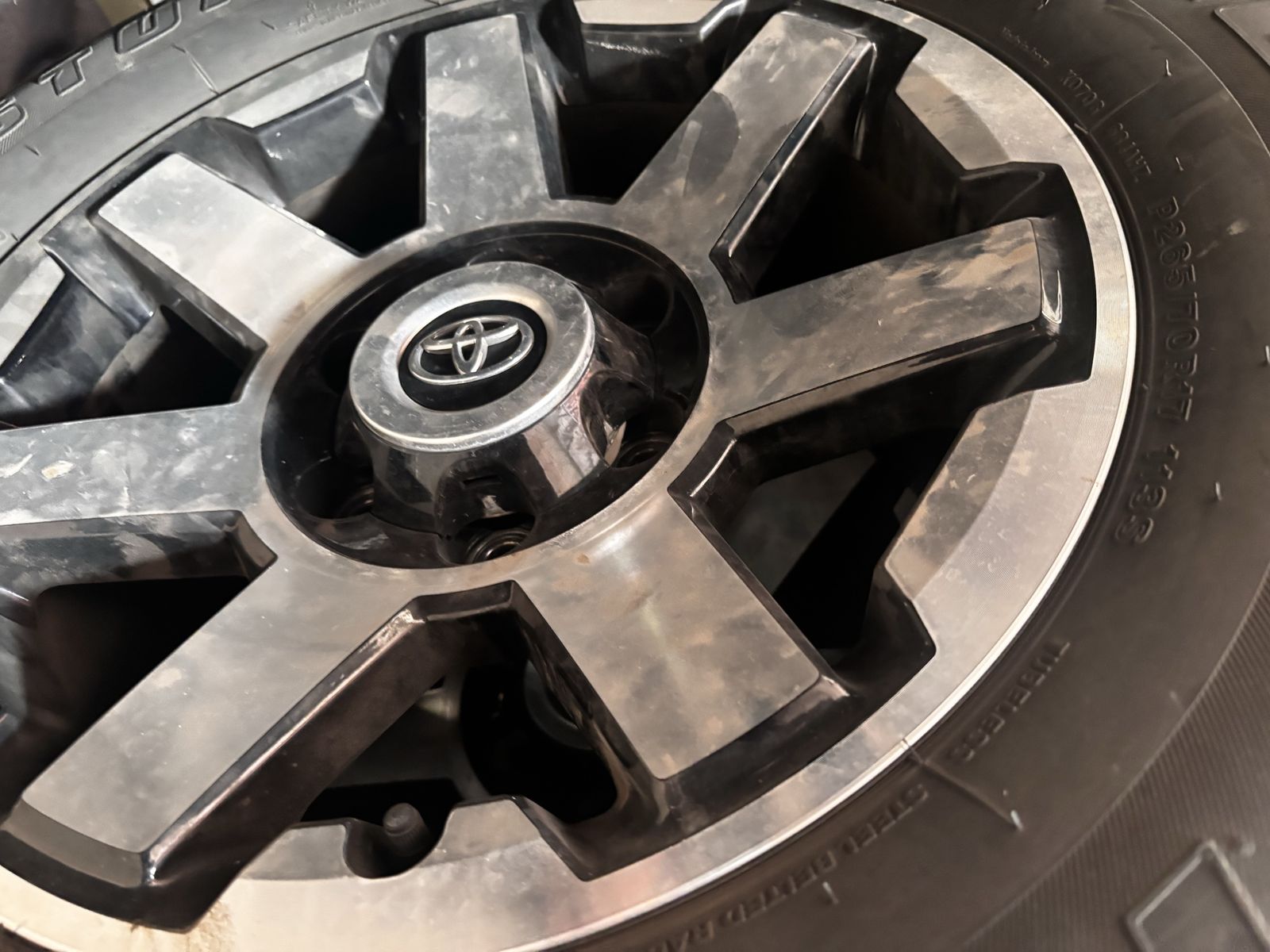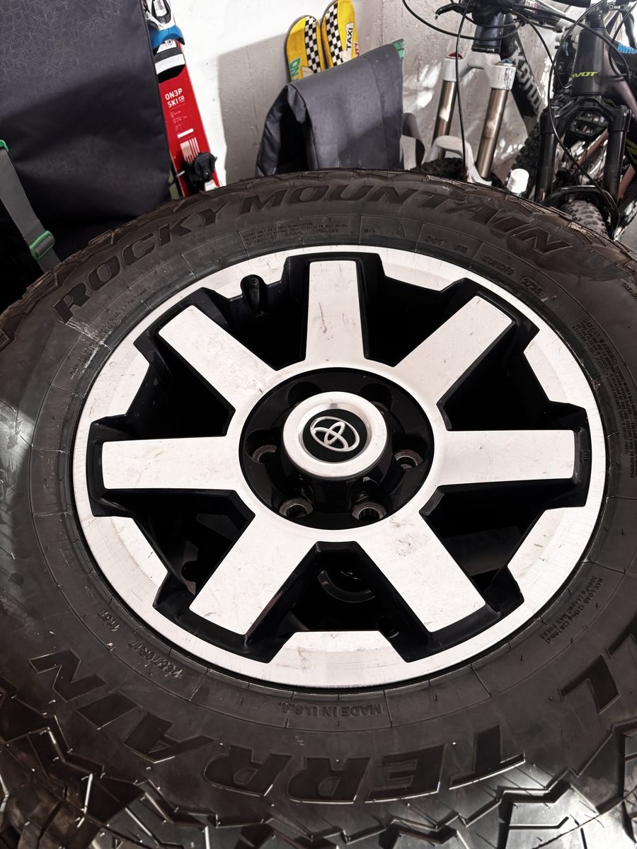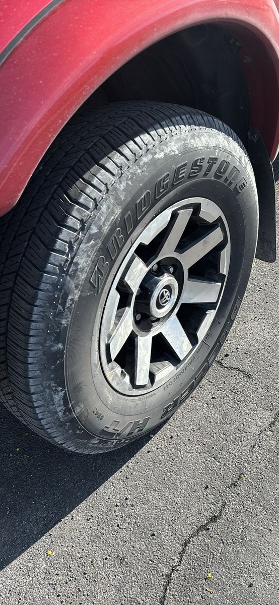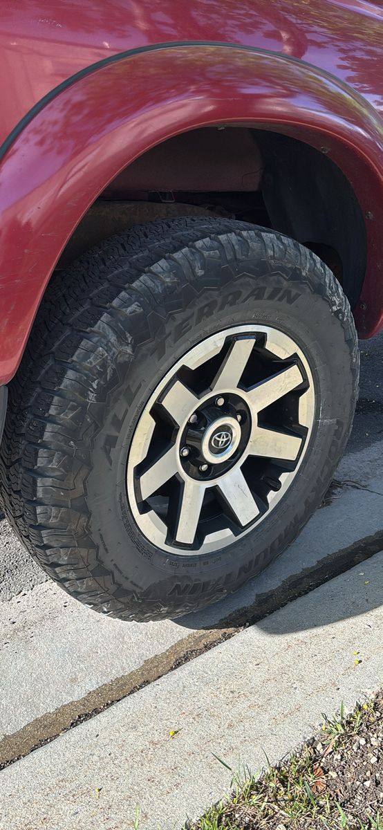 Wheels and tires for Tacoma or 4runner. Tires are mismatched but both have good tread. 2 are Bridgestone duelers and 2 are Rocky Mountain at’s with are basically brand new with 2025 date codes.