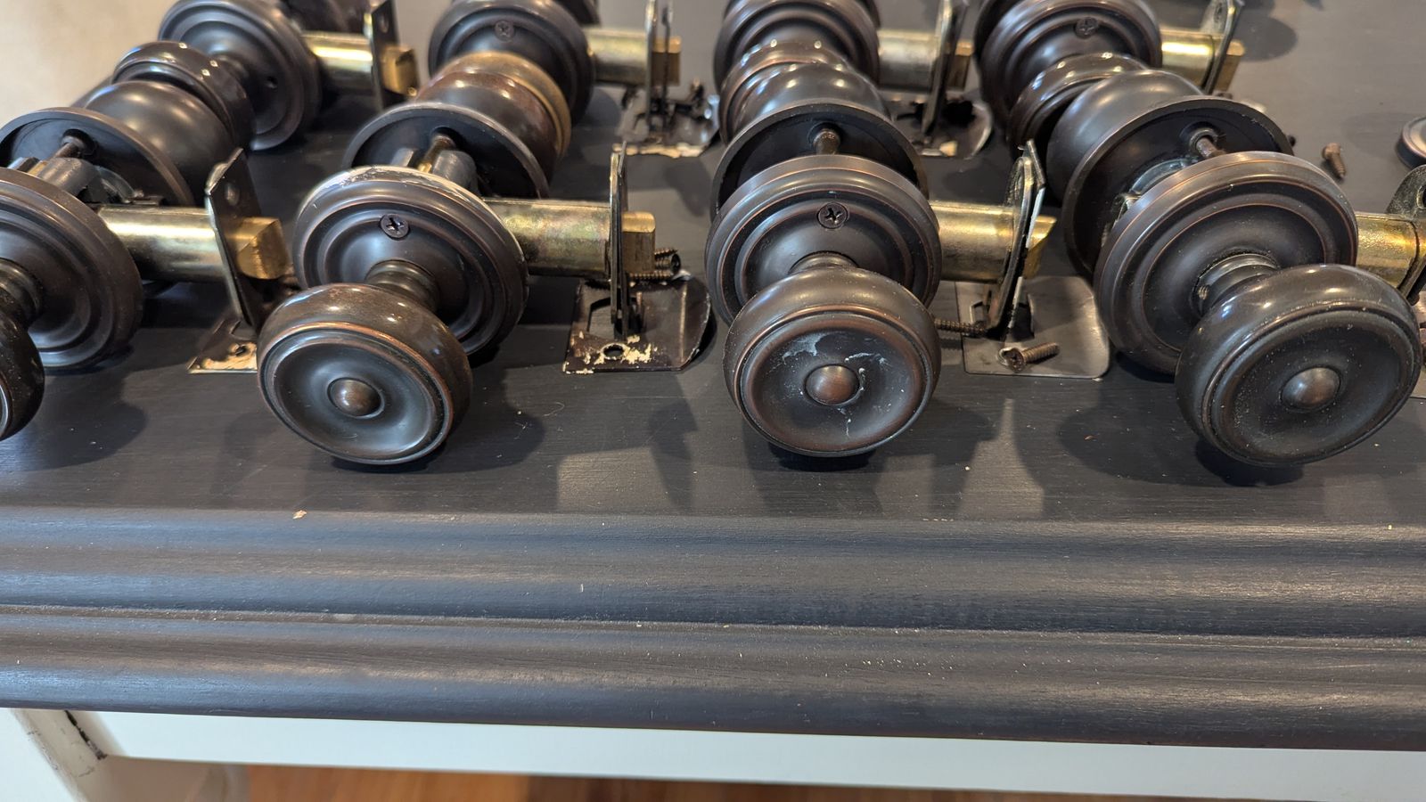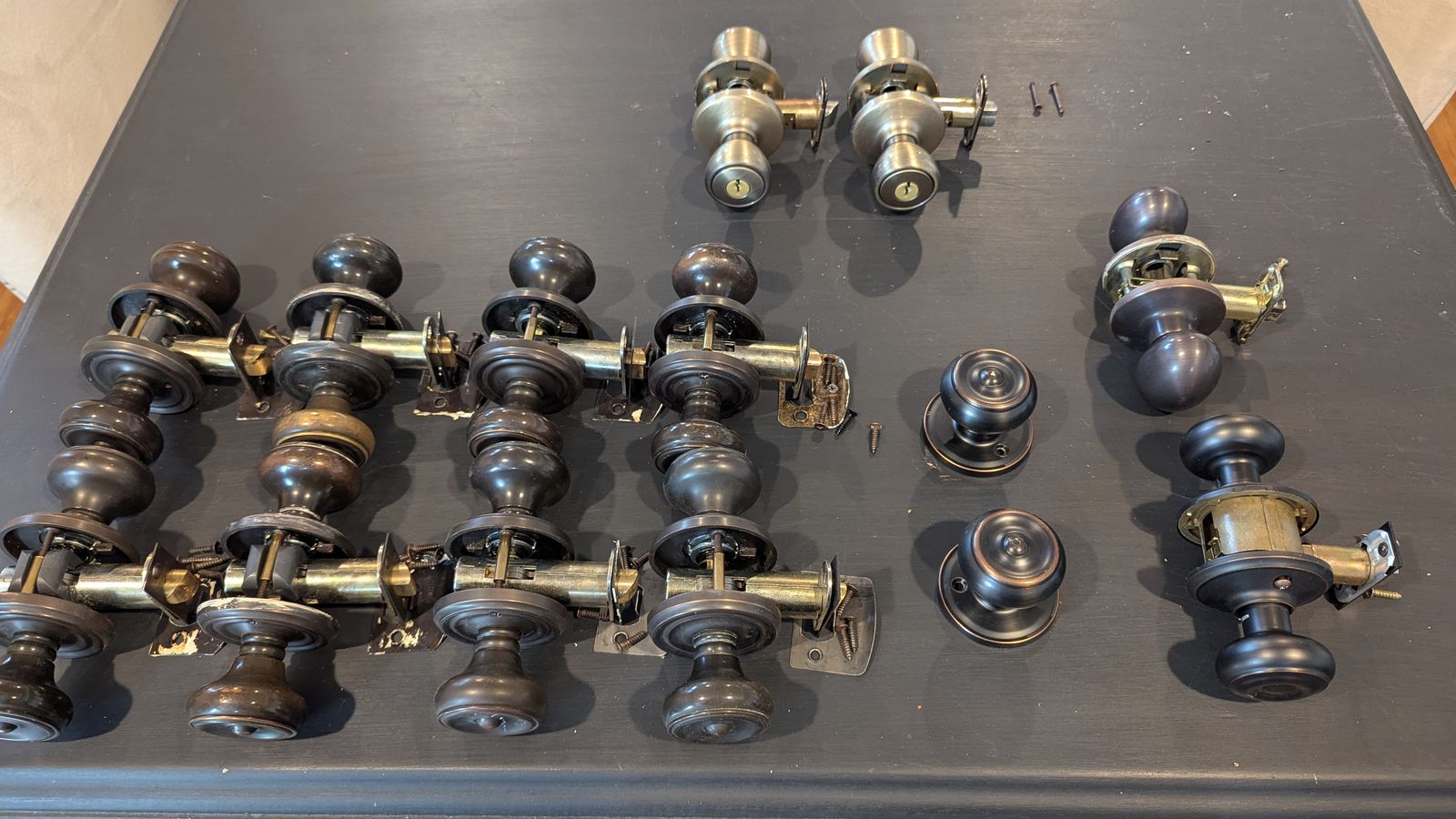 Venmo8 inside door knob hardware with all parts, plus 2 closet handles, 2 similar handles and 2 different handles.
