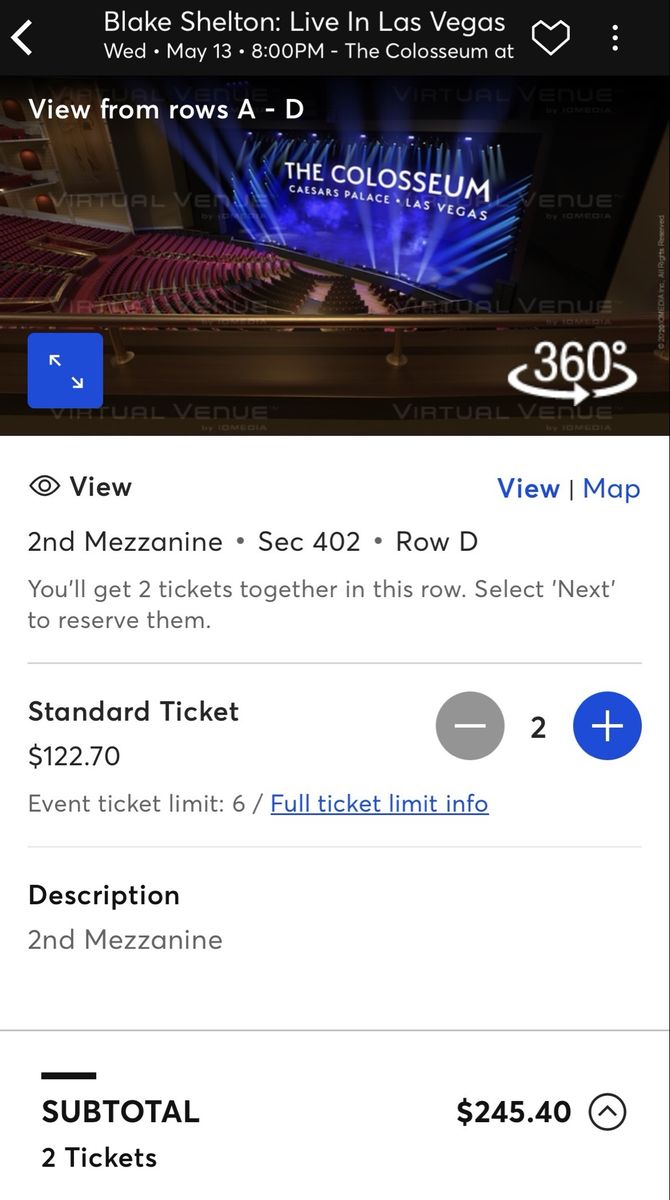 VenmoI have 2 tickets to see Blake Shelton at Ceasers Palace on Wednesday, May 13th @8 PM in Las Vegas. Section 402, Row D, Seats 205 and 206. These are in the nose bleeds, but priced reasonably. Asking $80 each, so $160 for the pair of tickets. Want to keep as a pair. Comparable tickets are $122 each on the app now, so they are priced at a pretty good discount. Venmo or cash for payment, transferred through the Ticketmaster App.