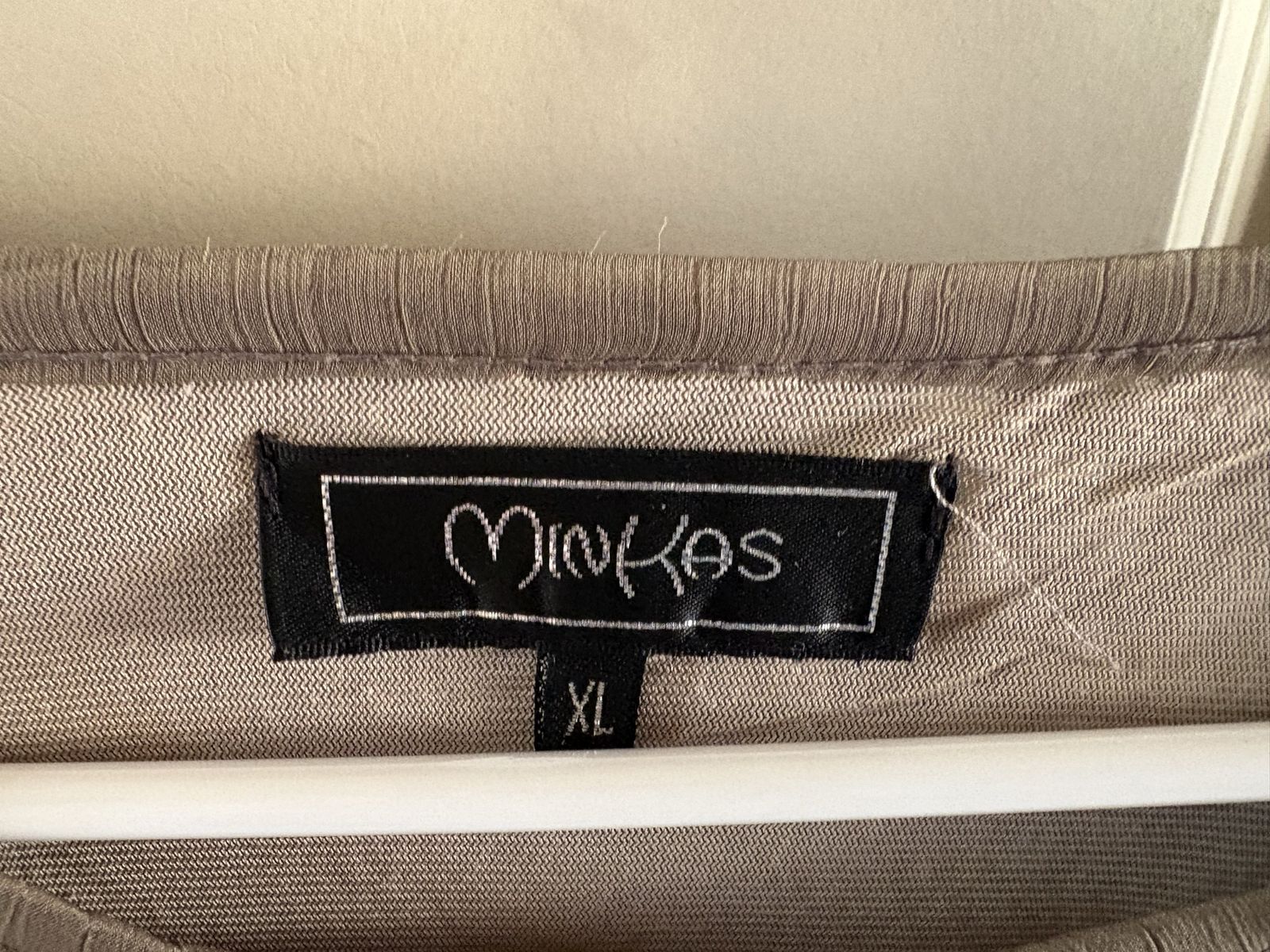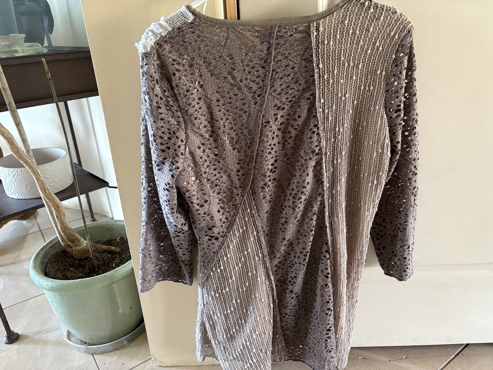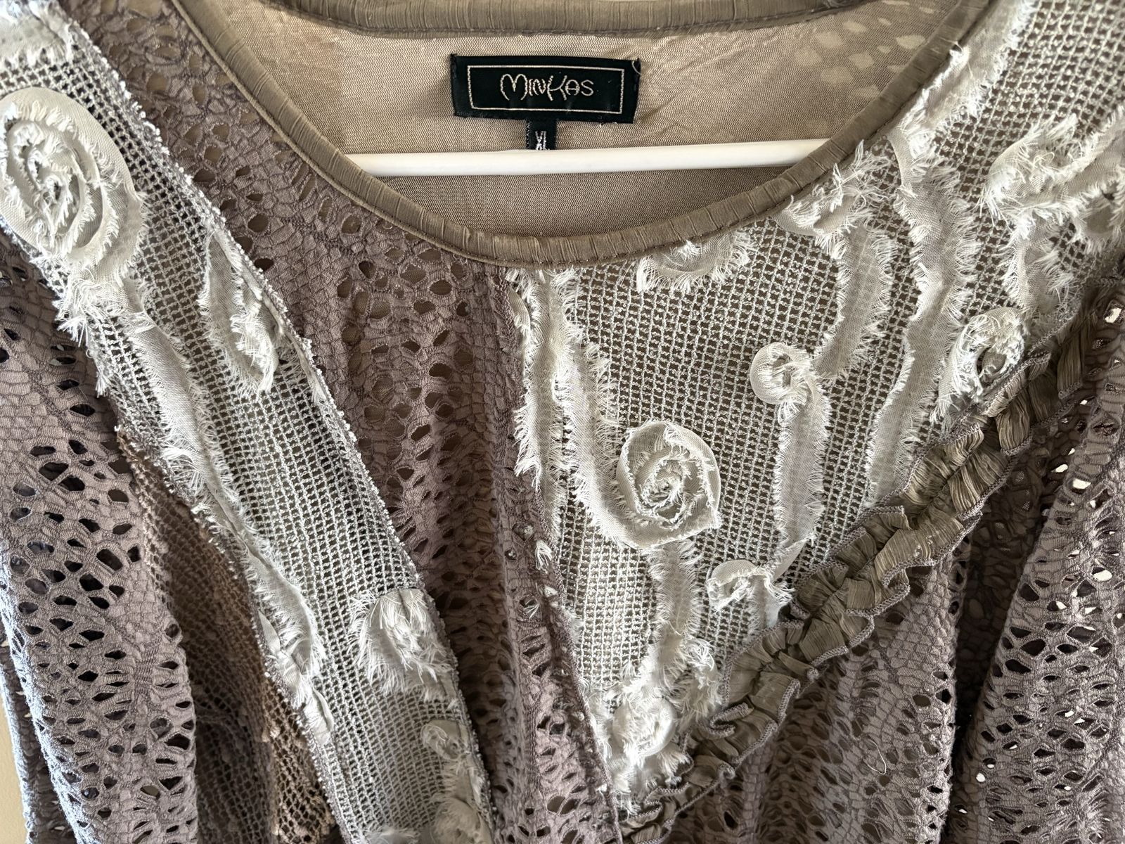 I have a Minkas patchwork style blouse with sections of lace and taupe colored crochet. The size is XL. See my other ads for jewelry, artwork, home decor and more.
