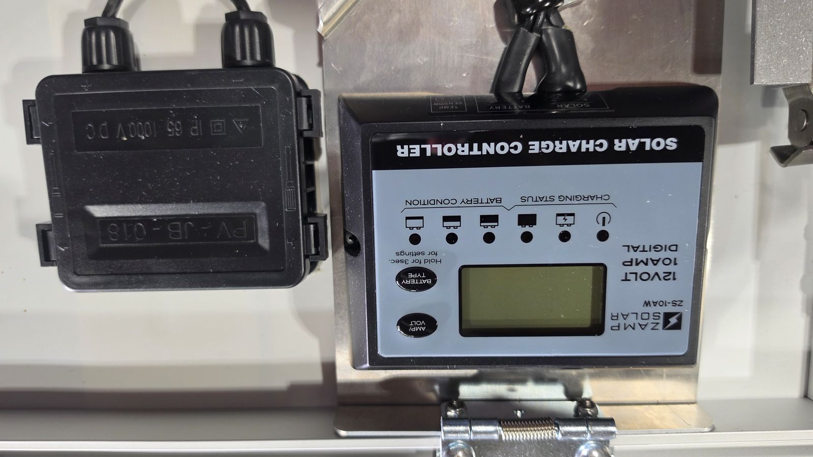 Hinge-mounted, weather-resistant charge controller's digital display allows monitoring of your power usage.