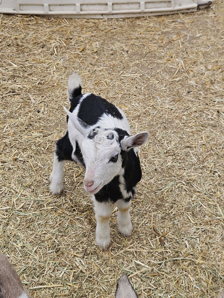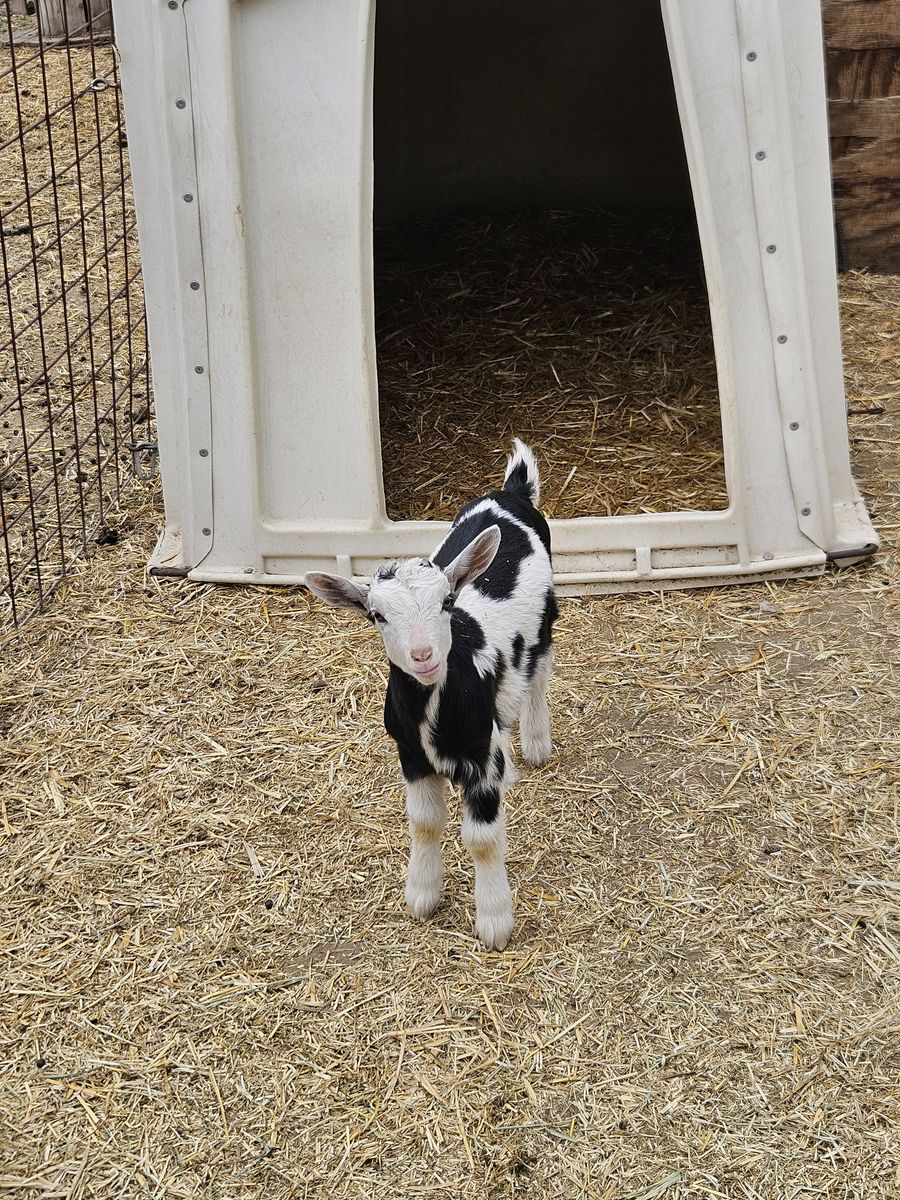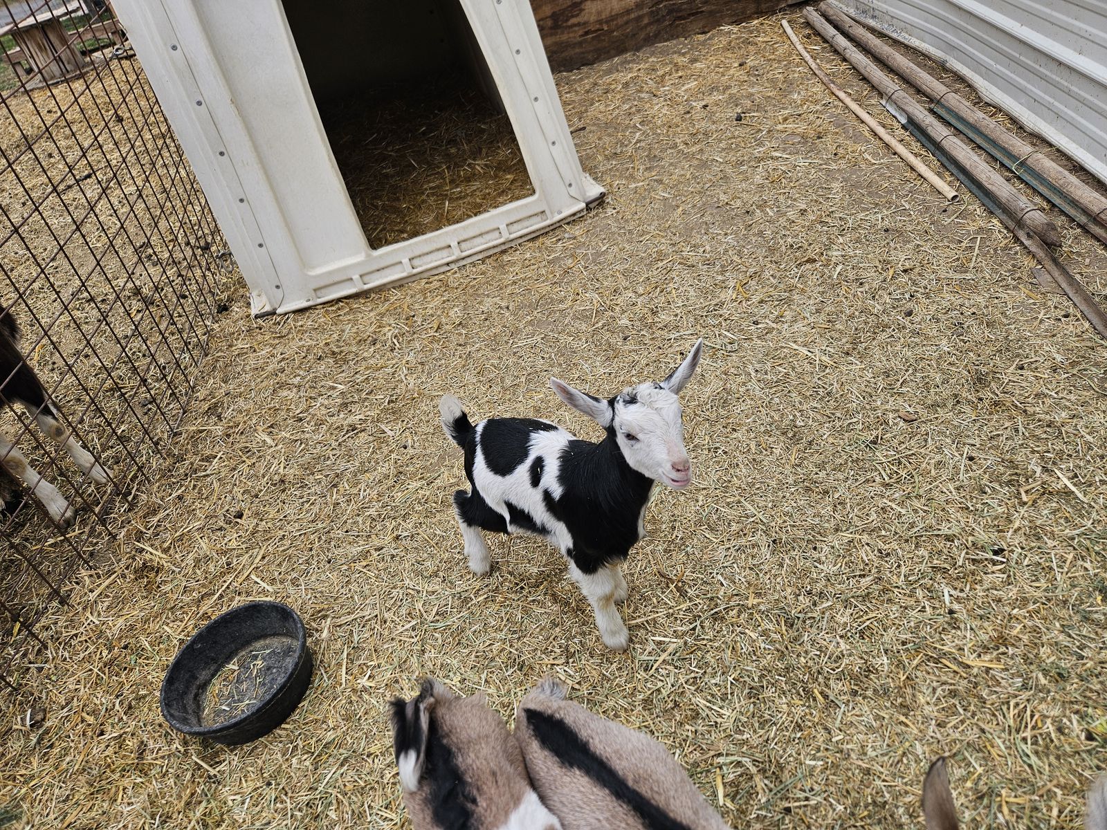 Black and white alpine bottle baby 7 weeks old now outta pack goats lines no debudded