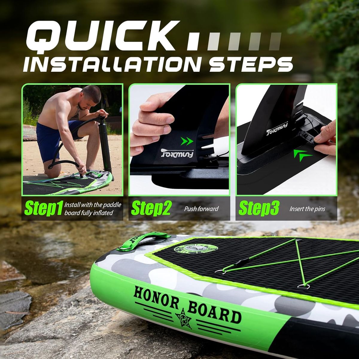 Each box includes: 1×inflatable paddle board 1×adjustable paddle 1×seat 1×pump 1×storage backpack bag 1×ankle cuff leash 1×dry bag 1x patch kit 1x shoulder carrying strap 3x fins