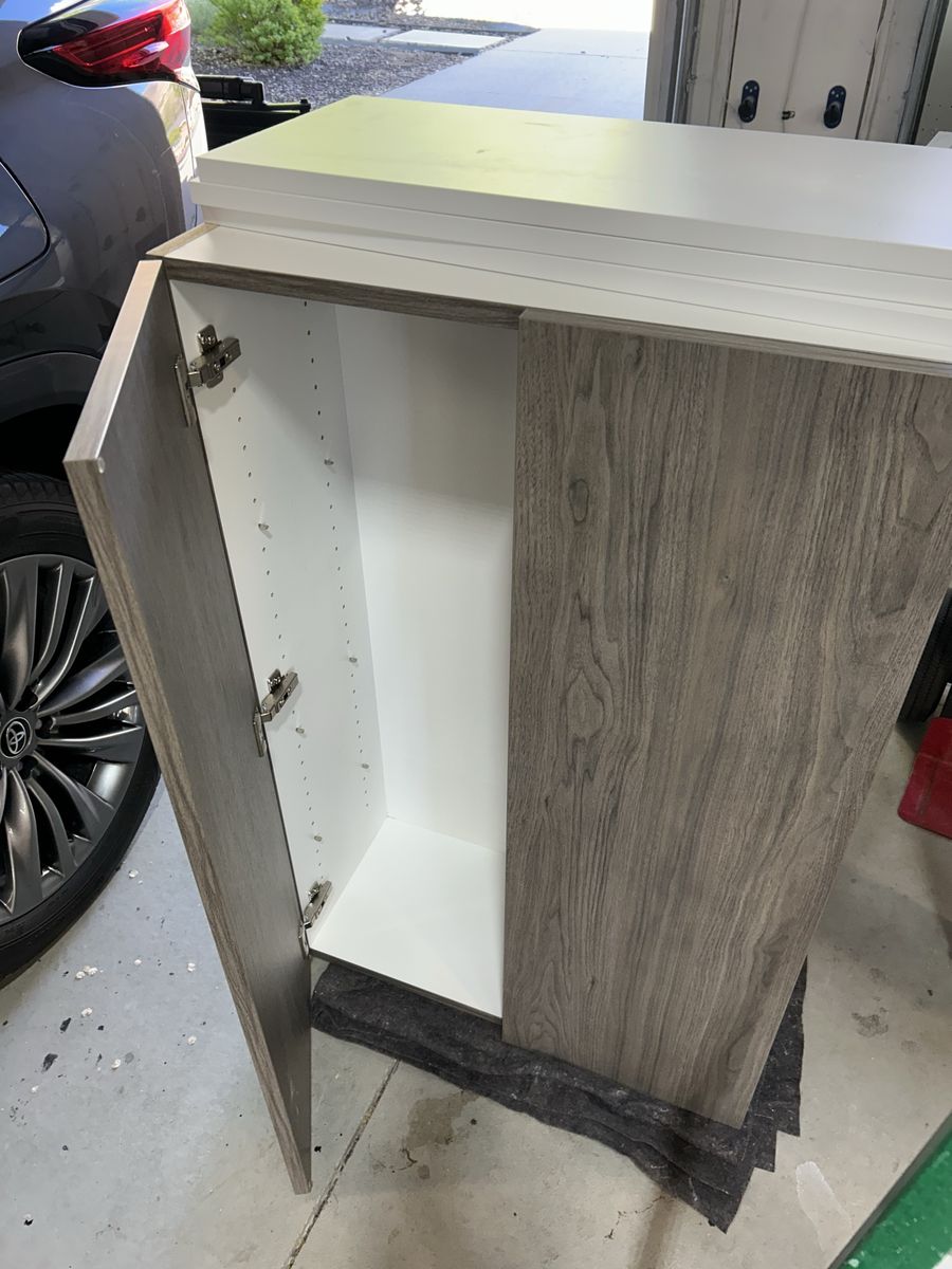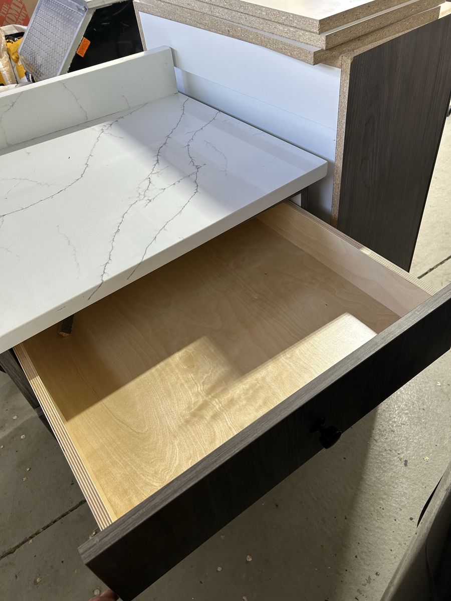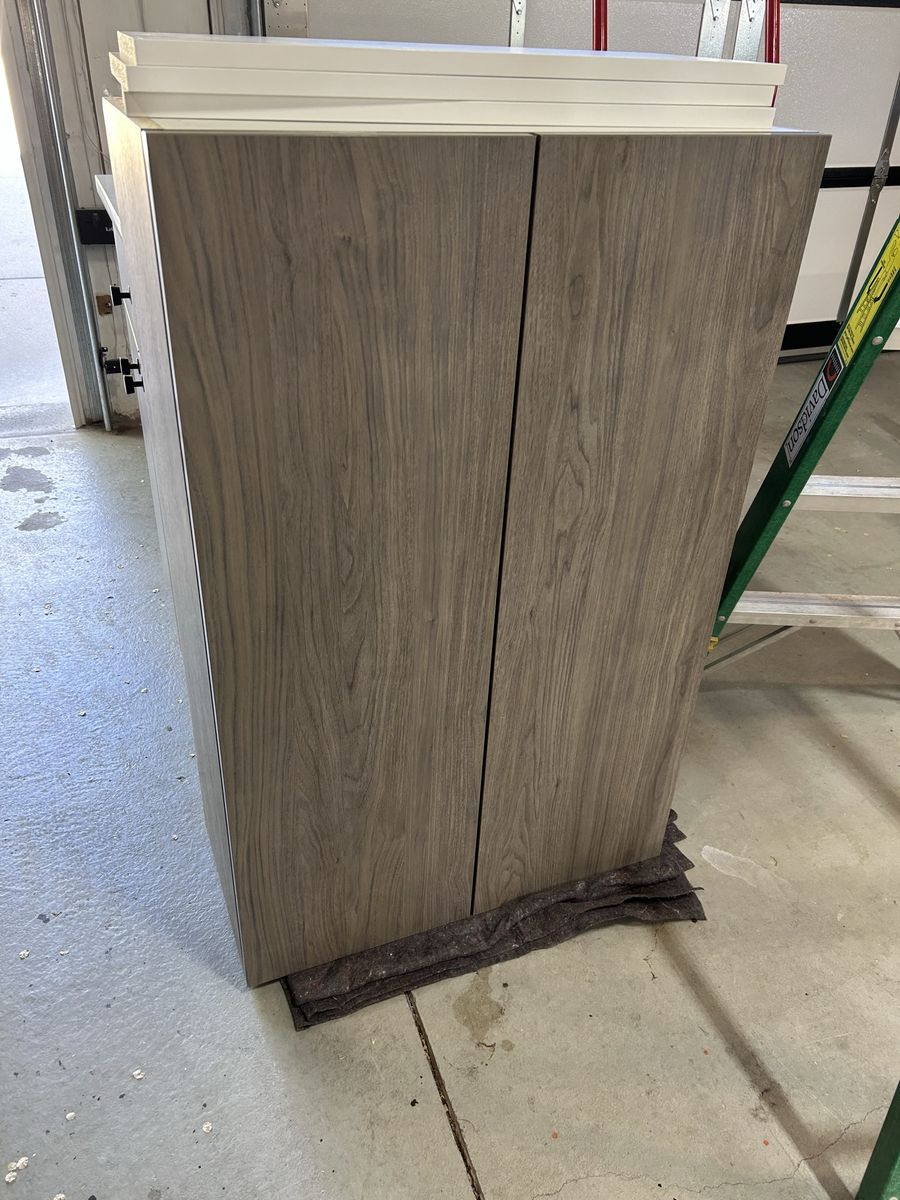 VenmoBrand new 42”h wall cabinet and used base cabinet. Decided to replace an existing base cabinet with a new floor to ceiling cabinet (after ordering matching wall cabinet, with no cancellation option). Base has some damage at toekick from removal process, otherwise everything is in excellent condition. Melamine interior and shelving, soft close doors and drawer, countertop and backsplash strip are white quartz with grey and tan veining. Cabinet finish is Wilsonart Monteverdi, including sides. This set cost minimum $1200 purchased new (not including install). Width dimensions (other dimensions standard): Base 24” Countertop 27” Wall 27” $250 or best offer