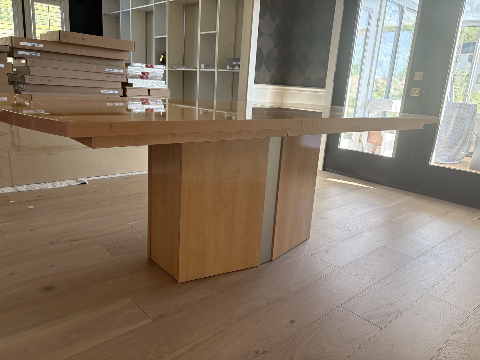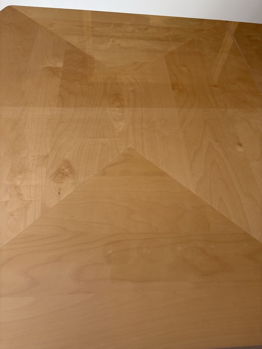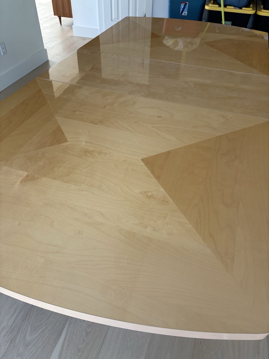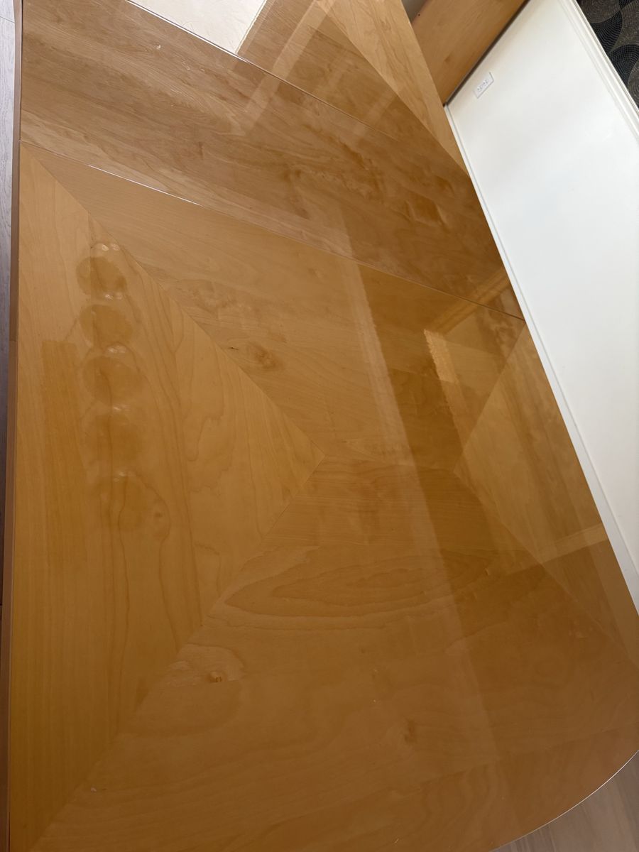 VenmoItalian made modern dining table. We’ve absolutely loved this table but we’re remodeling and the color just doesn’t work with our new light wood floors. Gorgeous inlay pattern (hard to see in pictures but adds amazing detail). Glossy top makes for easy cleaning. Pedestal base is solid and strong. Very durable and a wonderful table for hosting. It has two extension leafs (17.5” each) so without them it is 71” and with both in it extend to just over 106”. Originally $2500.