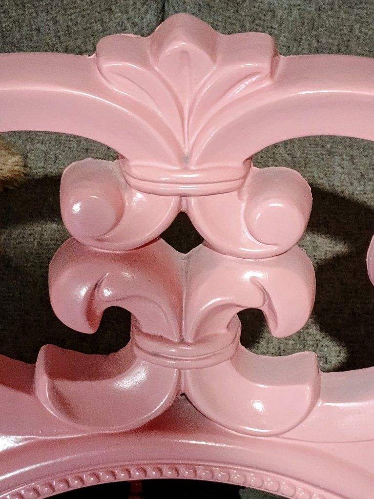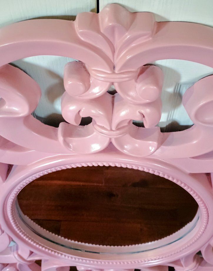 VenmoPink ornate wall mirror. Molded resin, pretty light, easy to hang. Measures 32 " round. The beveled mirror is 15.25" round. Smoke and pet free home