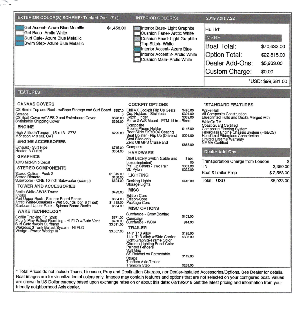 The 2019 Axis A22 is a 22-foot high-performance wakeboard and ski boat designed for customizable wakes, seating up to 15 people, and advanced watersports features.Overview The 2019 Axis A22 is a value-driven, performance towboat ideal for families and watersports enthusiasts. Redesigned for 2019, it features a fresh interior and exterior look, balancing a compact footprint with the ability to create large wakes for wakeboarding and wakesurfing axiswake.com+1. It is built with a fiberglass modified-vee hull and typically powered by a 6.0 PCM V8 410 engine Boats from USA.