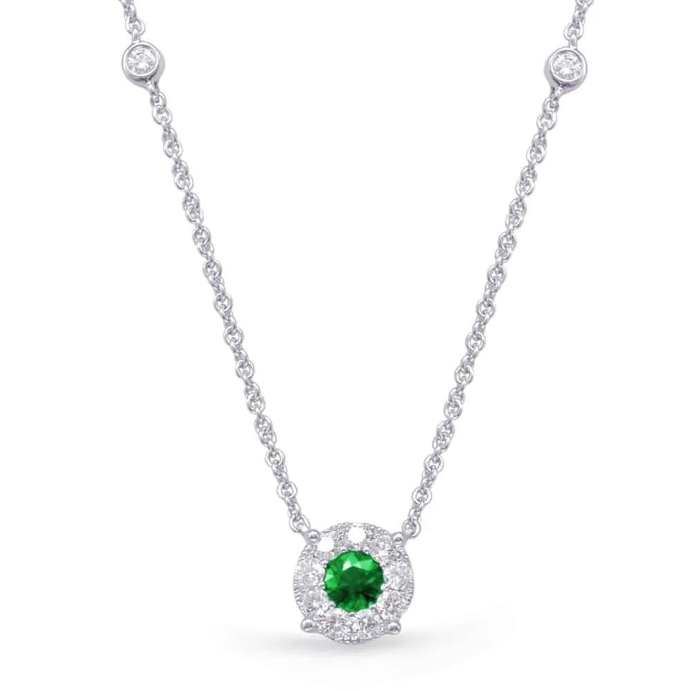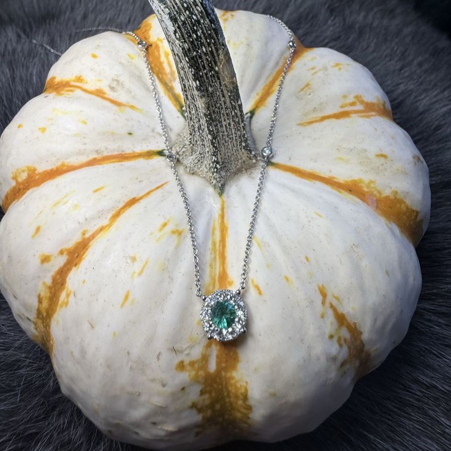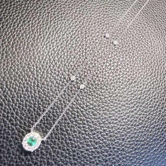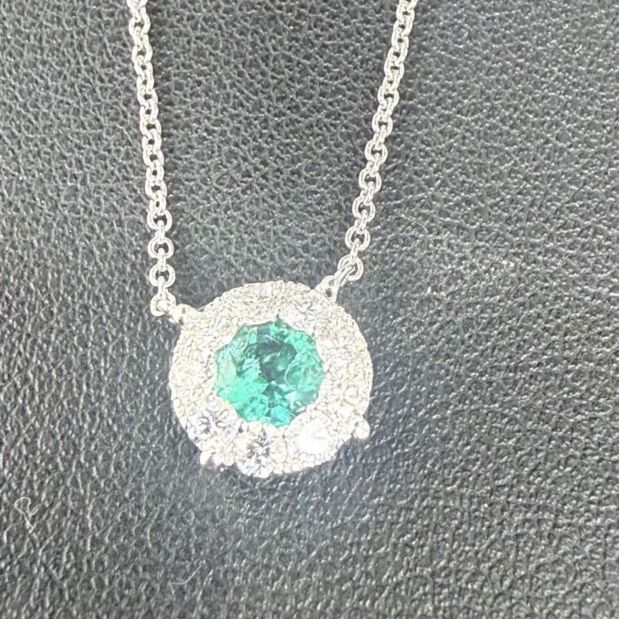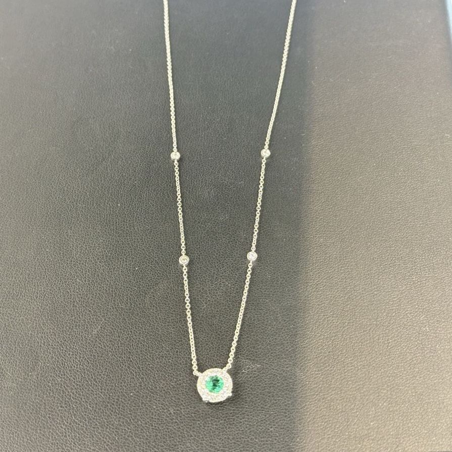 ApplePayThis necklace is in 14K White Gold. There are a total of 14 stones. Emerald with a total carat weight of 0.38 There are Rounds stones with a toal carat weight of 0.44 set in a Bezel Settling Asking $1,800 or best offer Paid $4,000