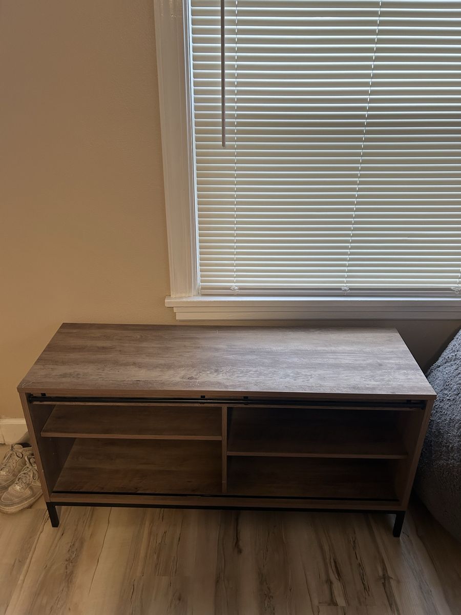 Tv stand in great shape. Minimal scratches on top. About 50” long and 24” tall