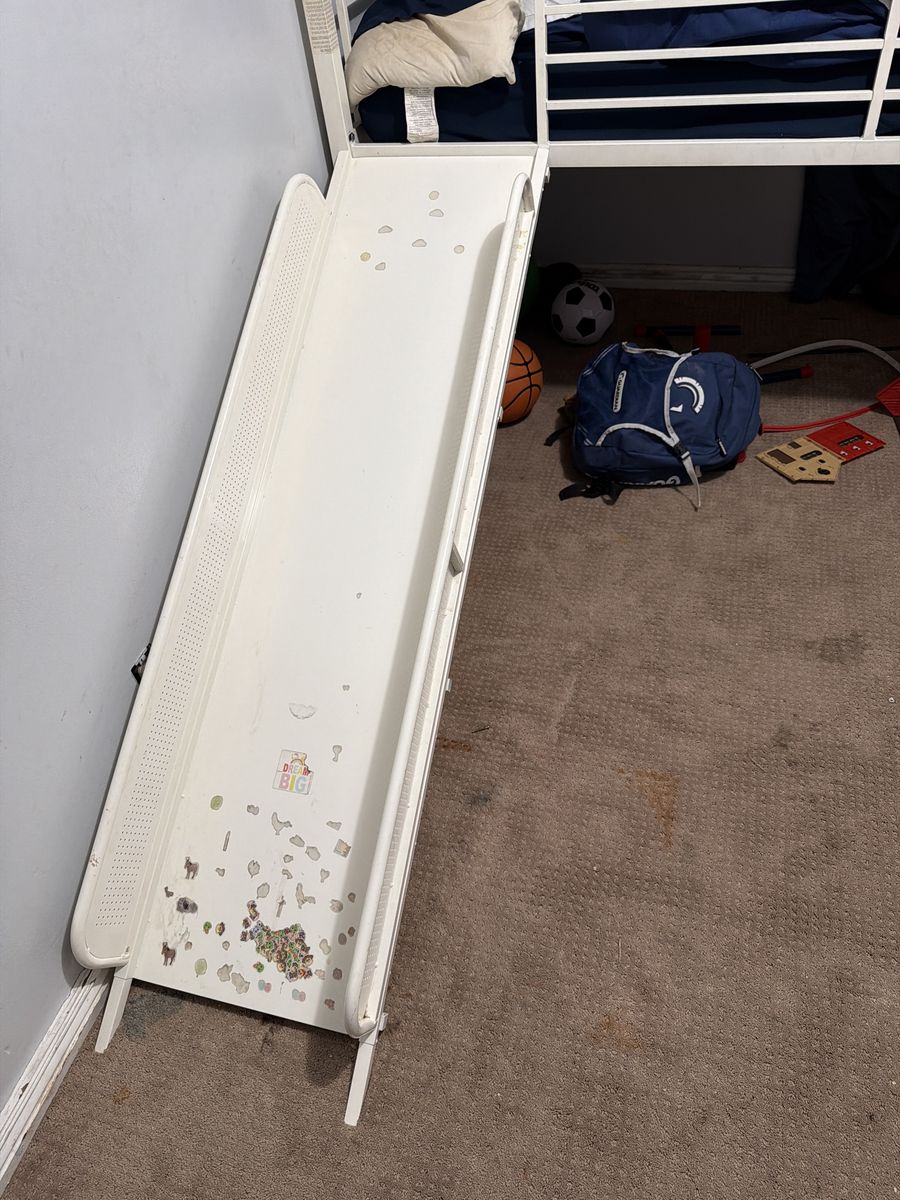 White Metal loft bed with slide. Mattress not included