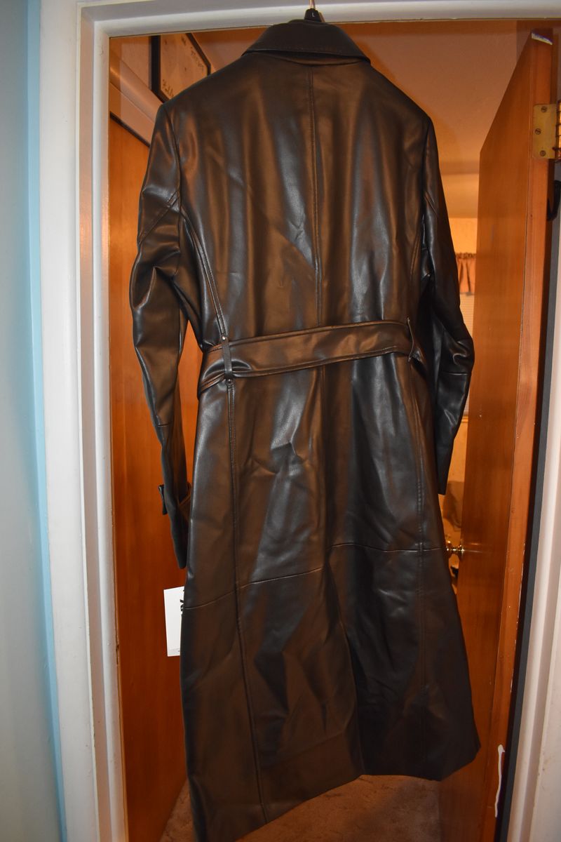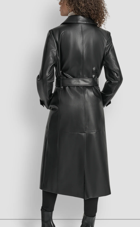 Timeless and modern, this sleek longline jacket in supple faux leather defines effortless urban sophistication—cinched at the waist with a belt for a flattering silhouette that transitions seamlessly from day to night.