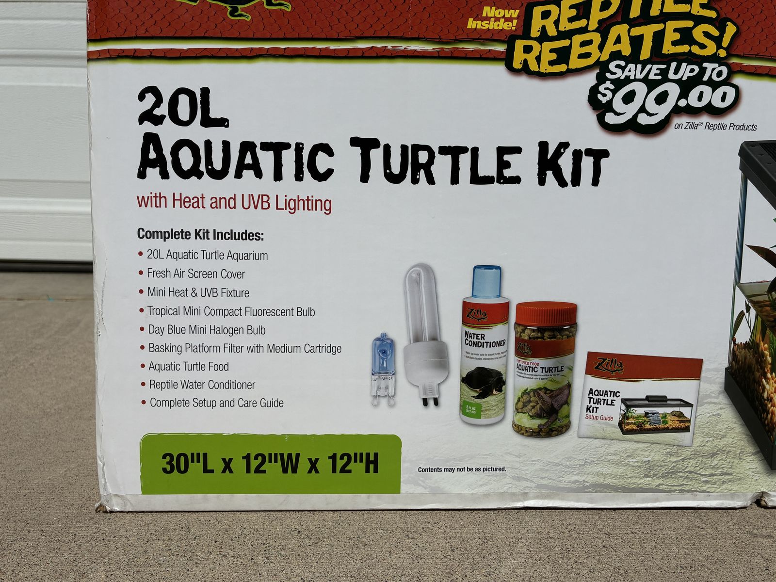 The tank measures 30” long, 12” wide and 12” high. PLEASE NOTE THAT THERE IS A SINGLE CRACK ALONG THE BACK PANEL! Cracks in aquarium tanks are a relatively easy fix and repair kits can be purchased on Amazon and at pet stores. This tank can still be used for aquatic turtles or fish once the repair has been made, or it can be left alone and used as a terrarium for tortoises, reptiles, tarantulas, etc. Either way, this is a great deal on what is otherwise a very expensive setup!