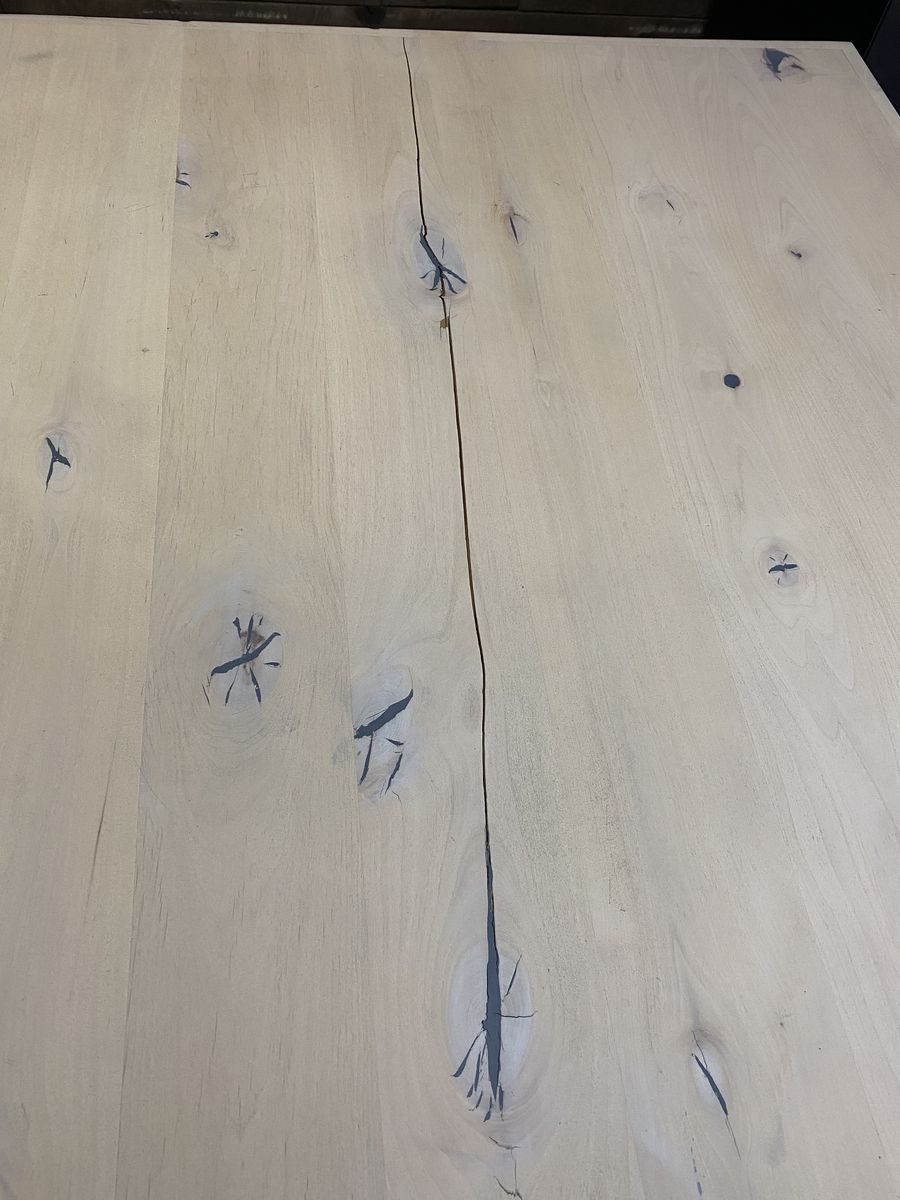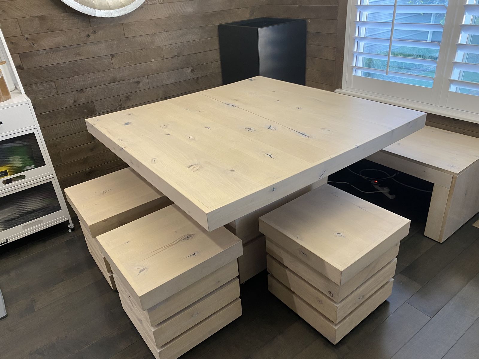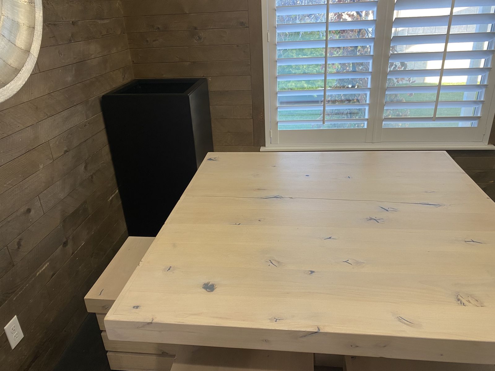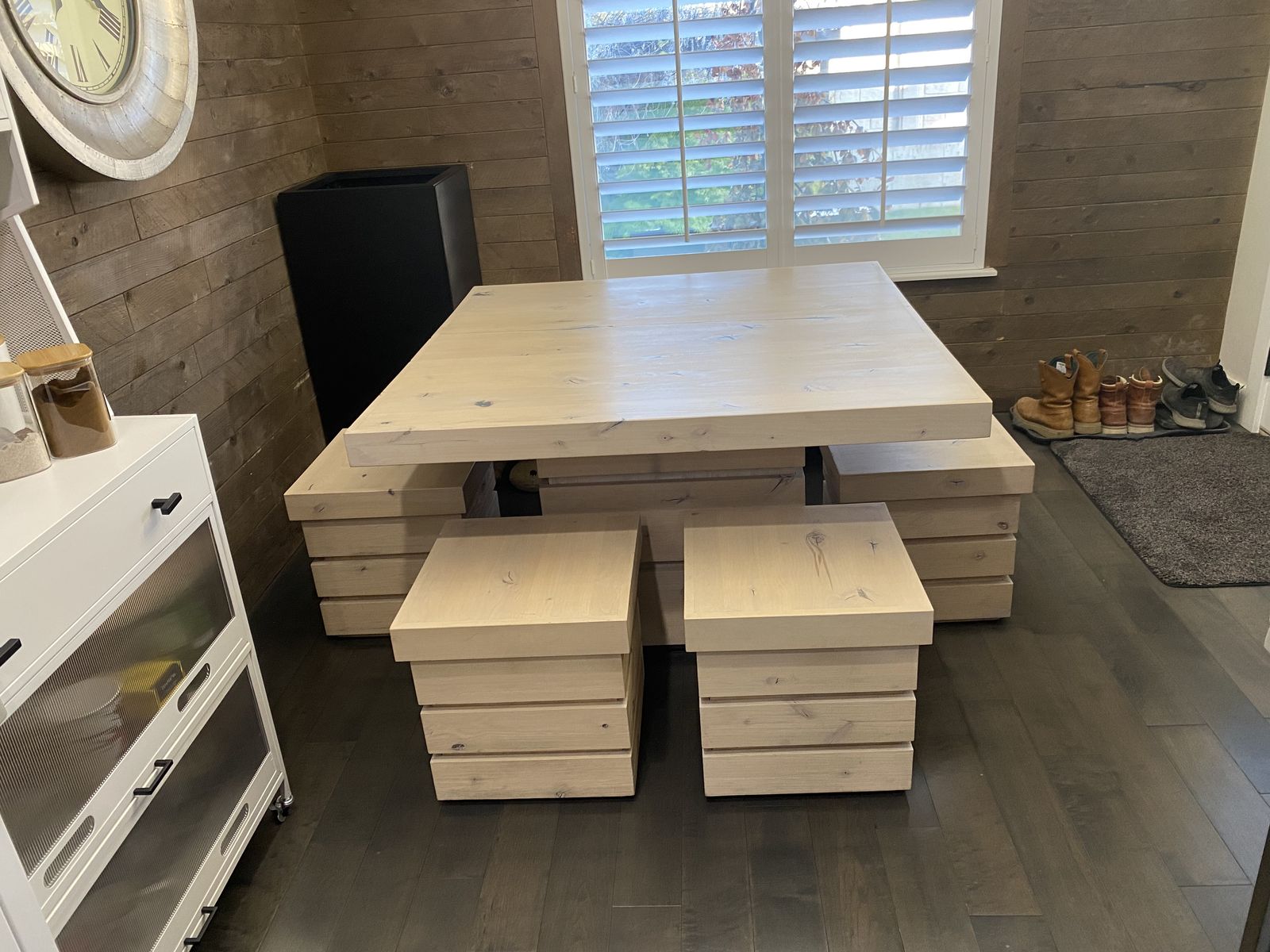 Custom made dining set. This is all solid wood with no veneers. Very solid and heavy. Table top could use some refinishing, has a crack in the top (pictured). We didn't mind as we like the rustic look. Could easily be filled with some colored liquid wood epoxy. Comes with 4 stools and bench with attached steel planter.