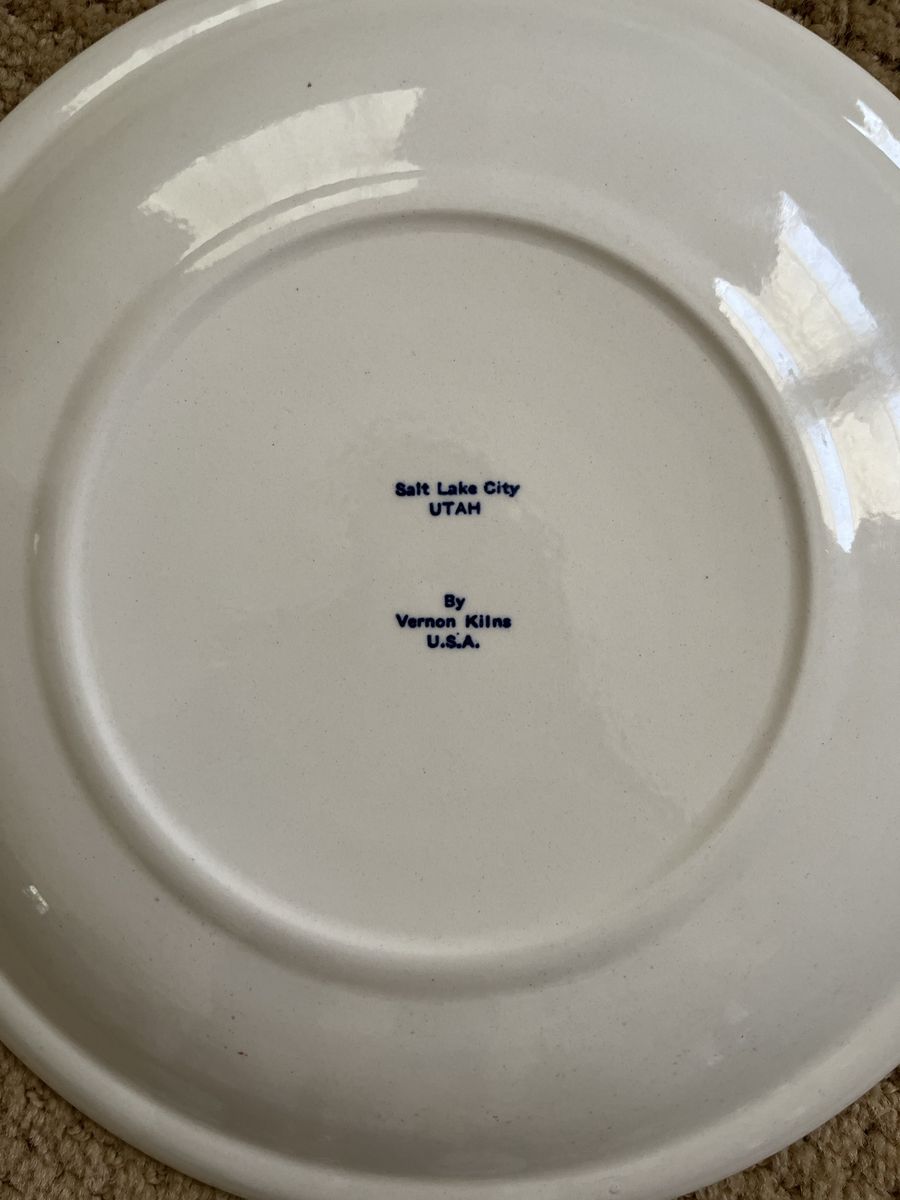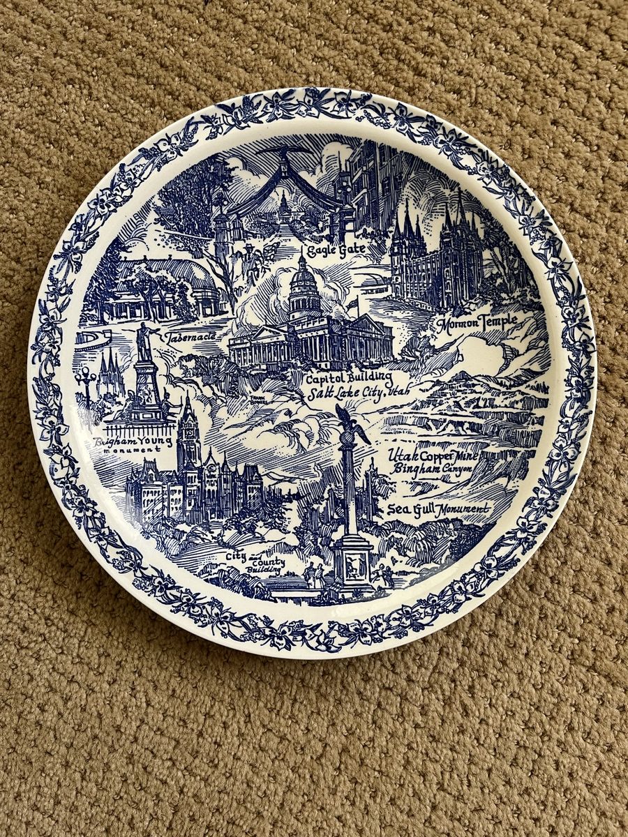 VenmoThese Salt Lake City plates are hard to find, especially in blue. This plate is in mint condition. This was made by Vernon Kilns, which operated from 1931 - 1958. This plate was made during this time frame. The scenes on this plate are the Utah State Capital Building, Church of Jesus Christ of Latter Day Saints Mormon Temple, the Tabernacle, Eagle Gate, Brigham Young Monument, Seagull Monument, Utah Copper Mine Bingham Canyon, and a City County Building. The plate is 10 1/4 inches across. This has a white background with a beautiful floral band border. The colors are vibrant. There is no chips, cracks, or crazing. The back says Salt Lake City, UTAH and By Vernon Kilns This is a stunning piece of Utah history. It would be beautiful displayed. I will not ship this. Selling to help a parent. Price is firm.
