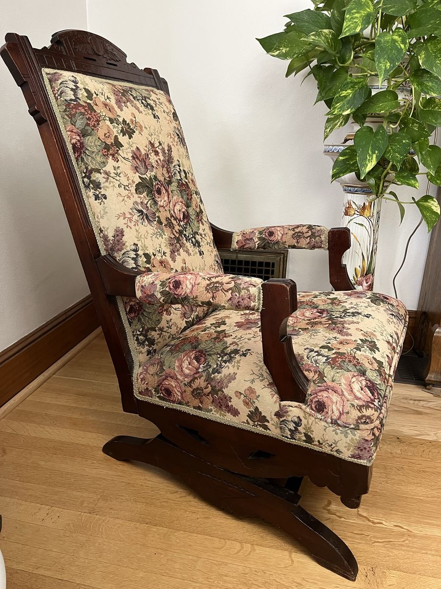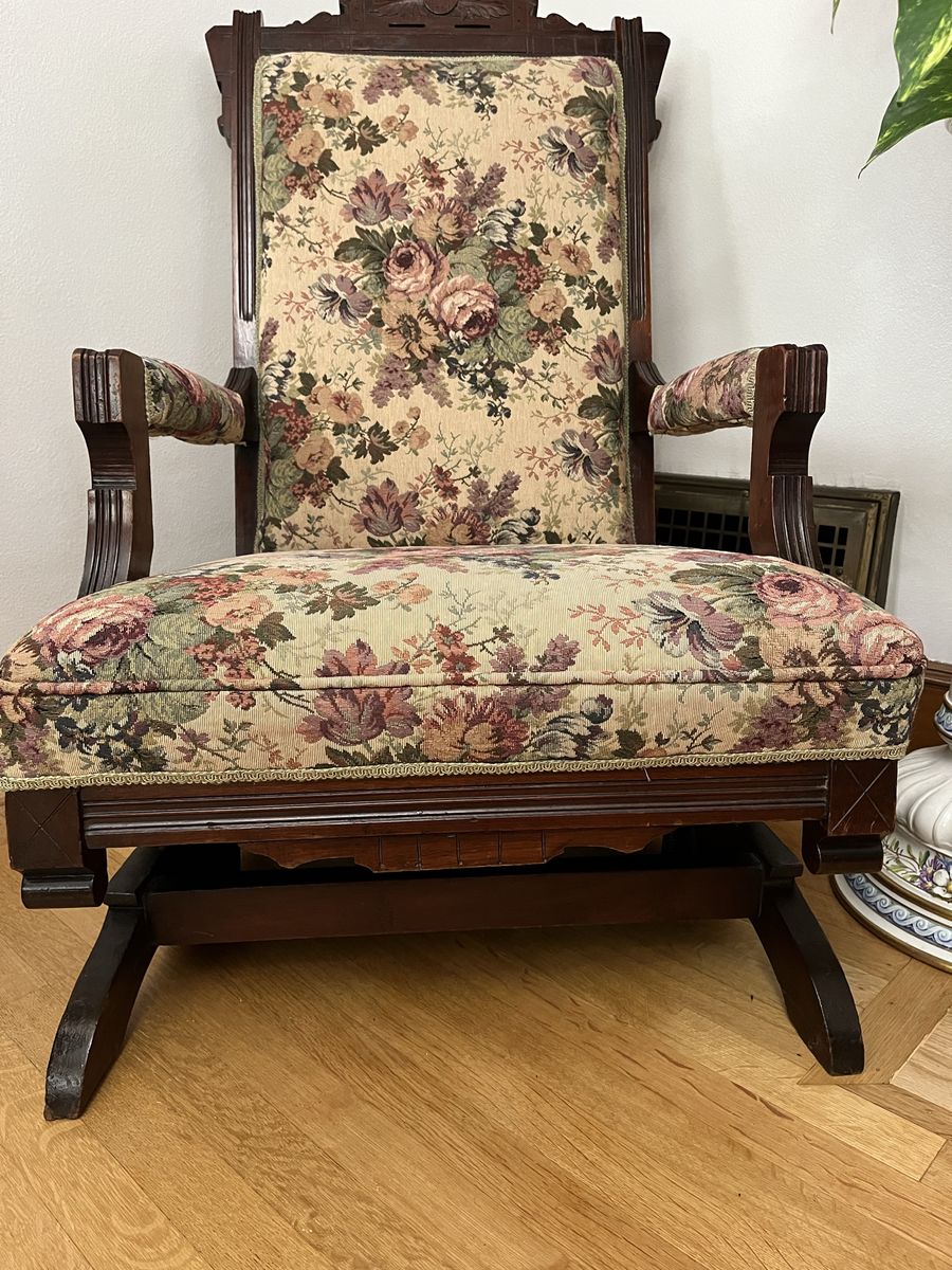 VenmoThis is a stunning rocking chiar. It is in excellant condition. The walnut wood is decorative and beautiful. The upholstry pattern has all different colors in it, that will compliment any room. This is 39 inches tall x 25 inches wide. The rockers are 25 inches deep. The seat is 19 inches deep. The back of the chair is 17 inches across. It is nicely padded and even the arms are padded. It is a must see piece. Price is firm.