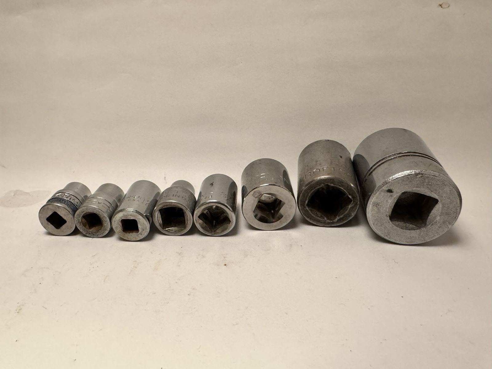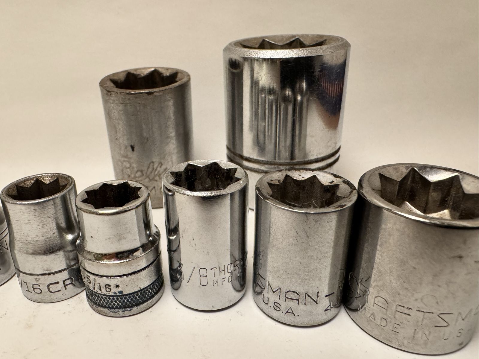 ApplePayMixed set of used condition vintage 3/8” Drive and 1/4” Drive shallow 8 pt sockets. Made in the USA. Includes a 11/16 Williams down to 5/16 Craftsman.