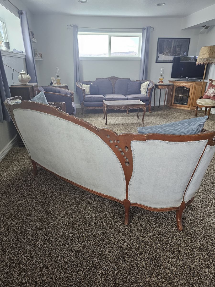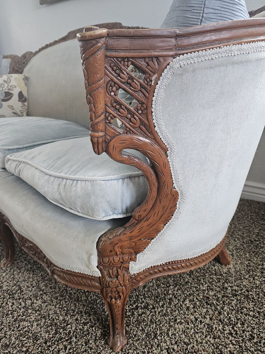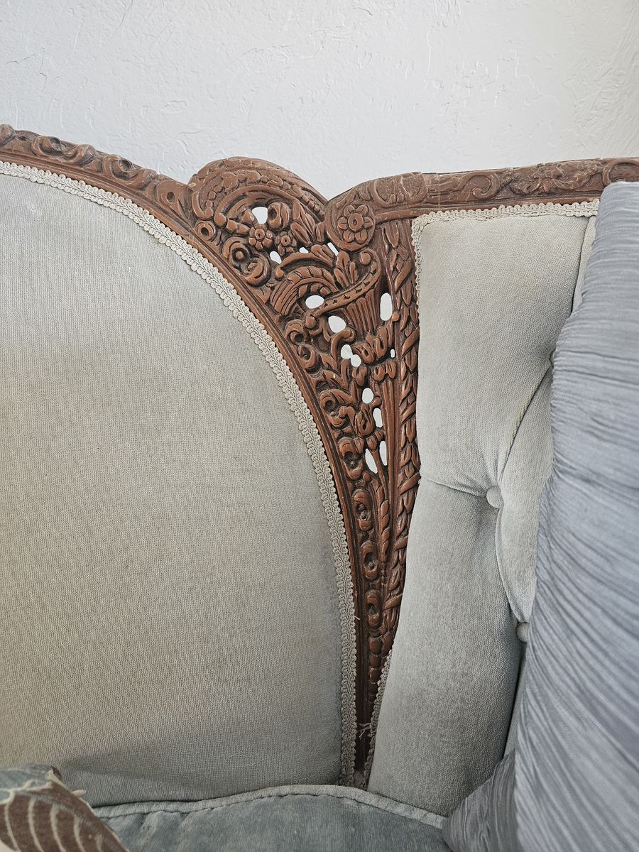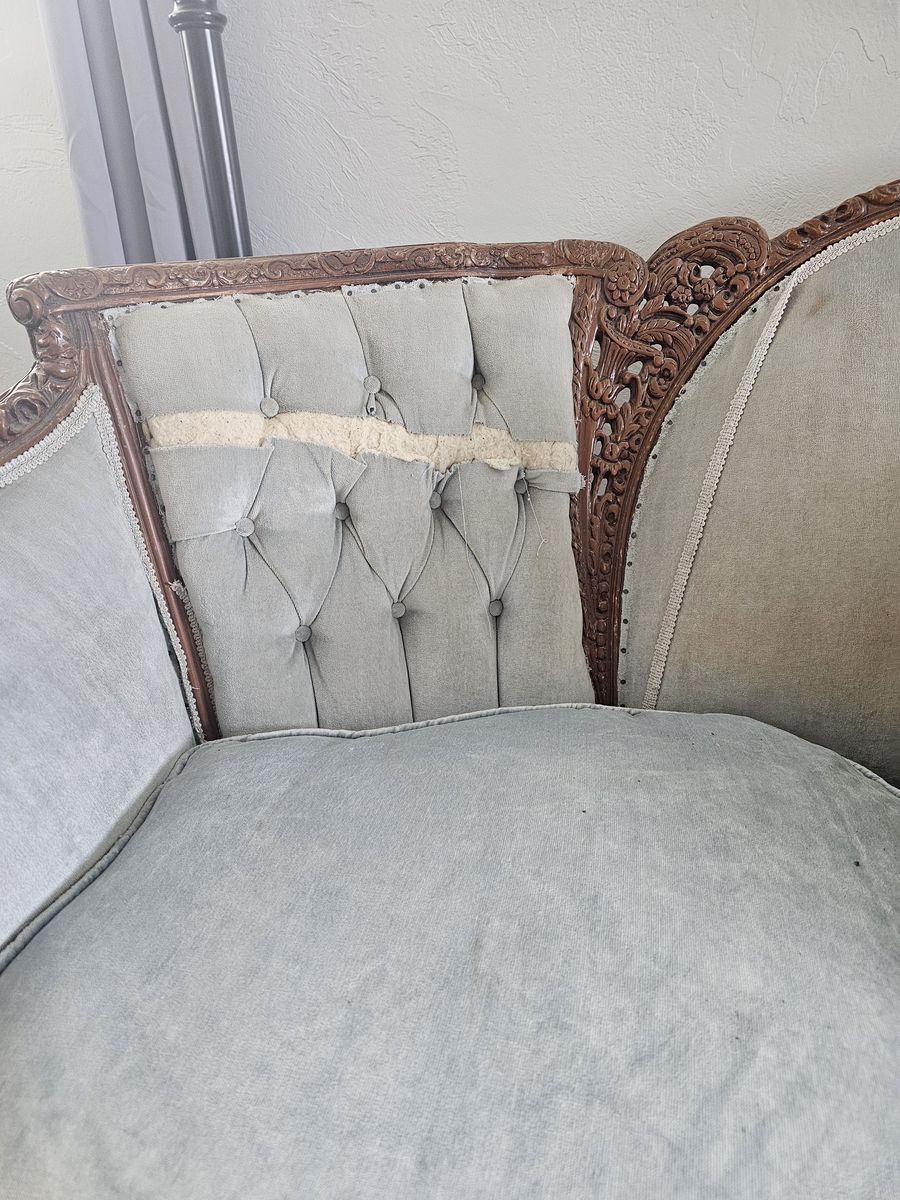 Was told this sofa is early 1900s. It's approx 82" length x 36" width x 36.5" height. Light blue fabric is dirty but in decent shape for it's age although the left top has damage (see photo) from a dog. It is sturdy not wobbly. Selling because I need to cut down on my antiques. $100 OBO. Text is best. Located in Fairview, UT