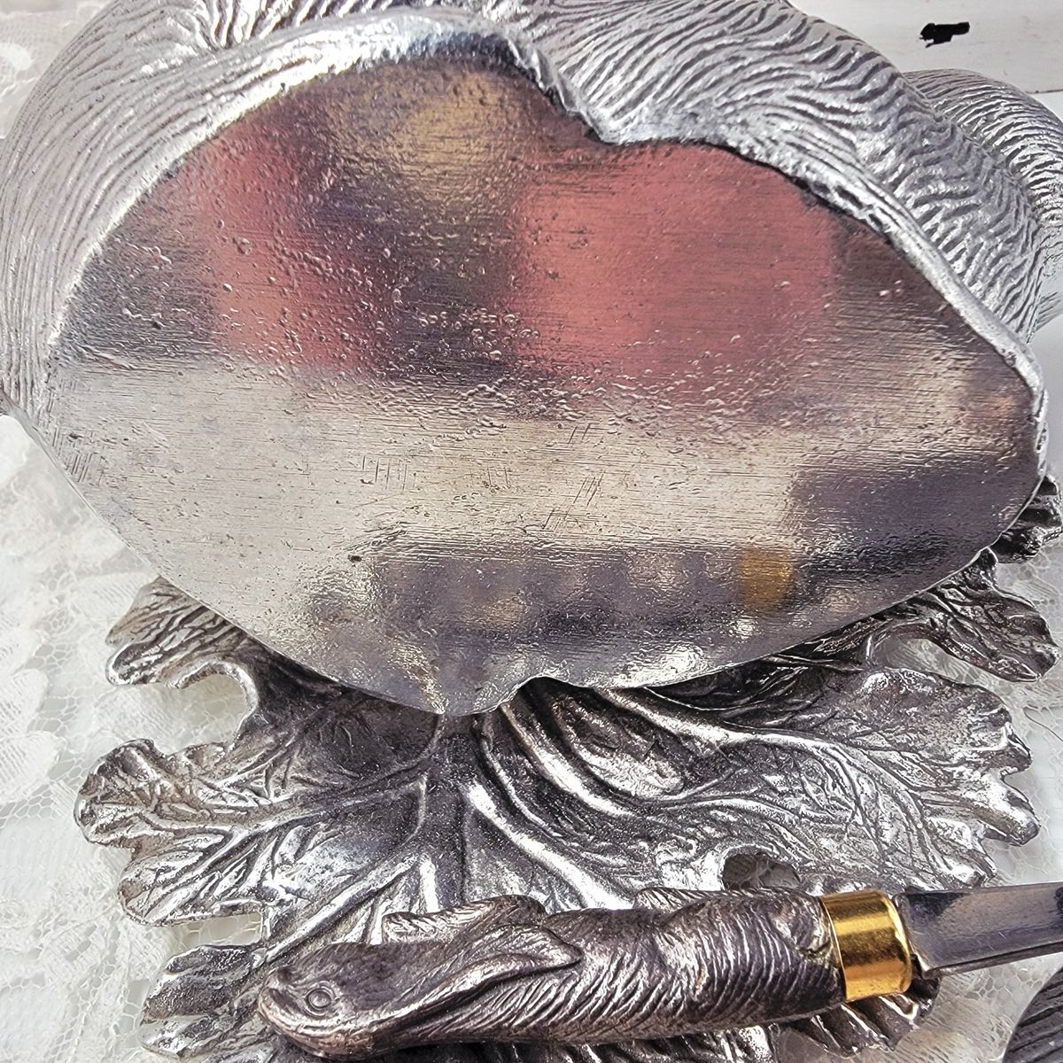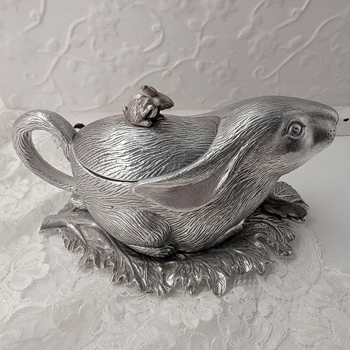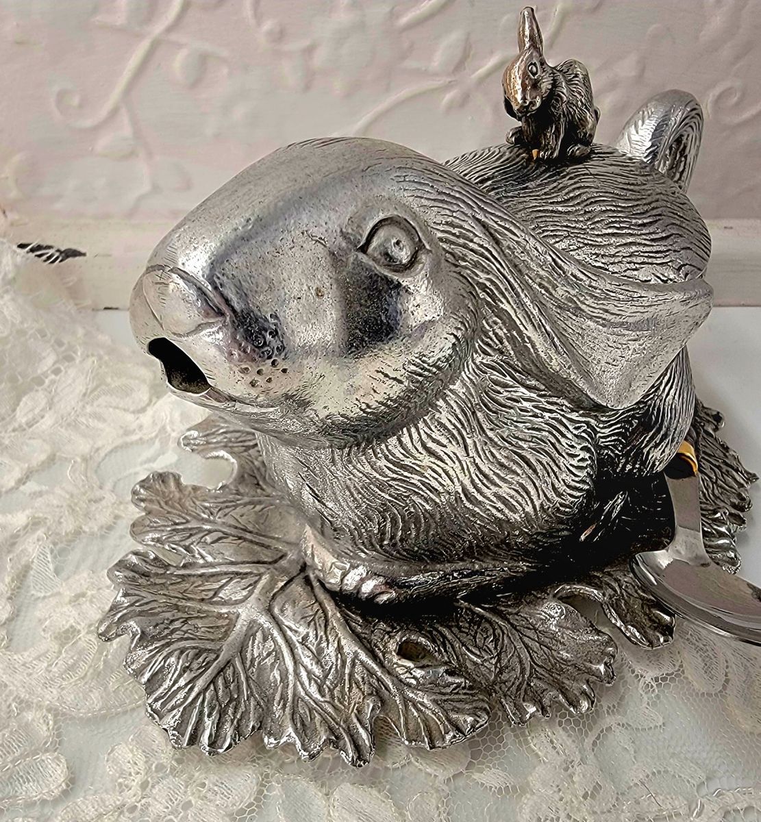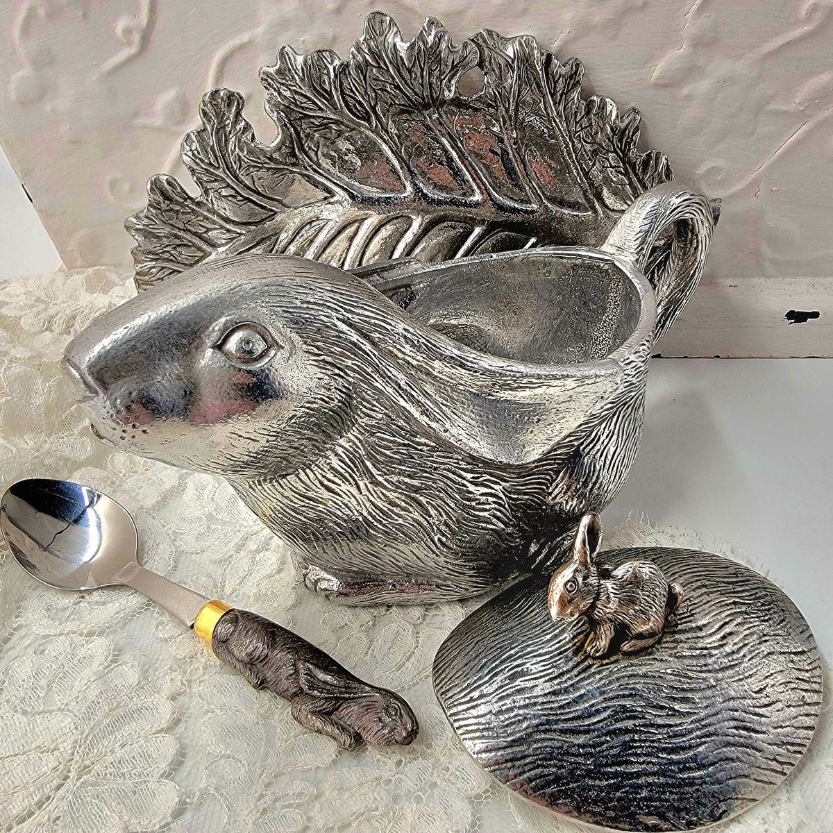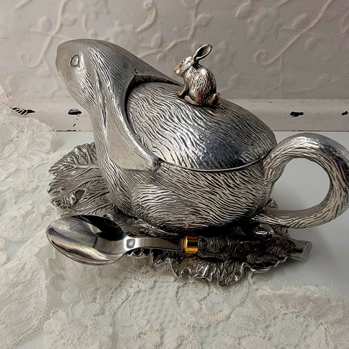 Arthur Court Bunny Rabbit Gravy / Sauce Boat with Lettuce Leaf Shaped Under Plate and Original Bunny Spoon. Vintage 1986. Excellent Like New Condition.