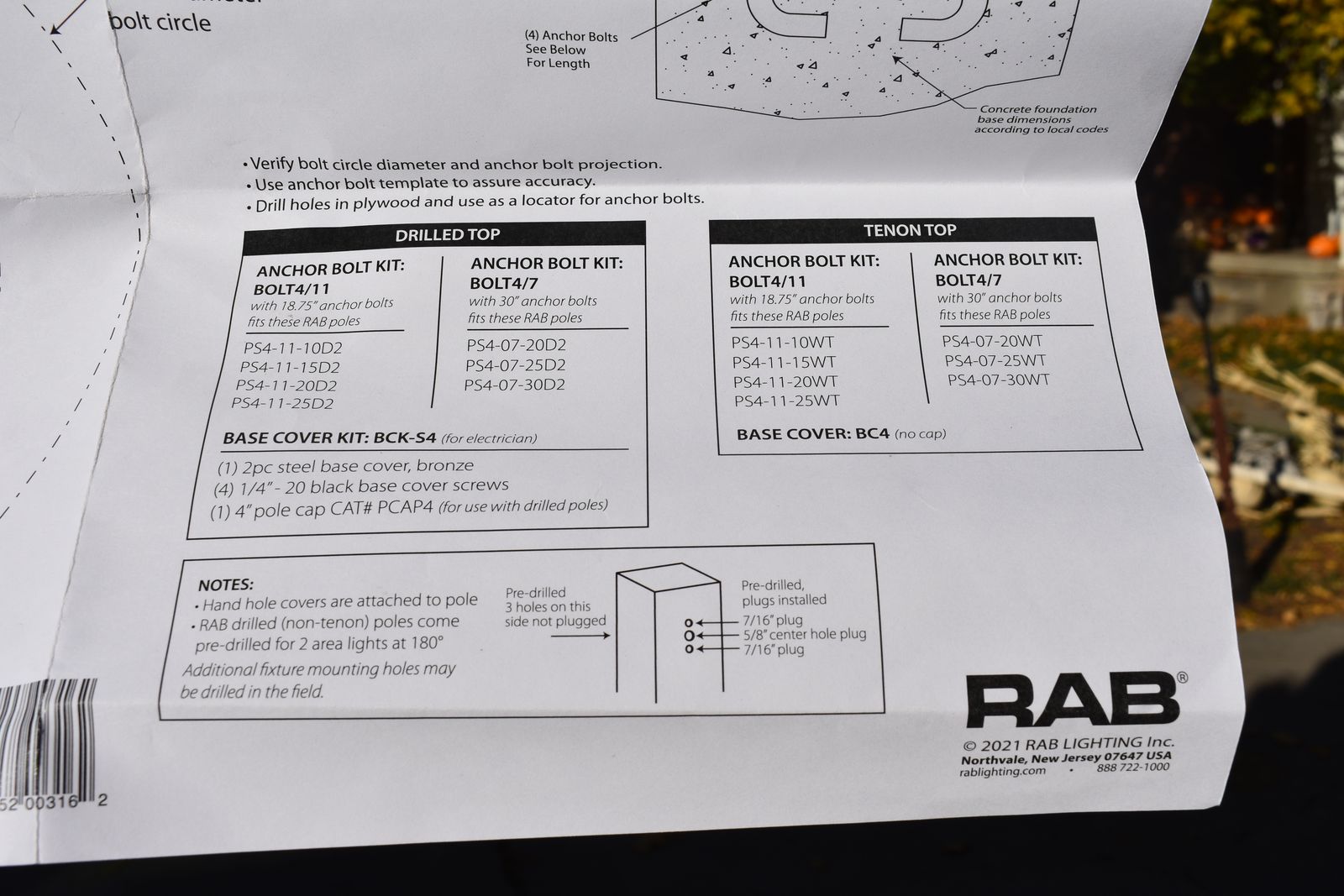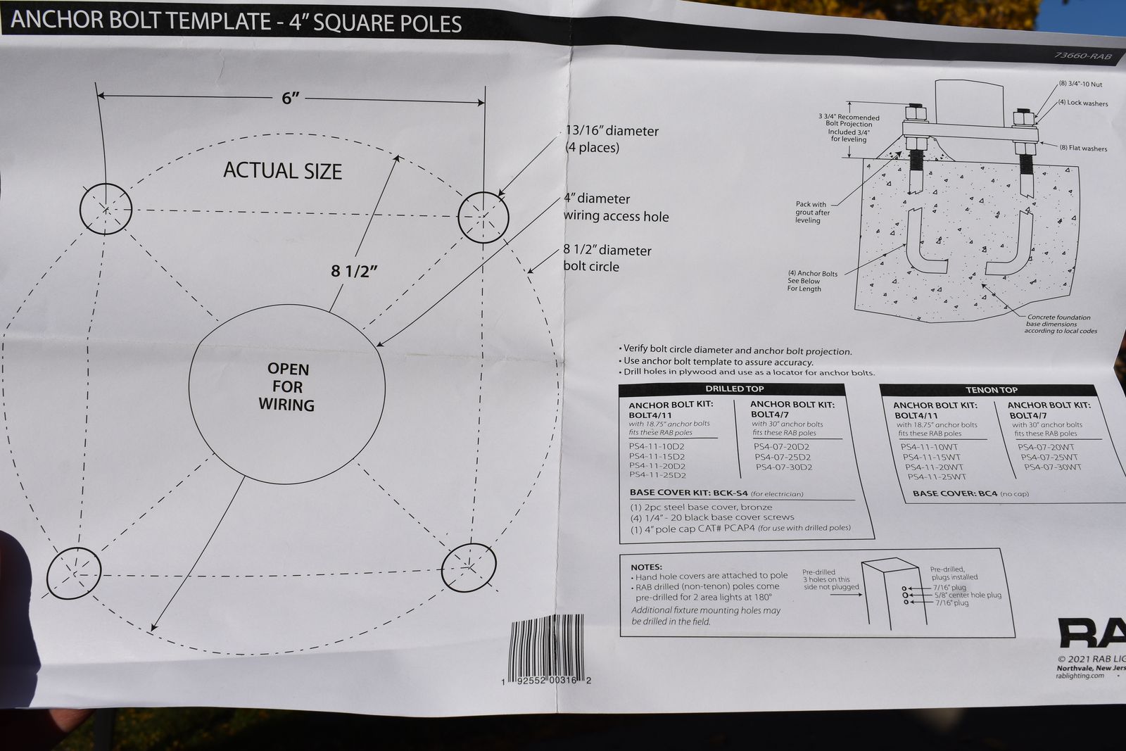 This is a commercial light pole anchor bolt kit with a mounting template—specifically from RAB Lighting for installing 4” square outdoor light poles into a concrete foundation.
