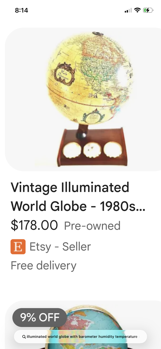 This is a gem. Antique 25 year old illuminated world globe that still has Soviet Union pre-1991. Has weather stations (barometer, humidity, temperature in both Fahrenheit and Celsius ). This is a great price. Must sell. OBO