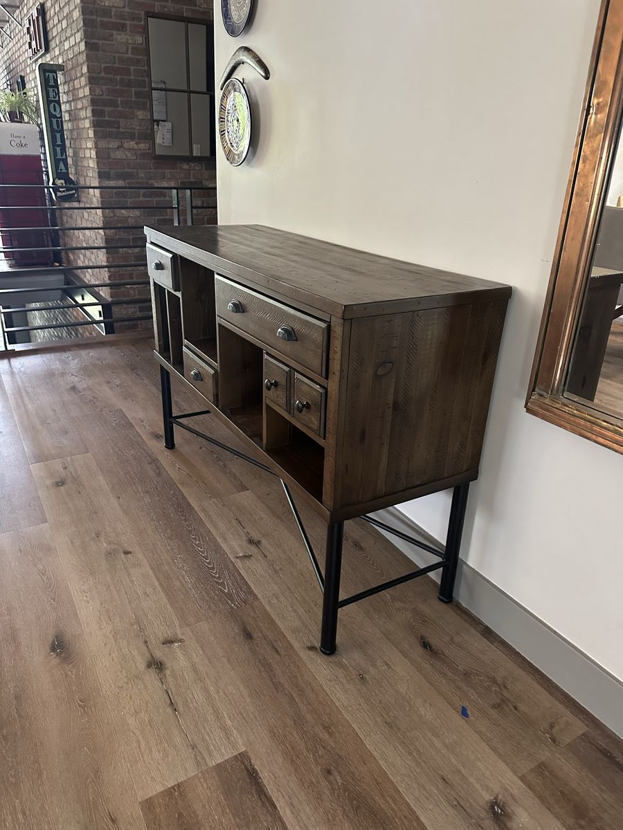 VenmoThis wood and metal side table is about 6 yrs old, is very sturdy, and in excellent condition. It is 36” high, 18” deep, and 52” across.