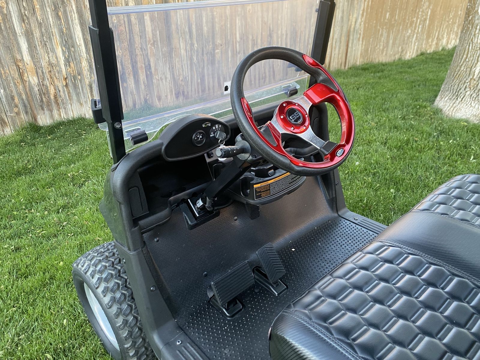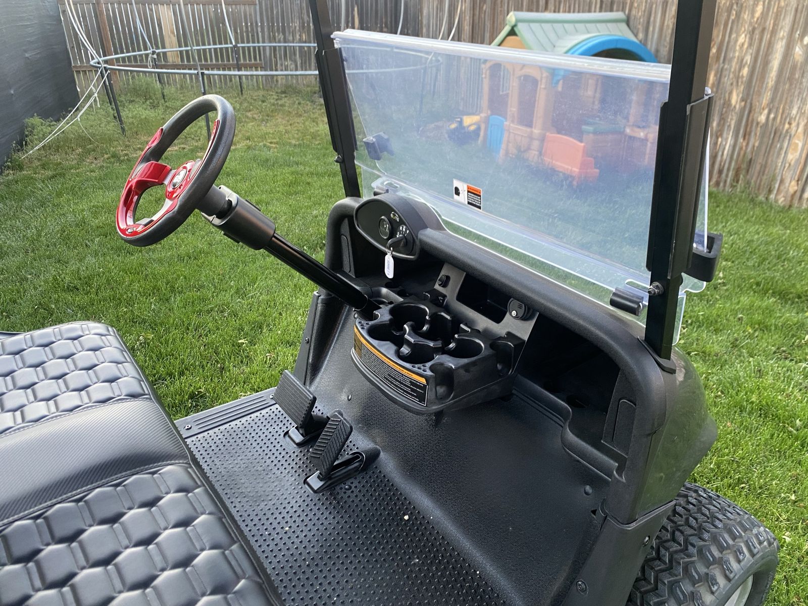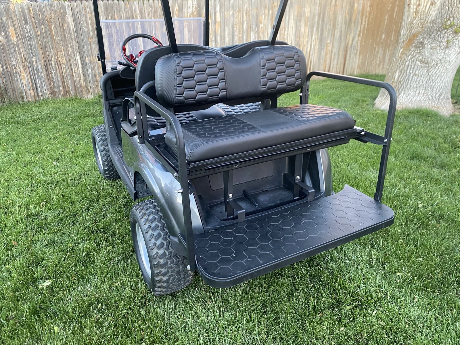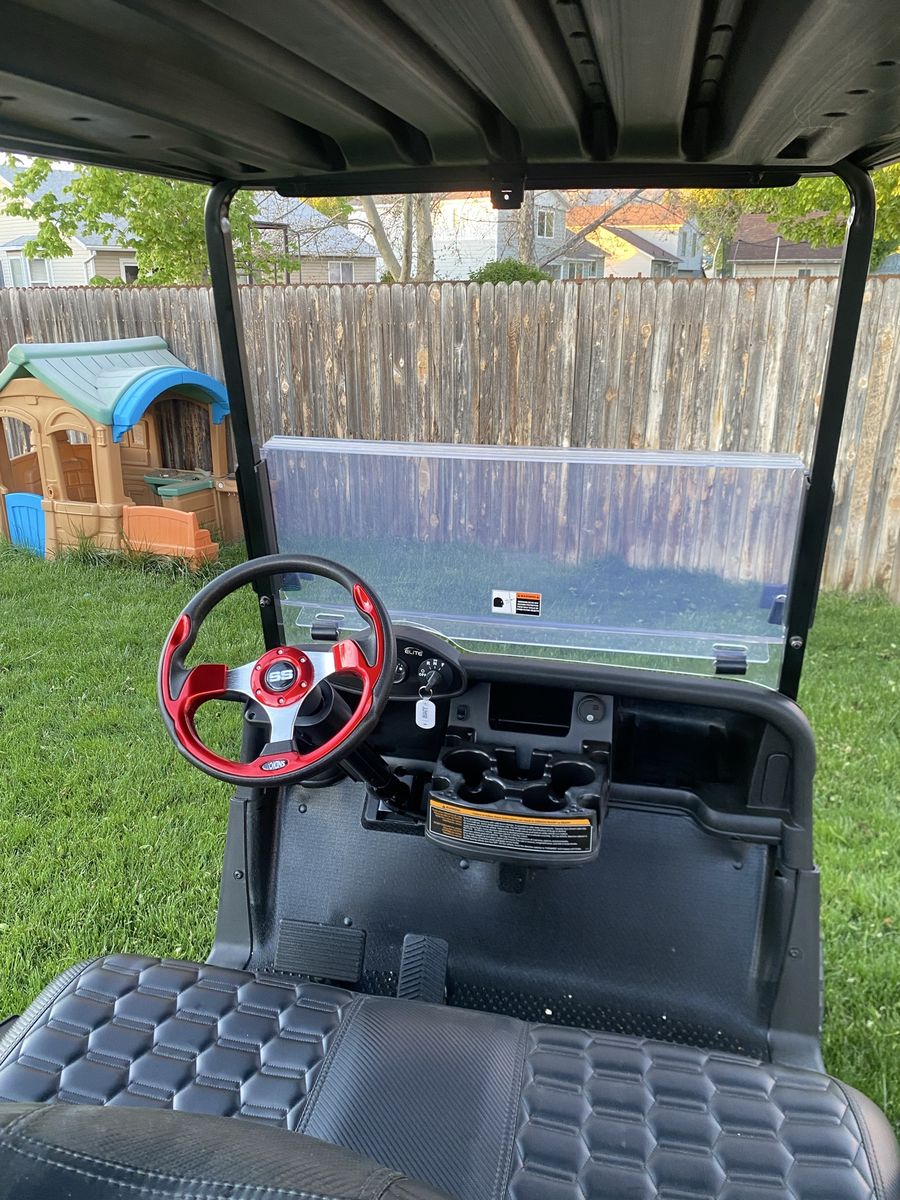 ️ New premium seats & covers ️ New 5” RHOX lift kit ️ 23X10.5 R 12 tires ️ 12” custom wheels w/47mm offset. ️ New EZGO rear folding seat ️ Black roof (ditched the beige for a better look) ️ Folding windshield ️ Heavy-duty rear springs (handles passengers with ease) ️ Custom steering wheel ️ MadJax street-legal light kit (horn, blinkers, hazards) ️ Factory Samsung lithium battery (still under warranty) ️ Fast charger included ️ USB ports in dash ️ Unlocked ECU — runs 26 MPH