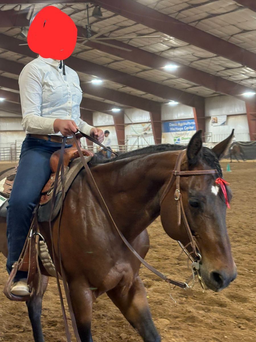Bowie is a 8 year old bay gelding we got out of Texas last year. He is a been there done that horse; been around cattle, ropes, sorts, shown in 4H and has been in our lesson program since the day he got here. He is very level headed and doesn't spook easily. He are pretty sure he is allergic to alfalfa so he has been on grass hay and has held weight well even when worked consistently. He had his teeth floated, fall vaccines and dewormer in November. He currently has a shoulder injury that has limited him from being used in our lesson program and he is currently on stall rest. He has a vet appointment on 4/30 to get rechecked. has shown progress he is one of our favorite or our 20 horses here hate to see him go. willing to trade for other lesson potential horses.