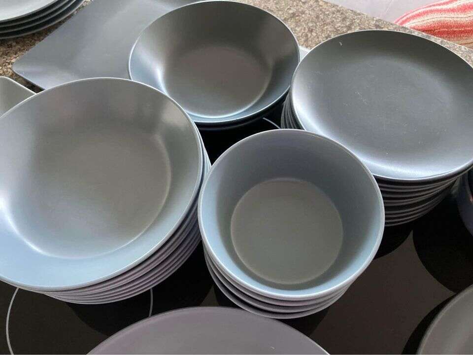 PayPalDiscontinued IKEA large dinner set. Two different shades of gray. Dishes consist of three large serving platters which are 12.75 inches circumference, one has a chip. 10 large salad bowls, measuring 8.75“ x 2“ deep. Eight of these are gray, two are a darker shade of gray. Set of 10 small 8 inch plates, darker shade of gray. There are 5 bowls measuring 5.75“ x 2.5“ five are gray, one is dark gray. There are two rectangle serving trays, measuring 8 x 12. One is gray, one is dark gray. There are 13 plates measuring 10 inches circumference. There are 9 gray plates, 4 dark gray plates, one has a ship. These chips are not broken, but glued back full. More than welcome to come by and take a look. Made in Romania. $195
