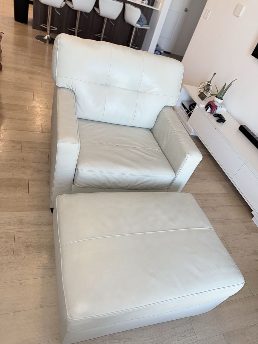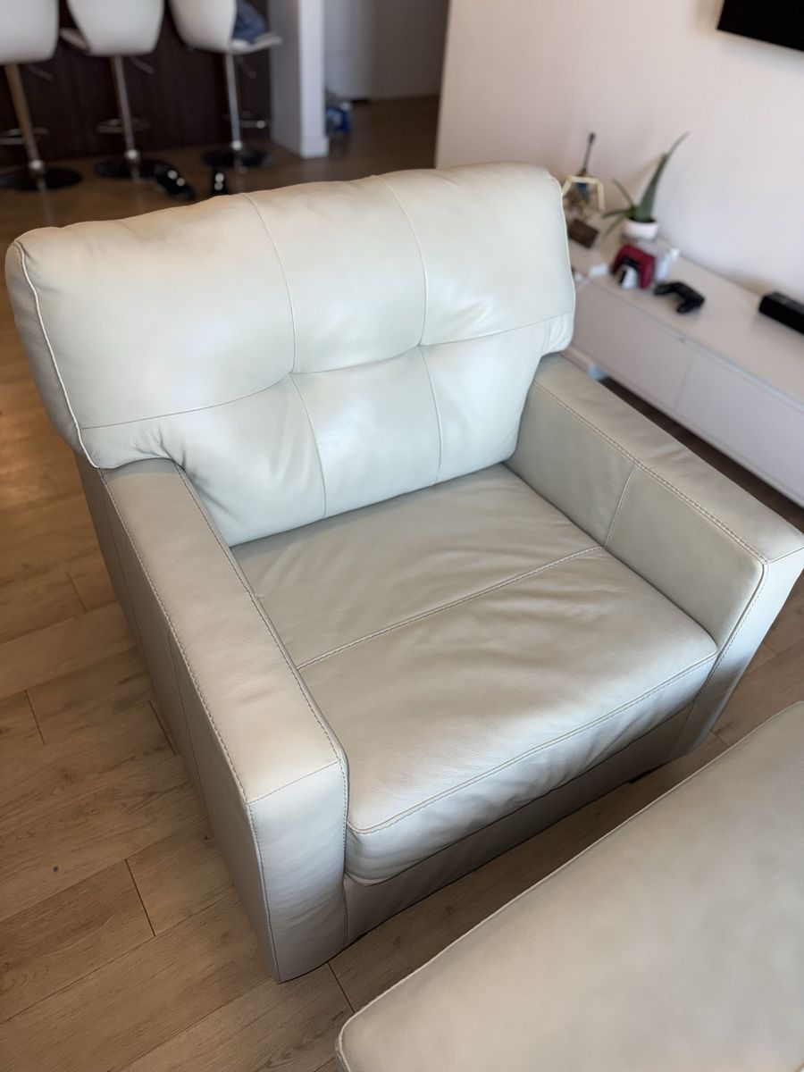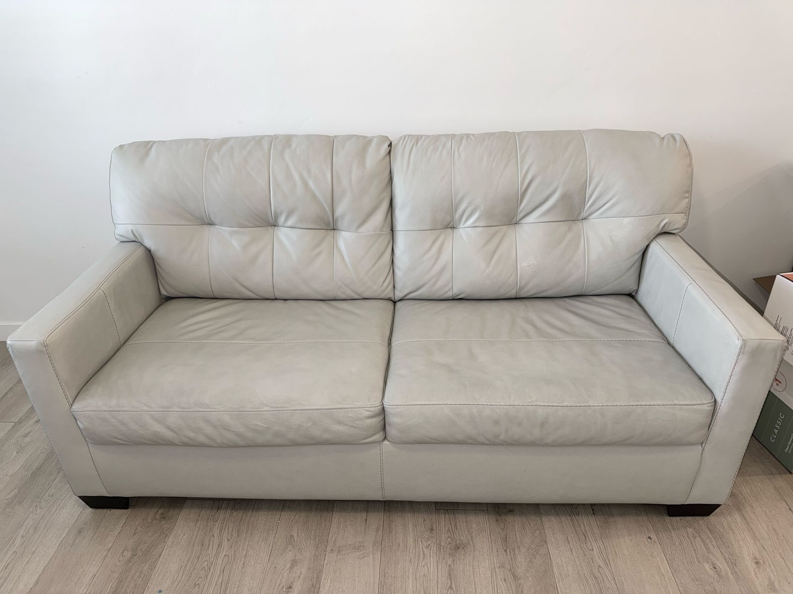 The leather is clean, with no tears, and has been well cared for. Modern light color that fits any space.